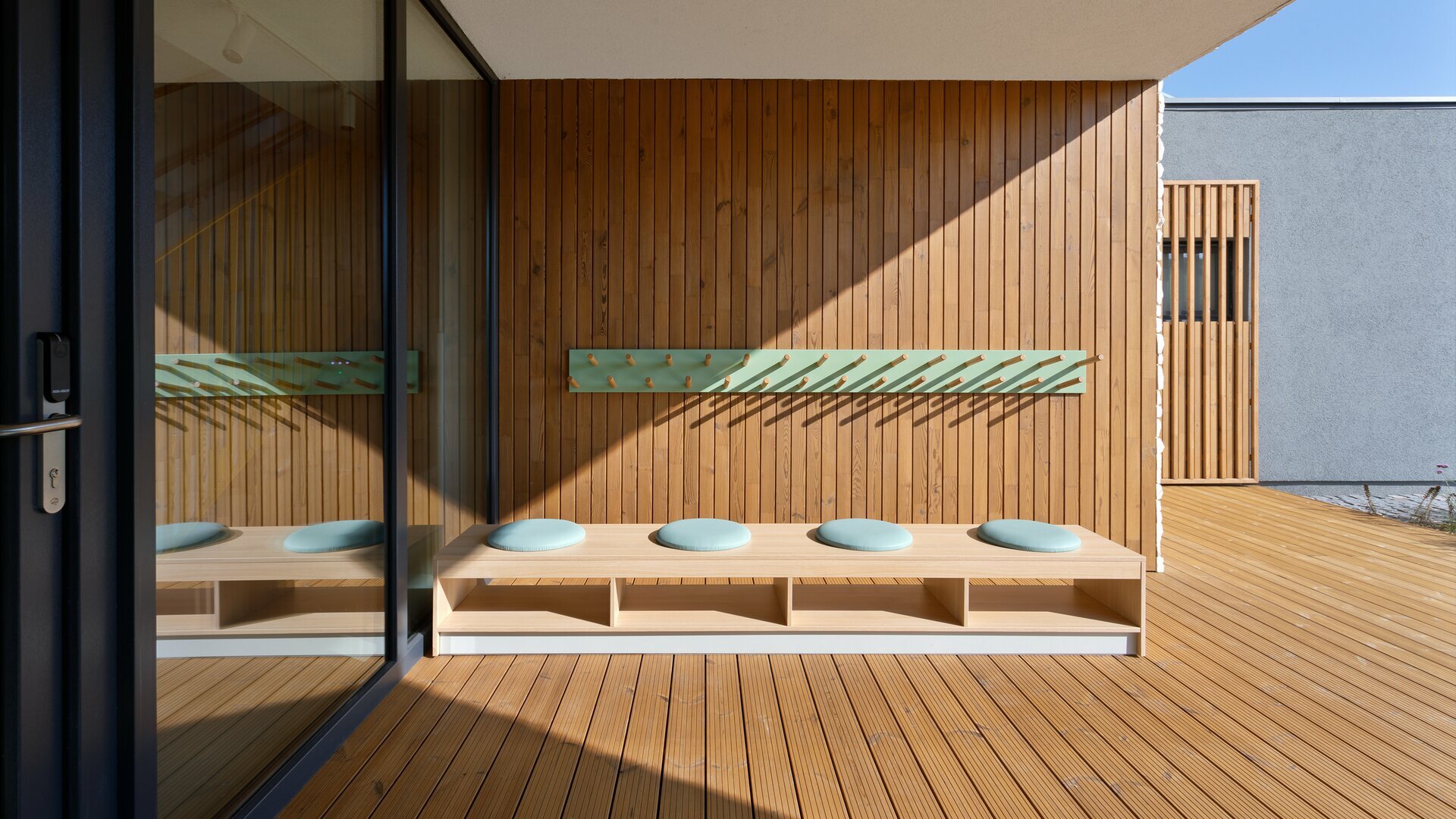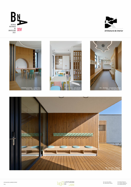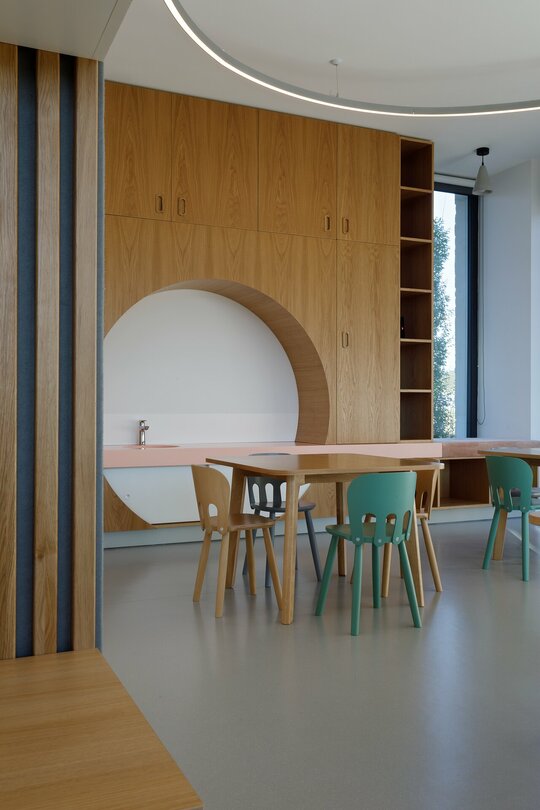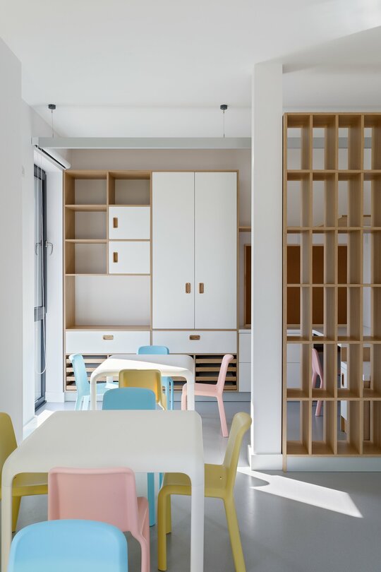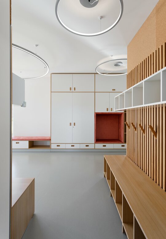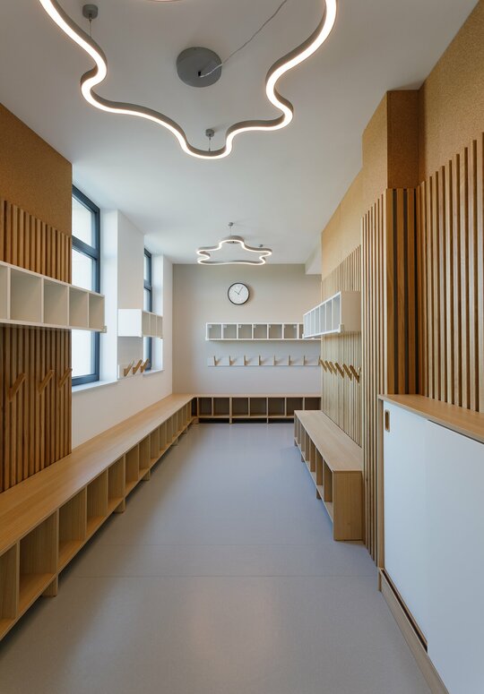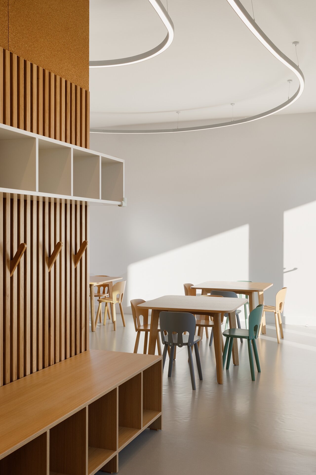 Copiii, materialele, hainele și jucăriile sau cărțile vor fi cele care vor umple spațiul de culoare intrând în contrast cu mobilierul ale cărui elemente structurale – pereți laterali, rafturi, baghetele de suport al cuierelor, au texturi calde, de lemn; iar ușile albe – contribuie la calitatea luminii naturale din spațiul clasei).
