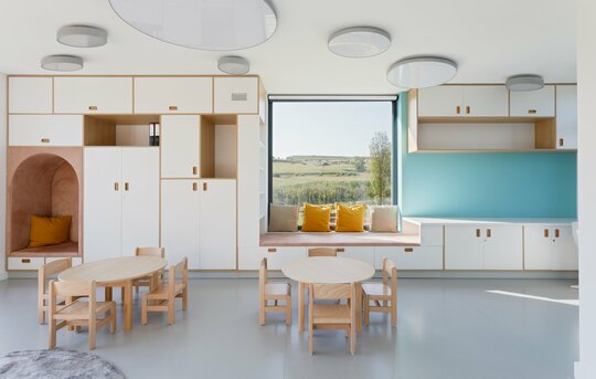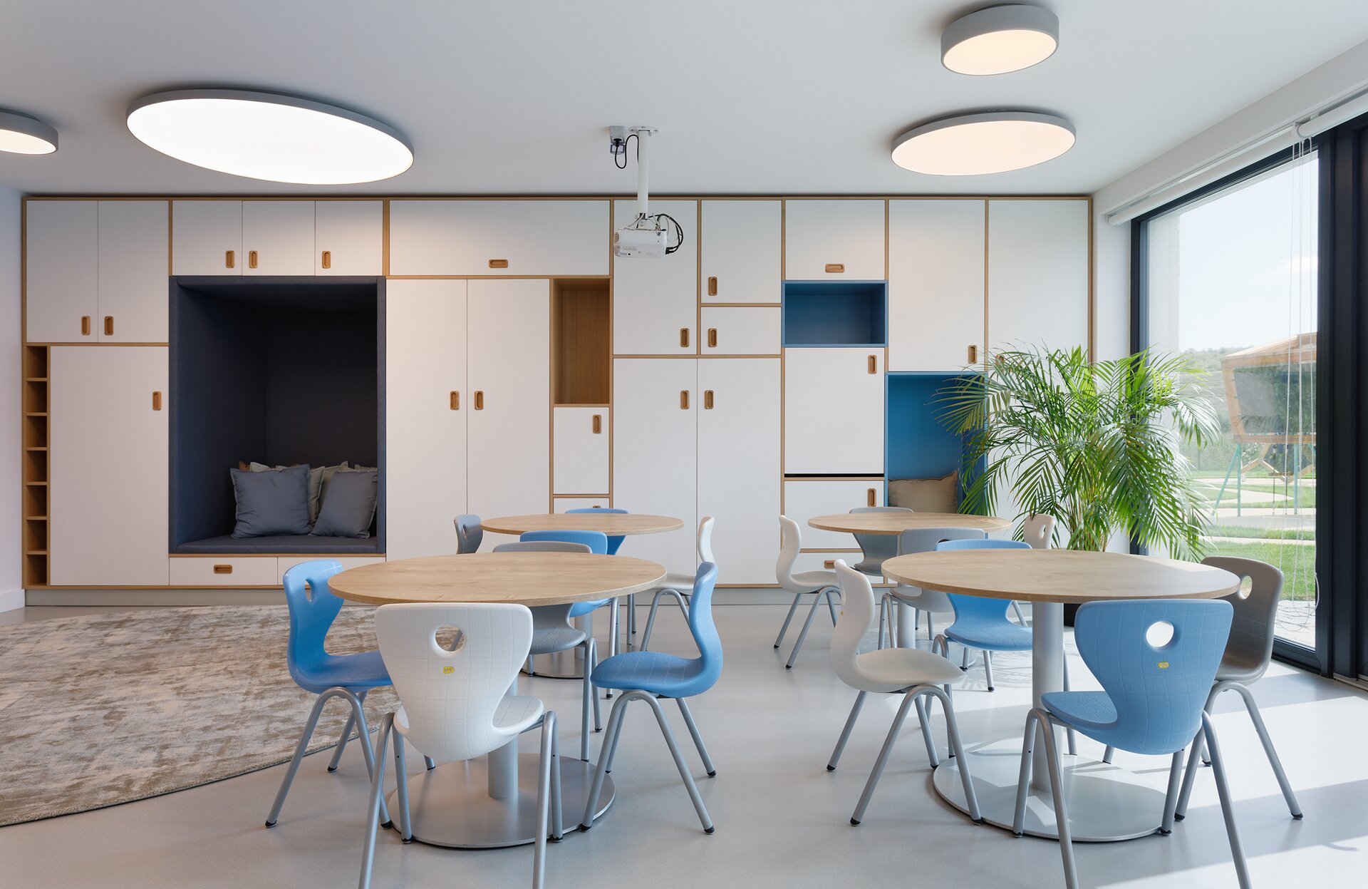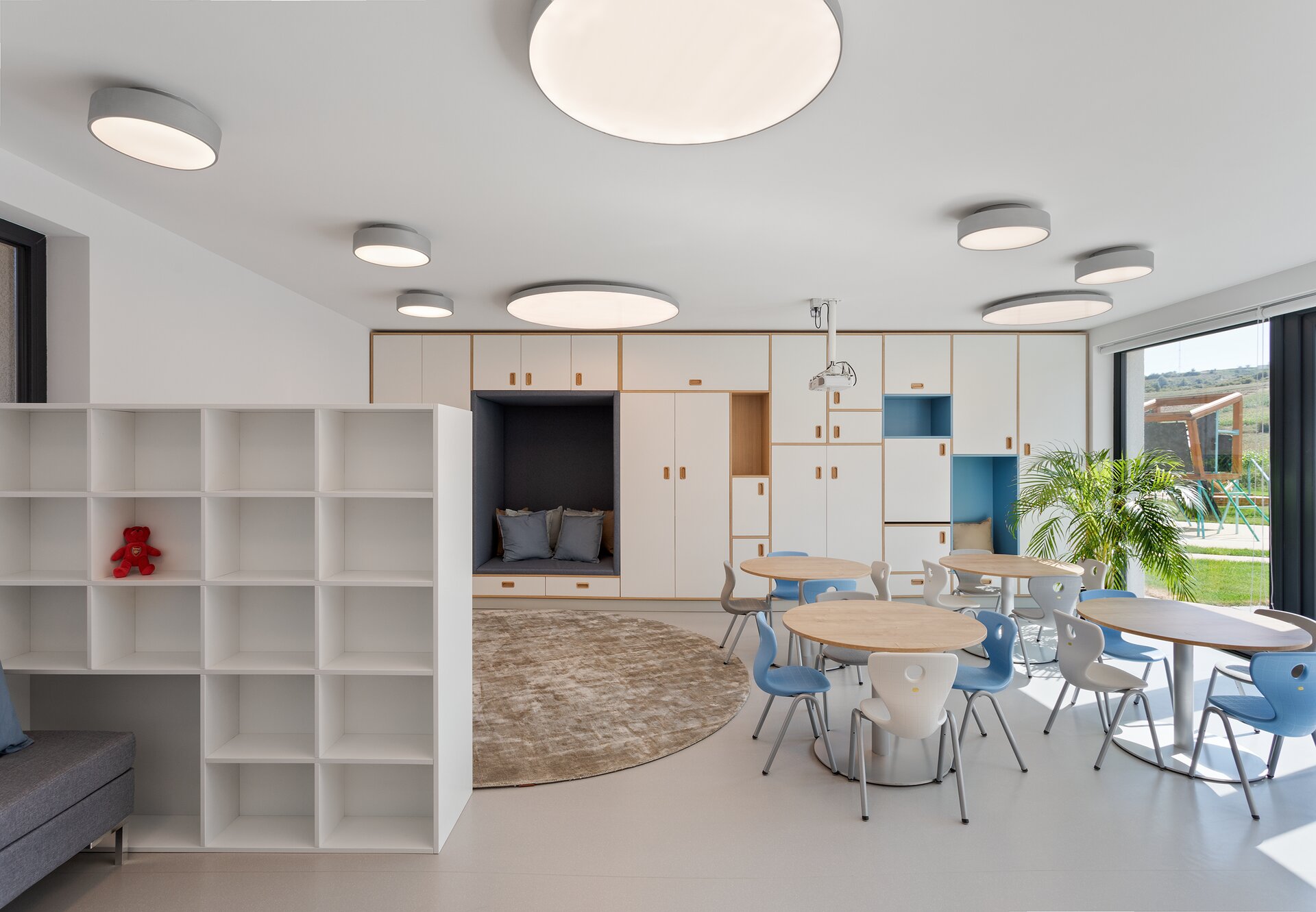 Fiecare perete-depozitare e, de asemenea, organizat pe paliere pentru înălțimea fiecărui utilizator: copii au acces la rafturile inferioare, profesorii la cele medii, iar cele de sus devin depozitarea ocazională. Organizarea funcțională a spațiilor educaționale este reflectată și susținută de sistemul de iluminat – constelație.