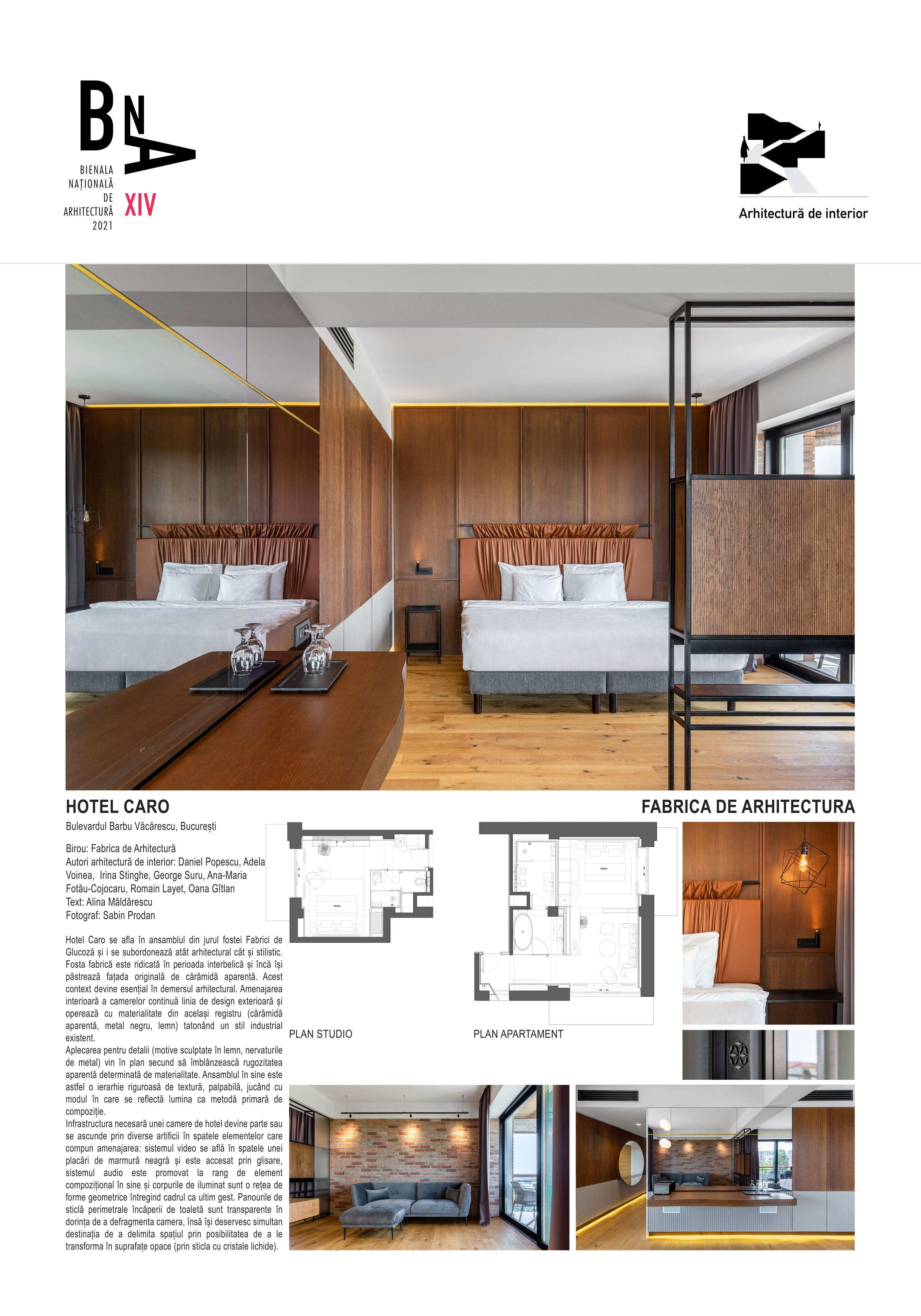Hotel Caro se afla în ansamblul din jurul fostei Fabrici de Glucoză și i se subordonează atât arhitectural cât și stilistic. Fosta fabrică este ridicată în perioada interbelică și încă își păstrează fațada originală de cărămidă aparentă. Acest context devine esențial în demersul arhitectural. Amenajarea interioară a camerelor continuă linia de design exterioară și operează cu materialitate din același registru (cărămidă aparentă, metal negru, lemn) tatonând un stil industrial existent.