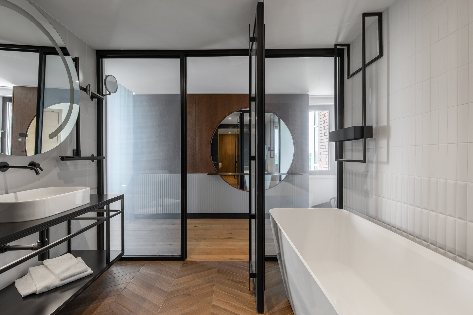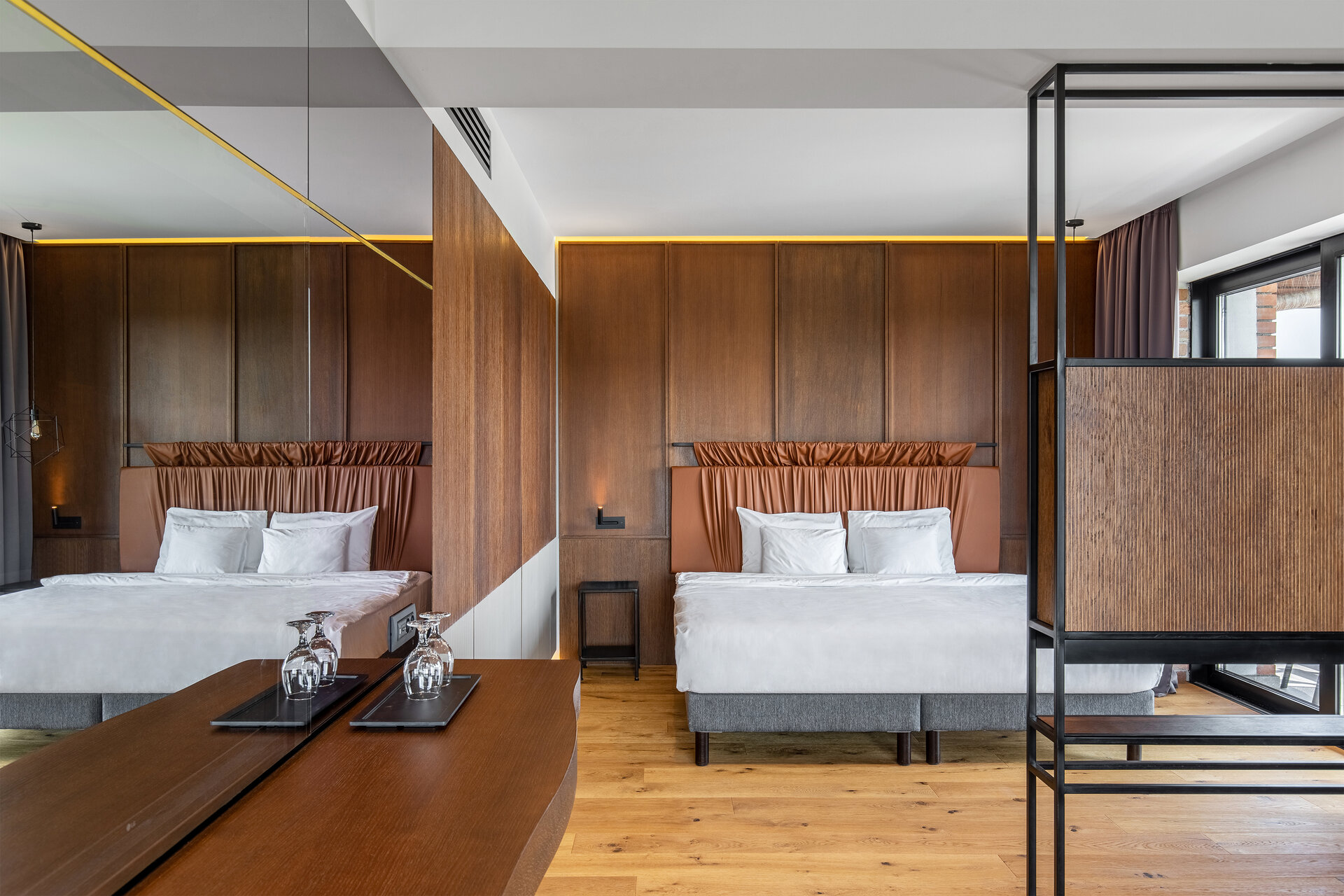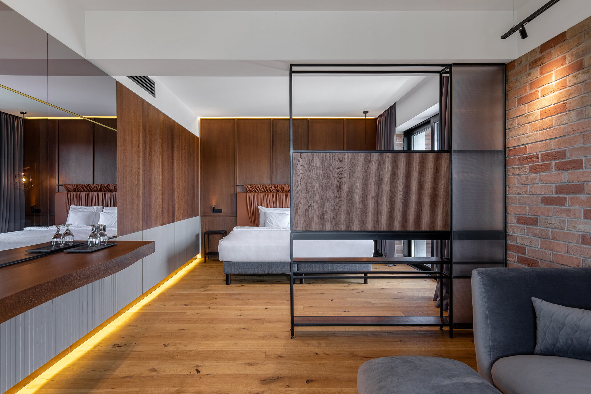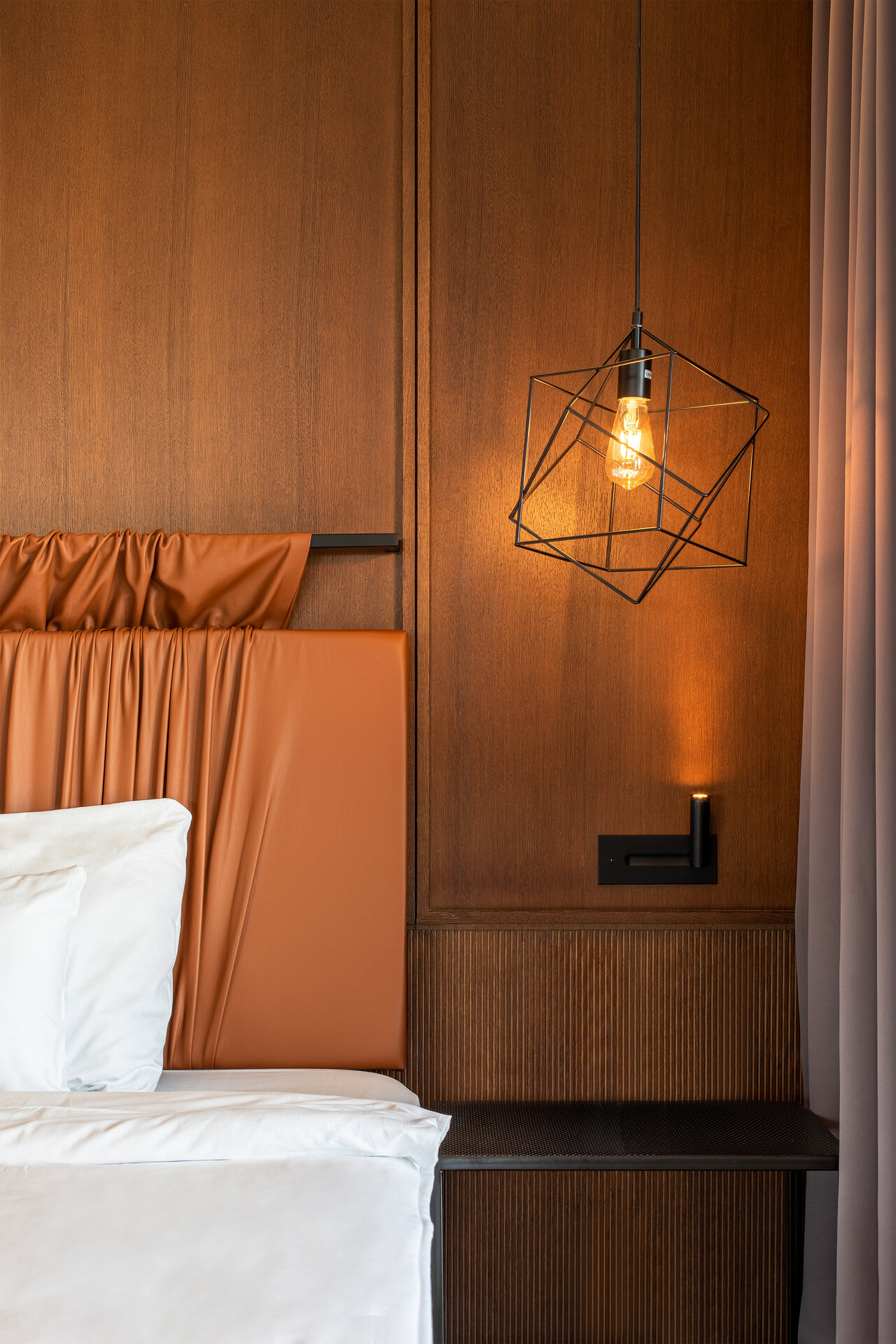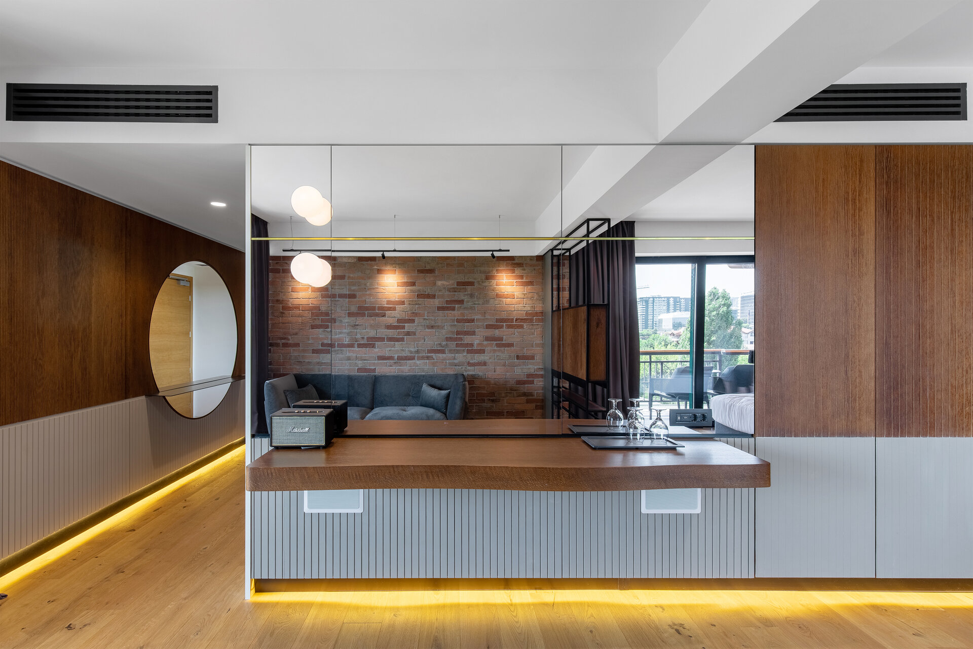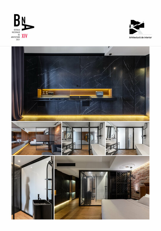 Infrastructura necesară unei camere de hotel devine parte sau se ascunde prin diverse artificii în spatele elementelor care compun amenajarea: sistemul video se află în spatele unei placări de marmură neagră și este accesat prin glisare, sistemul audio este promovat la rang de element compozițional în sine și corpurile de iluminat sunt o rețea de forme geometrice întregind cadrul ca ultim gest. Panourile de sticlă perimetrale încăperii de toaletă sunt transparente în dorința de a defragmenta camera, însă își deservesc simultan destinația de a delimita spațiul prin posibilitatea de a le transforma în suprafațe opace (prin sticla cu cristale lichide).