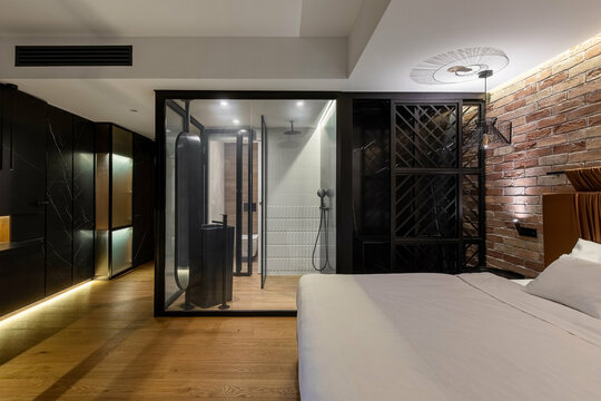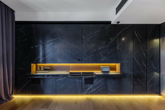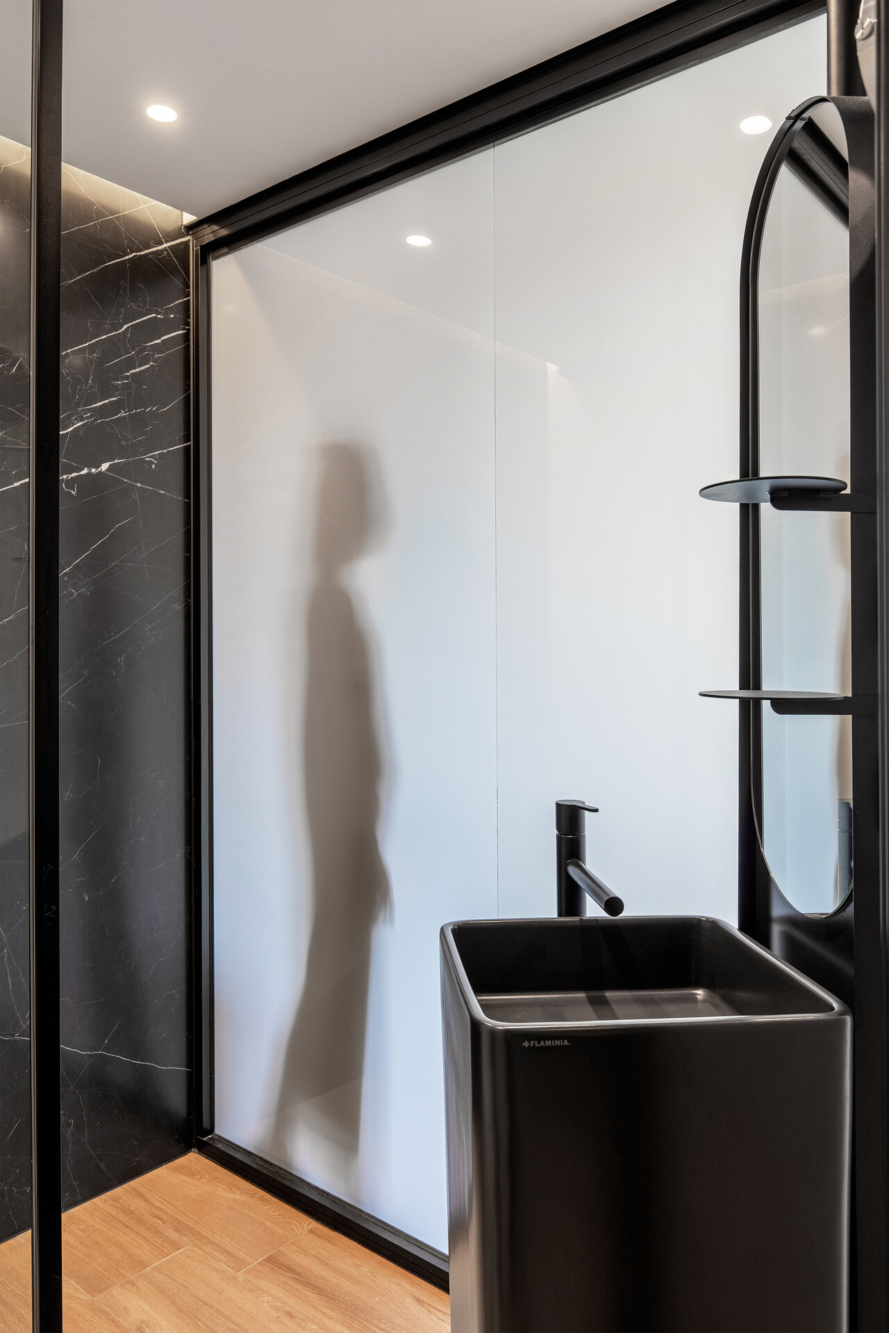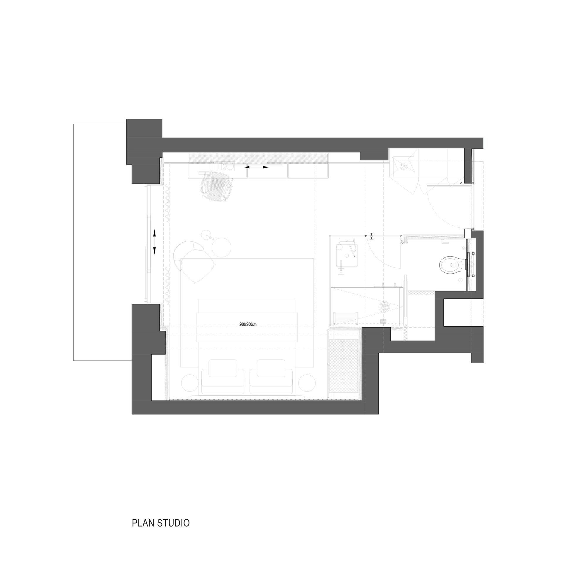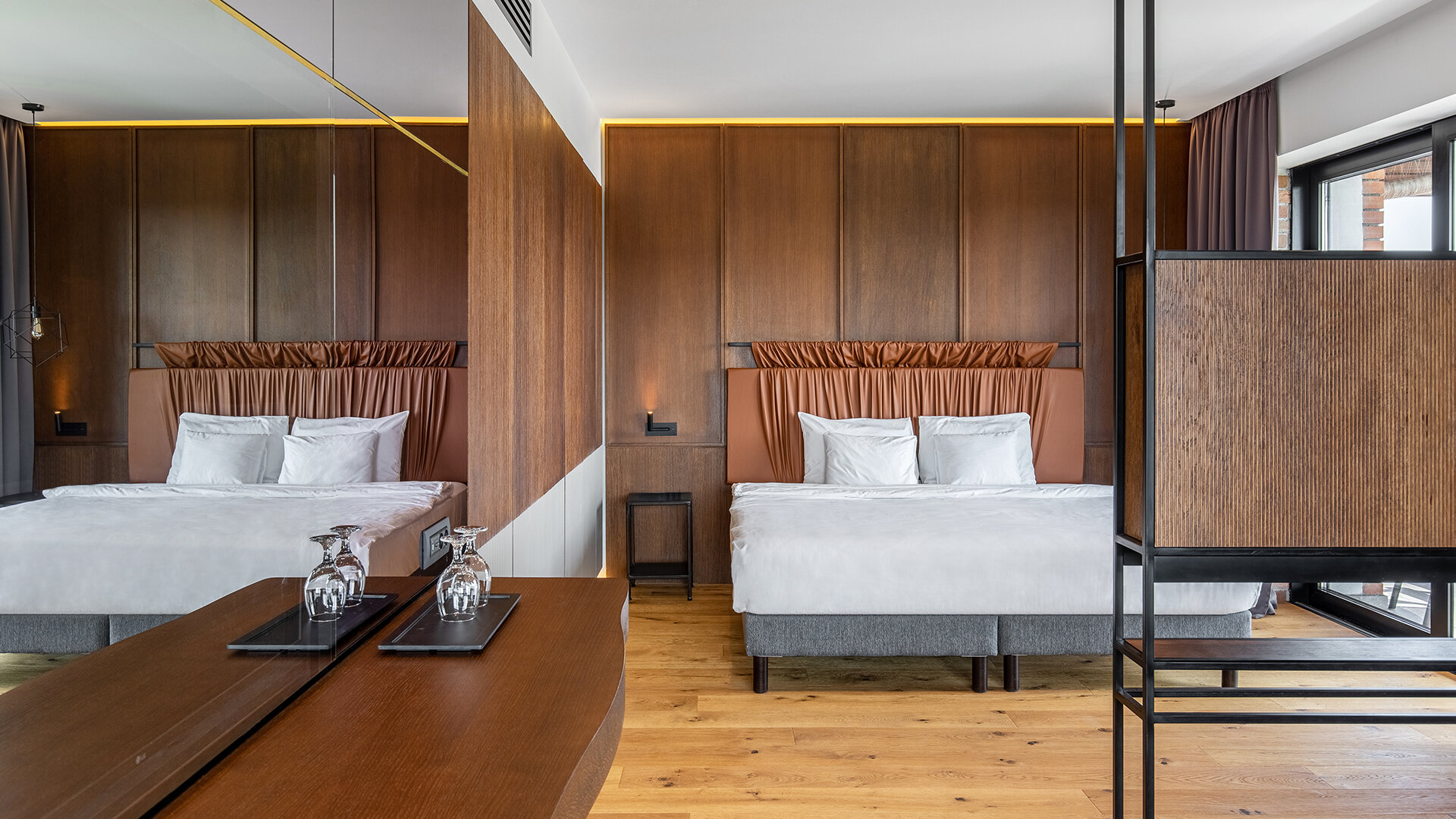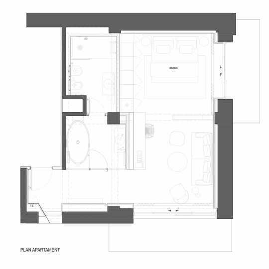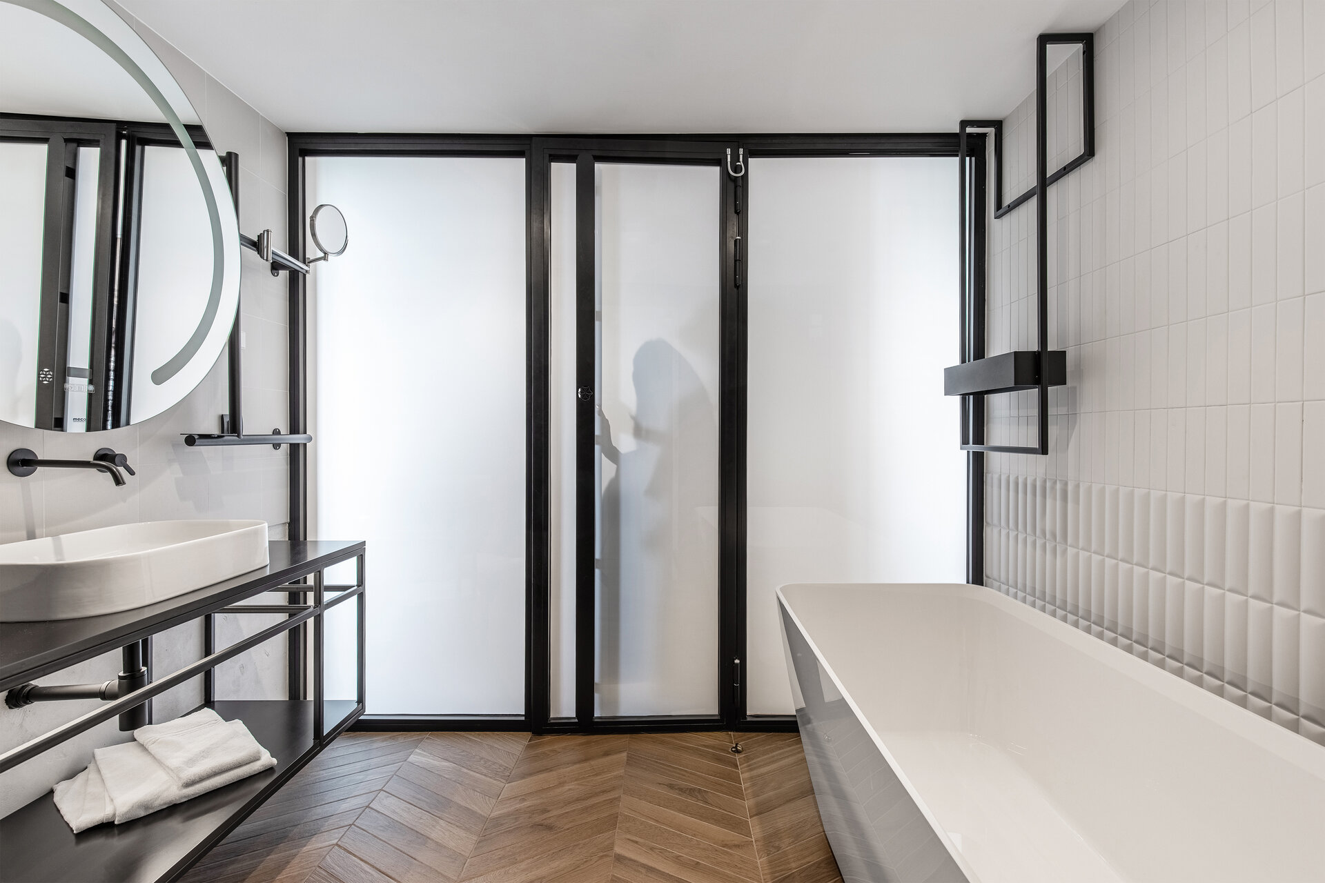 Infrastructura necesară unei camere de hotel devine parte sau se ascunde prin diverse artificii în spatele elementelor care compun amenajarea: sistemul video se află în spatele unei placări de marmură neagră și este accesat prin glisare, sistemul audio este promovat la rang de element compozițional în sine și corpurile de iluminat sunt o rețea de forme geometrice întregind cadrul ca ultim gest. Panourile de sticlă perimetrale încăperii de toaletă sunt transparente în dorința de a defragmenta camera, însă își deservesc simultan destinația de a delimita spațiul prin posibilitatea de a le transforma în suprafațe opace (prin sticla cu cristale lichide).