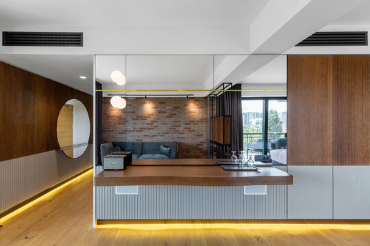 Aplecarea pentru detalii (motive sculptate în lemn, nervaturile de metal) vin în plan secund să îmblânzească rugozitatea aparentă determinată de materialitate. Ansamblul în sine este astfel o ierarhie riguroasă de textură, palpabilă, jucând cu modul în care se reflectă lumina ca metodă primară de compoziție.