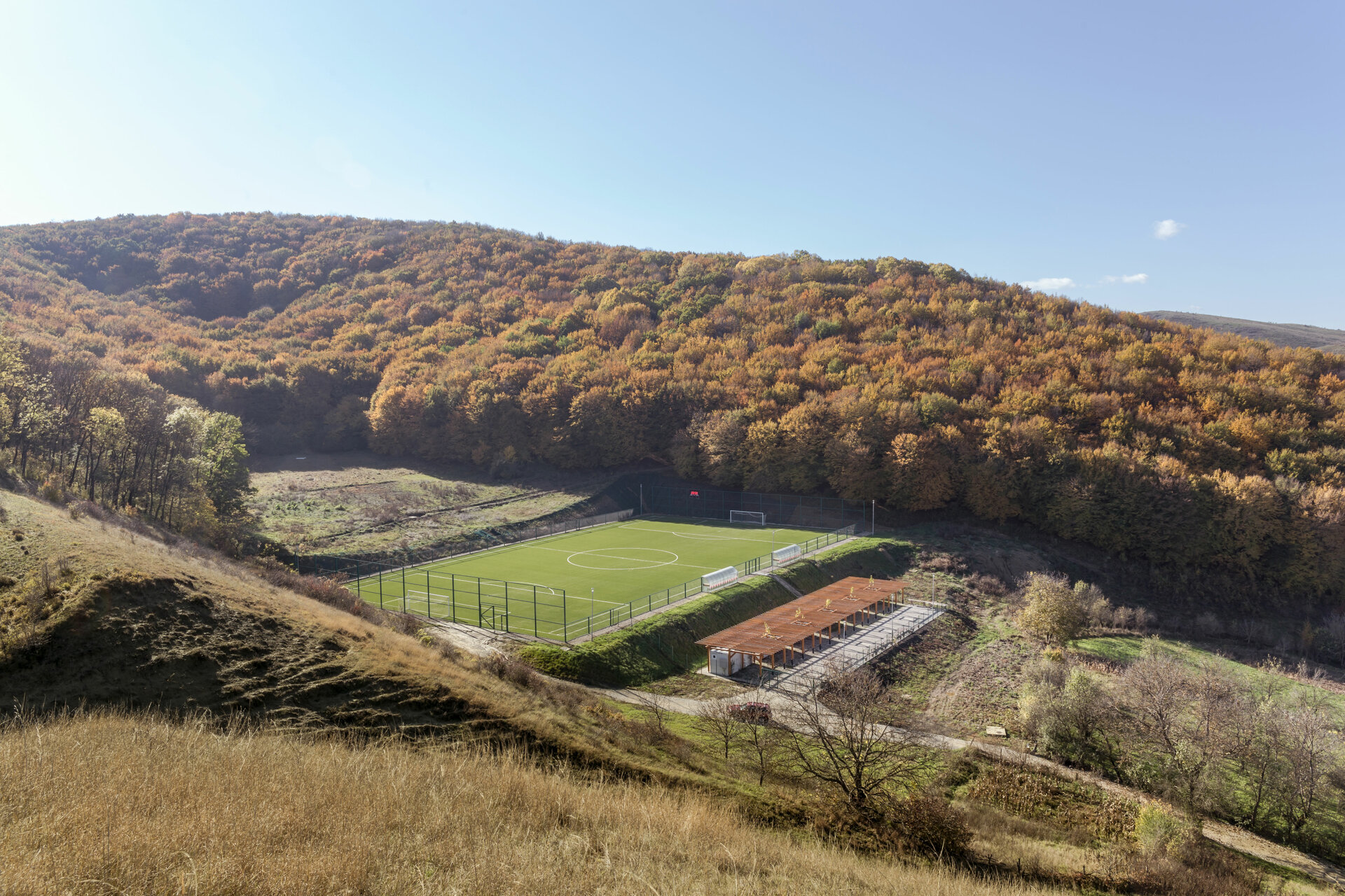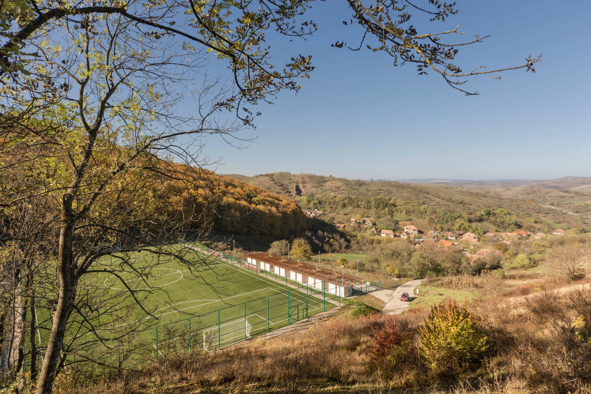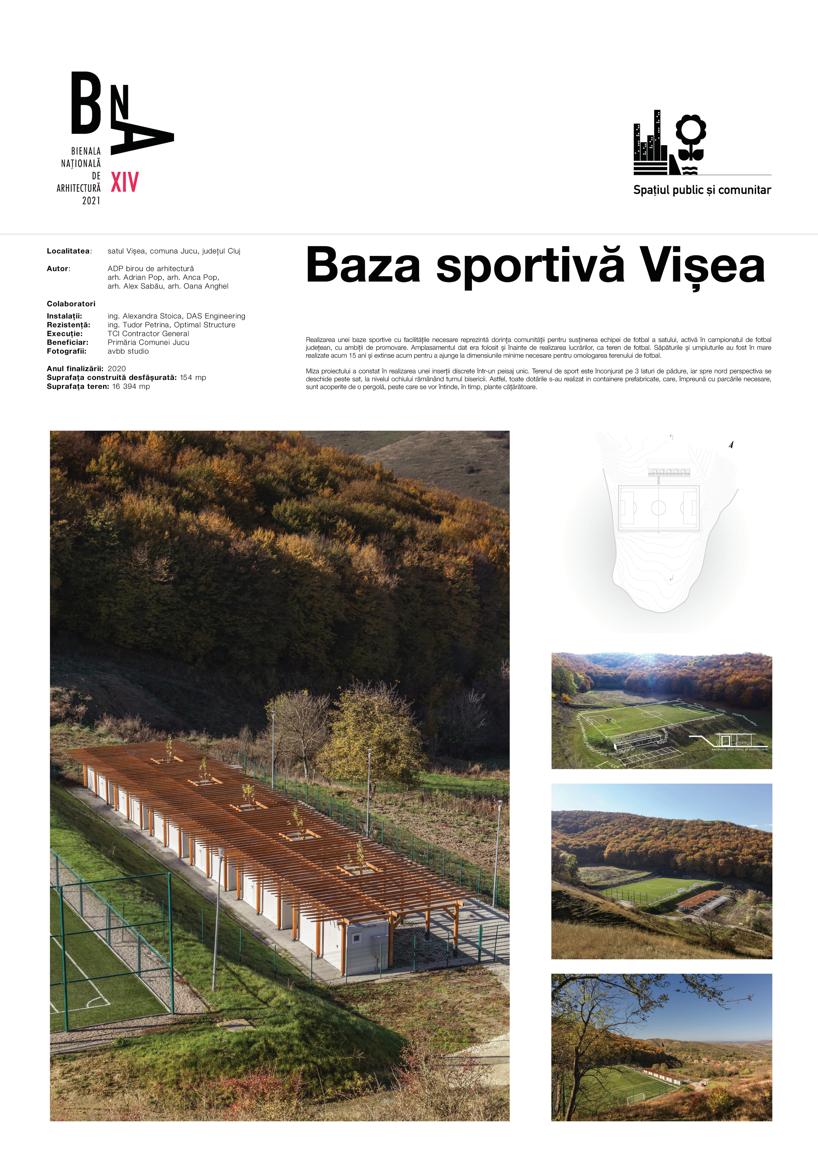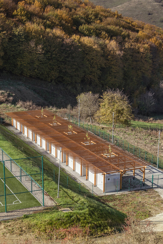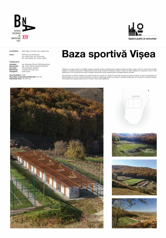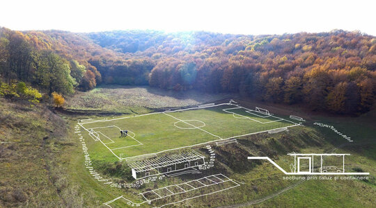 Miza proiectului a constat în realizarea unei inserții discrete într-un peisaj unic. Terenul de sport este înconjurat pe 3 laturi de pădure, iar spre nord perspectiva se deschide peste sat, la nivelul ochiului rămânând turnul bisericii. Astfel, toate dotările s-au realizat in containere prefabricate, care, împreună cu parcările necesare, sunt acoperite de o pergolă, peste care se vor întinde, în timp, plante cățărătoare.