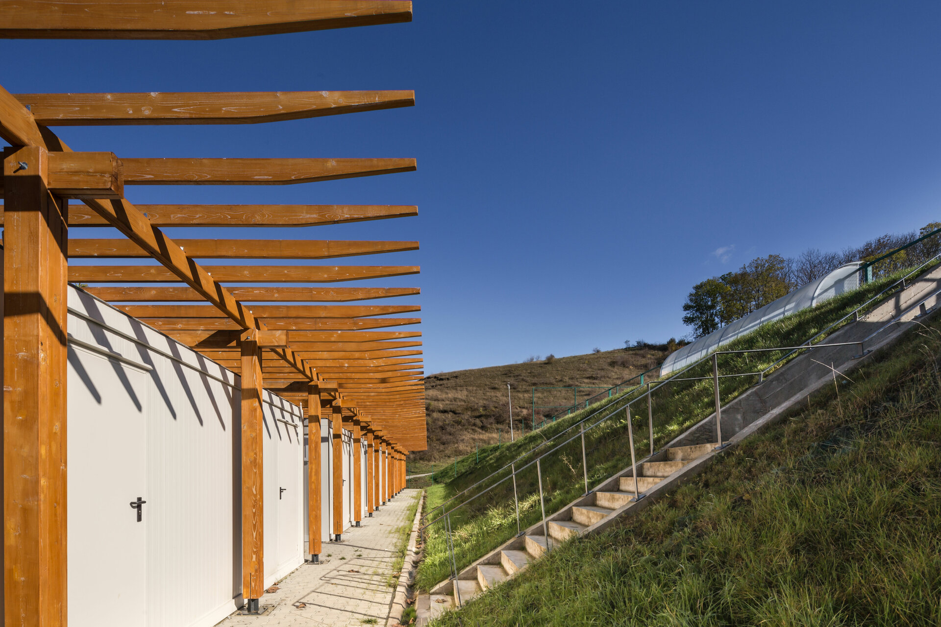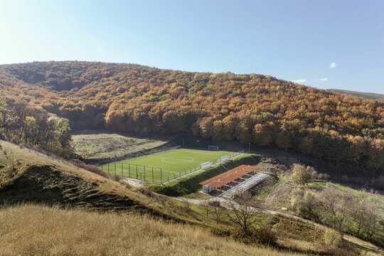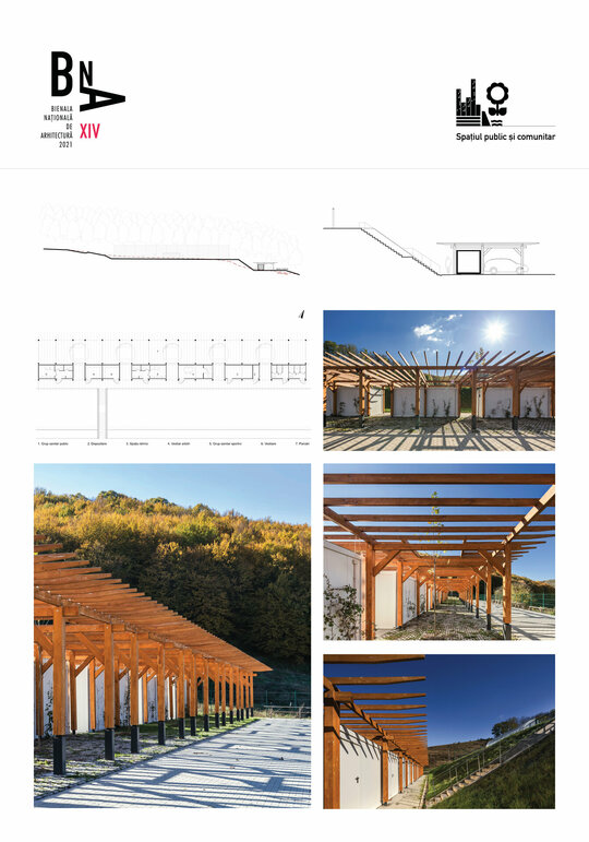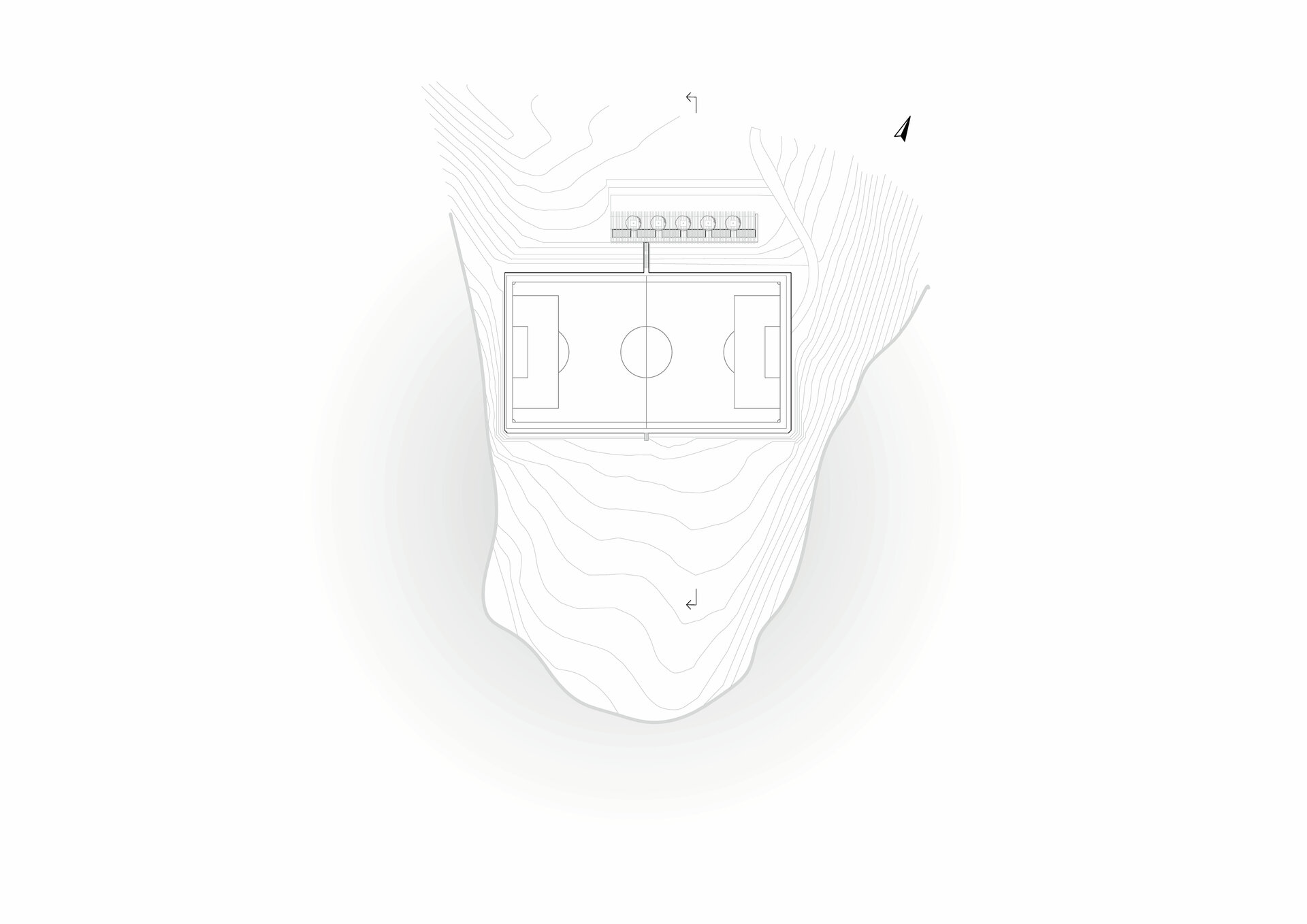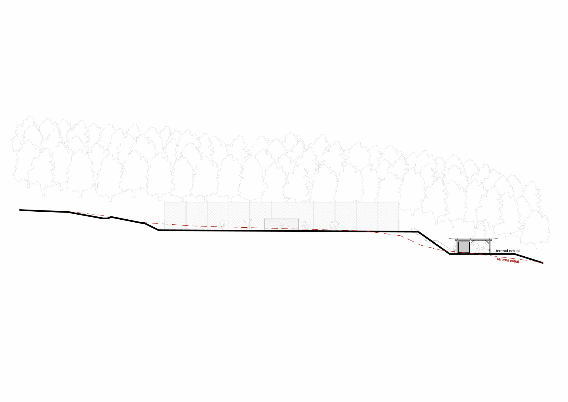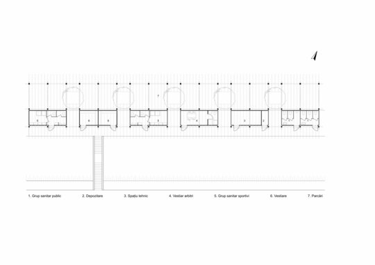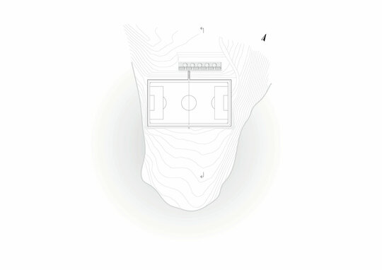 Miza proiectului a constat în realizarea unei inserții discrete într-un peisaj unic. Terenul de sport este înconjurat pe 3 laturi de pădure, iar spre nord perspectiva se deschide peste sat, la nivelul ochiului rămânând turnul bisericii. Astfel, toate dotările s-au realizat in containere prefabricate, care, împreună cu parcările necesare, sunt acoperite de o pergolă, peste care se vor întinde, în timp, plante cățărătoare.