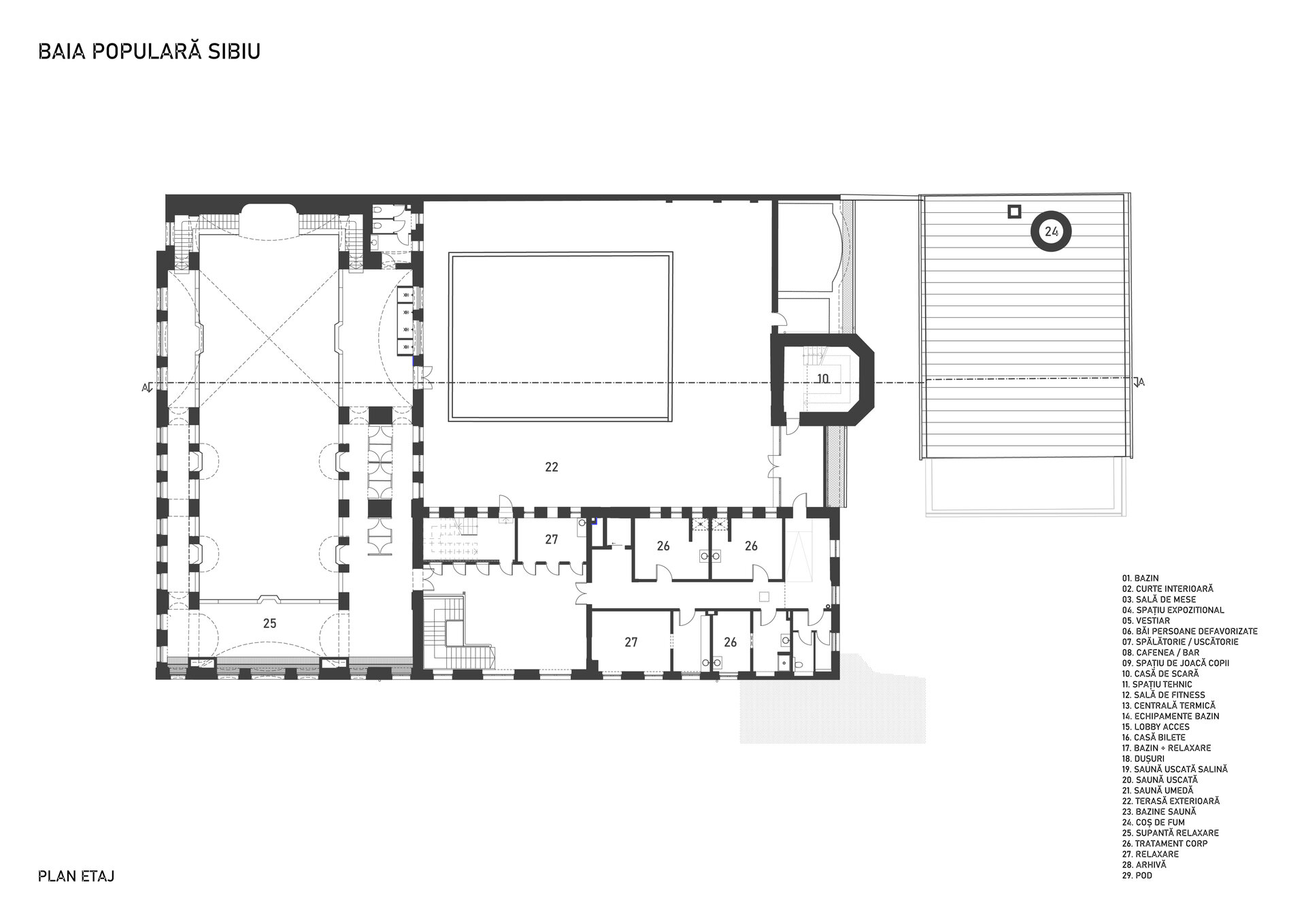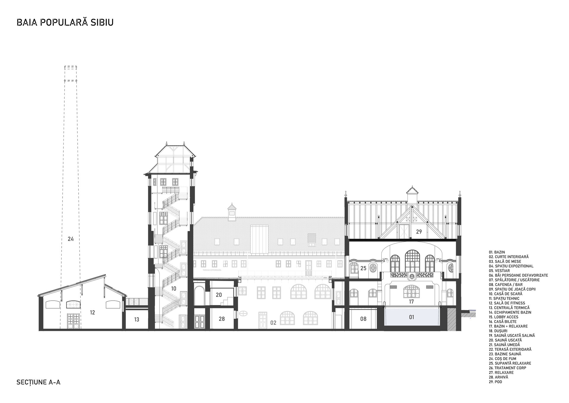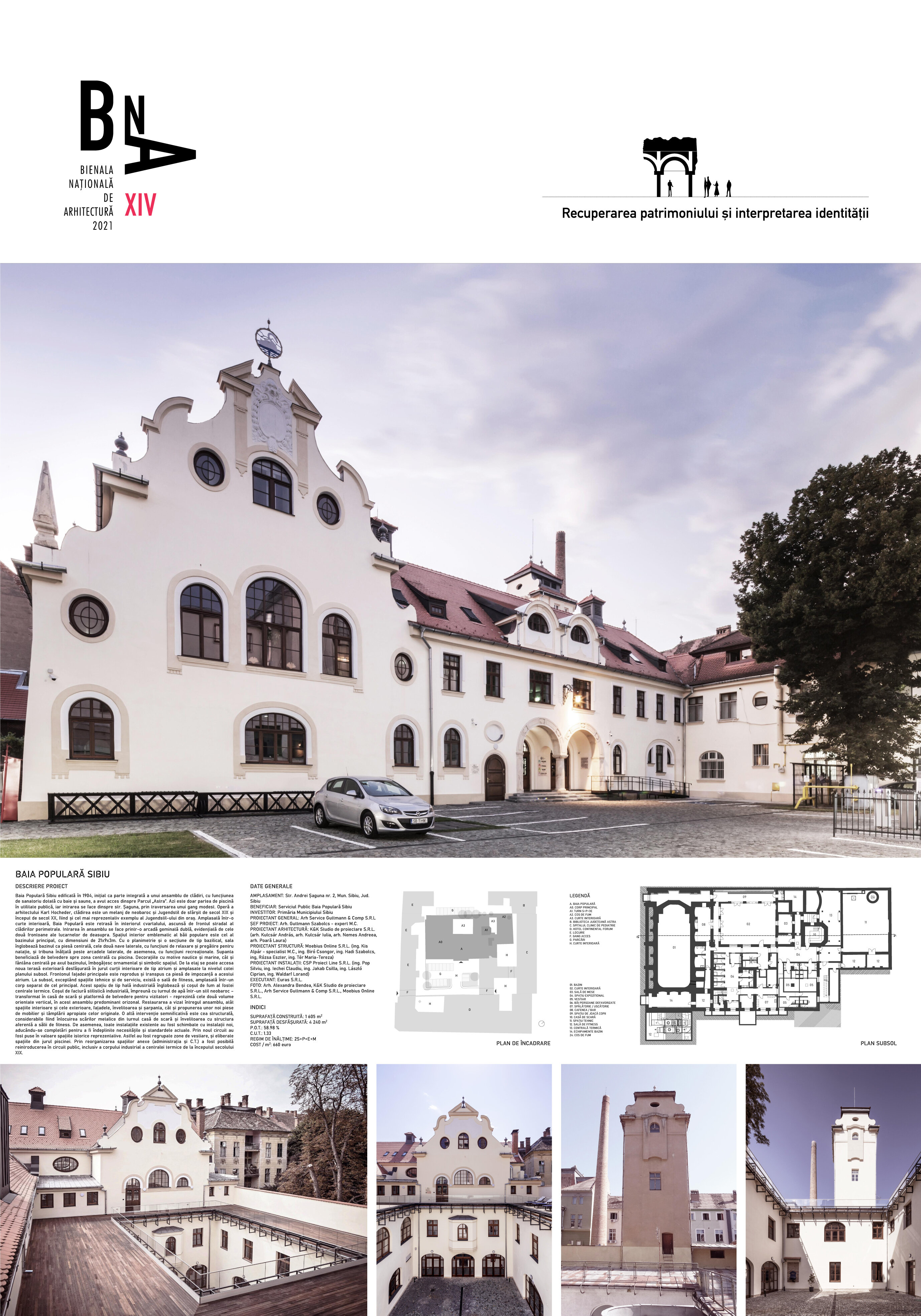 Baia Populară Sibiu edificată în 1904, inițial ca parte integrată a unui ansamblu de clădiri, cu funcțiunea de sanatoriu dotată cu baie și saune, a avut acces dinspre Parcul „Astra”. Azi este doar partea de piscină în utilitate publică, iar intrarea se face dinspre str. Șaguna, prin traversarea unui gang modest. Operă a arhitectului Karl Hocheder, clădirea este un melanj de neobaroc și Jugendstil de sfârșit de secol XIX și început de secol XX, fiind și cel mai reprezentativ exemplu al Jugendstil-ului din oraș. Amplasată într-o curte interioară, Baia Populară este retrasă în interiorul cvartalului, ascunsă de frontul stradal al clădirilor perimetrale. Intrarea în ansamblu se face printr-o arcadă geminată dublă, evidențiată de cele două frontoane ale lucarnelor de deasupra. Spațiul interior emblematic al băii populare este cel al bazinului principal, cu dimensiuni de 21x9x3m. Cu o planimetrie și o secțiune de tip bazilical, sala înglobează bazinul ca piesă centrală, cele două nave laterale, cu funcțiuni de relaxare și pregătire pentru natație, și tribuna înălțată peste arcadele laterale, de asemenea, cu funcțiuni recreaționale. Supanta beneficiază de belvedere spre zona centrală cu piscina. Decorațiile cu motive nautice și marine, cât și fântâna centrată pe axul bazinului, îmbogățesc ornamental și simbolic spațiul. De la etaj se poate accesa noua terasă exterioară desfășurată în jurul curții interioare de tip atrium și amplasate la nivelul cotei planului subsol. Frontonul fațadei principale este reprodus și transpus ca piesă de impozanță a acestui atrium. La subsol, exceptând spațiile tehnice și de serviciu, există o sală de fitness, amplasată într-un corp separat de cel principal. Acest spațiu de tip hală industrială înglobează și coșul de fum al fostei centrale termice. Coșul de factură stilistică industrială, împreună cu turnul de apă într-un stil neobaroc – transformat în casă de scară și platformă de belvedere pentru vizitatori - reprezintă cele două volume orientate vertical, în acest ansamblu predominant orizonal. Restaurarea a vizat întregul ansamblu, atât spațiile interioare și cele exterioare, fațadele, învelitoarea și șarpanta, cât și propunerea unor noi piese de mobilier și tâmplării apropiate celor originale. O altă intervenție semnificativă este cea structurală, considerabile fiind înlocuirea scărilor metalice din turnul casă de scară și învelitoarea cu structura aferentă a sălii de fitness. De asemenea, toate instalațiile existente au fost schimbate cu instalații noi, aducându-se completări pentru a fi îndeplinite necesitățile și standardele actuale. Prin noul circuit au fost puse în valoare spațiile istorice reprezentative. Astfel au fost regrupate zone de vestiare, și eliberate spațiile din jurul piscinei. Prin reorganizarea spațiilor anexe (administrația și C.T.) a fost posibilă reintroducerea în circuit public, inclusiv a corpului industrial a centralei termice de la începutul secolului XIX.