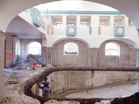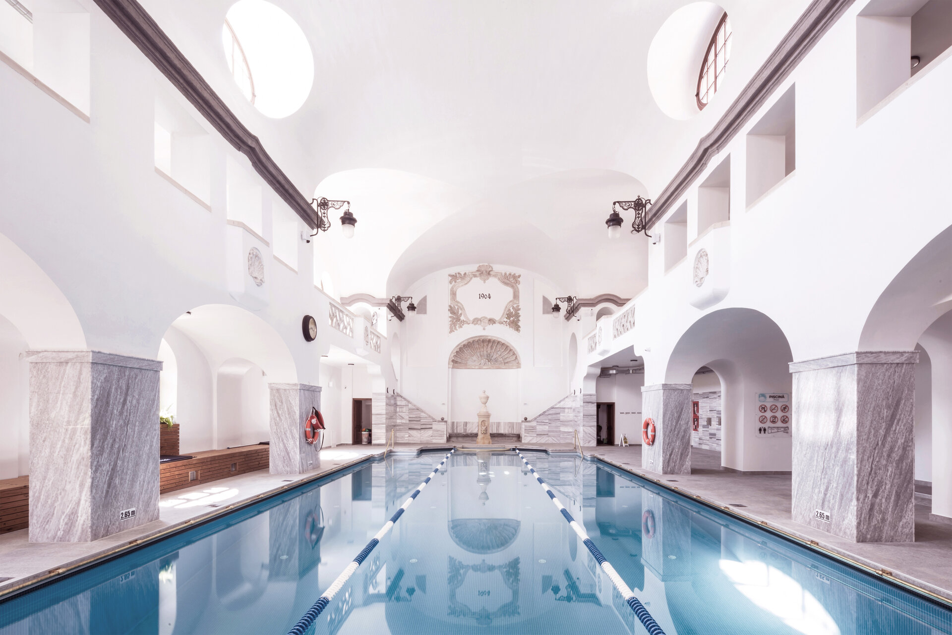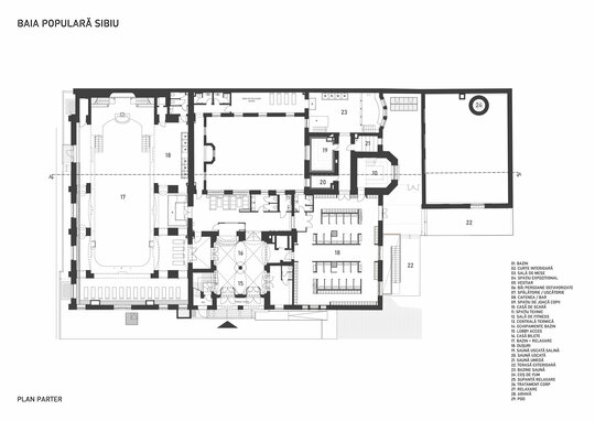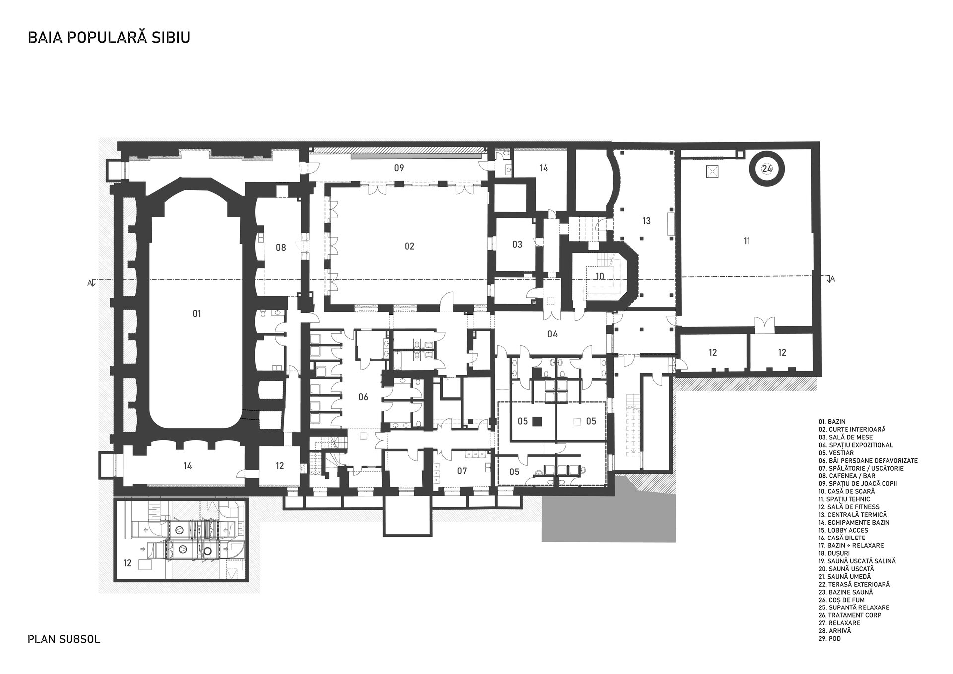 Baia Populară Sibiu edificată în 1904, inițial ca parte integrată a unui ansamblu de clădiri, cu funcțiunea de sanatoriu dotată cu baie și saune, a avut acces dinspre Parcul „Astra”. Azi este doar partea de piscină în utilitate publică, iar intrarea se face dinspre str. Șaguna, prin traversarea unui gang modest. Operă a arhitectului Karl Hocheder, clădirea este un melanj de neobaroc și Jugendstil de sfârșit de secol XIX și început de secol XX, fiind și cel mai reprezentativ exemplu al Jugendstil-ului din oraș. Amplasată într-o curte interioară, Baia Populară este retrasă în interiorul cvartalului, ascunsă de frontul stradal al clădirilor perimetrale. Intrarea în ansamblu se face printr-o arcadă geminată dublă, evidențiată de cele două frontoane ale lucarnelor de deasupra. Spațiul interior emblematic al băii populare este cel al bazinului principal, cu dimensiuni de 21x9x3m. Cu o planimetrie și o secțiune de tip bazilical, sala înglobează bazinul ca piesă centrală, cele două nave laterale, cu funcțiuni de relaxare și pregătire pentru natație, și tribuna înălțată peste arcadele laterale, de asemenea, cu funcțiuni recreaționale. Supanta beneficiază de belvedere spre zona centrală cu piscina. Decorațiile cu motive nautice și marine, cât și fântâna centrată pe axul bazinului, îmbogățesc ornamental și simbolic spațiul. De la etaj se poate accesa noua terasă exterioară desfășurată în jurul curții interioare de tip atrium și amplasate la nivelul cotei planului subsol. Frontonul fațadei principale este reprodus și transpus ca piesă de impozanță a acestui atrium. La subsol, exceptând spațiile tehnice și de serviciu, există o sală de fitness, amplasată într-un corp separat de cel principal. Acest spațiu de tip hală industrială înglobează și coșul de fum al fostei centrale termice. Coșul de factură stilistică industrială, împreună cu turnul de apă într-un stil neobaroc – transformat în casă de scară și platformă de belvedere pentru vizitatori - reprezintă cele două volume orientate vertical, în acest ansamblu predominant orizonal. Restaurarea a vizat întregul ansamblu, atât spațiile interioare și cele exterioare, fațadele, învelitoarea și șarpanta, cât și propunerea unor noi piese de mobilier și tâmplării apropiate celor originale. O altă intervenție semnificativă este cea structurală, considerabile fiind înlocuirea scărilor metalice din turnul casă de scară și învelitoarea cu structura aferentă a sălii de fitness. De asemenea, toate instalațiile existente au fost schimbate cu instalații noi, aducându-se completări pentru a fi îndeplinite necesitățile și standardele actuale. Prin noul circuit au fost puse în valoare spațiile istorice reprezentative. Astfel au fost regrupate zone de vestiare, și eliberate spațiile din jurul piscinei. Prin reorganizarea spațiilor anexe (administrația și C.T.) a fost posibilă reintroducerea în circuit public, inclusiv a corpului industrial a centralei termice de la începutul secolului XIX.