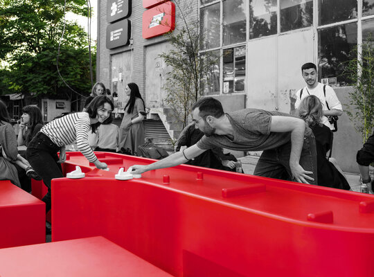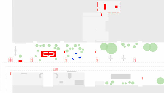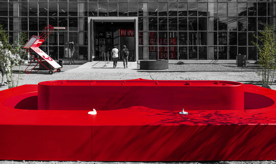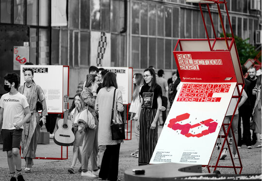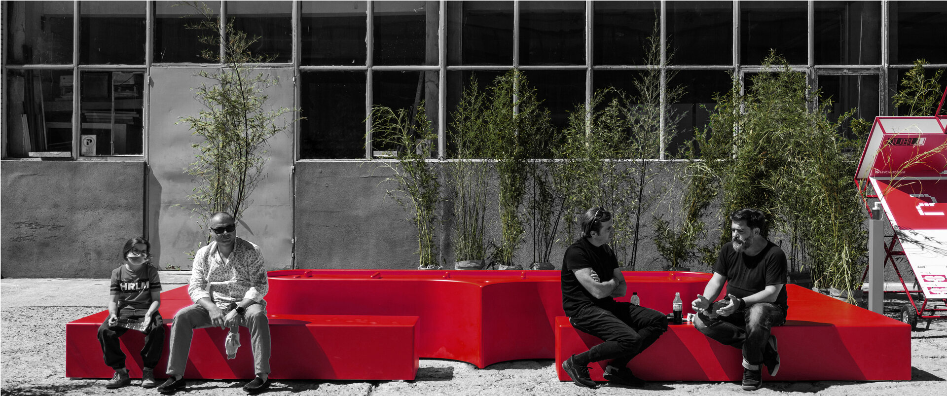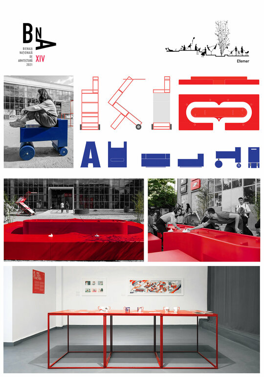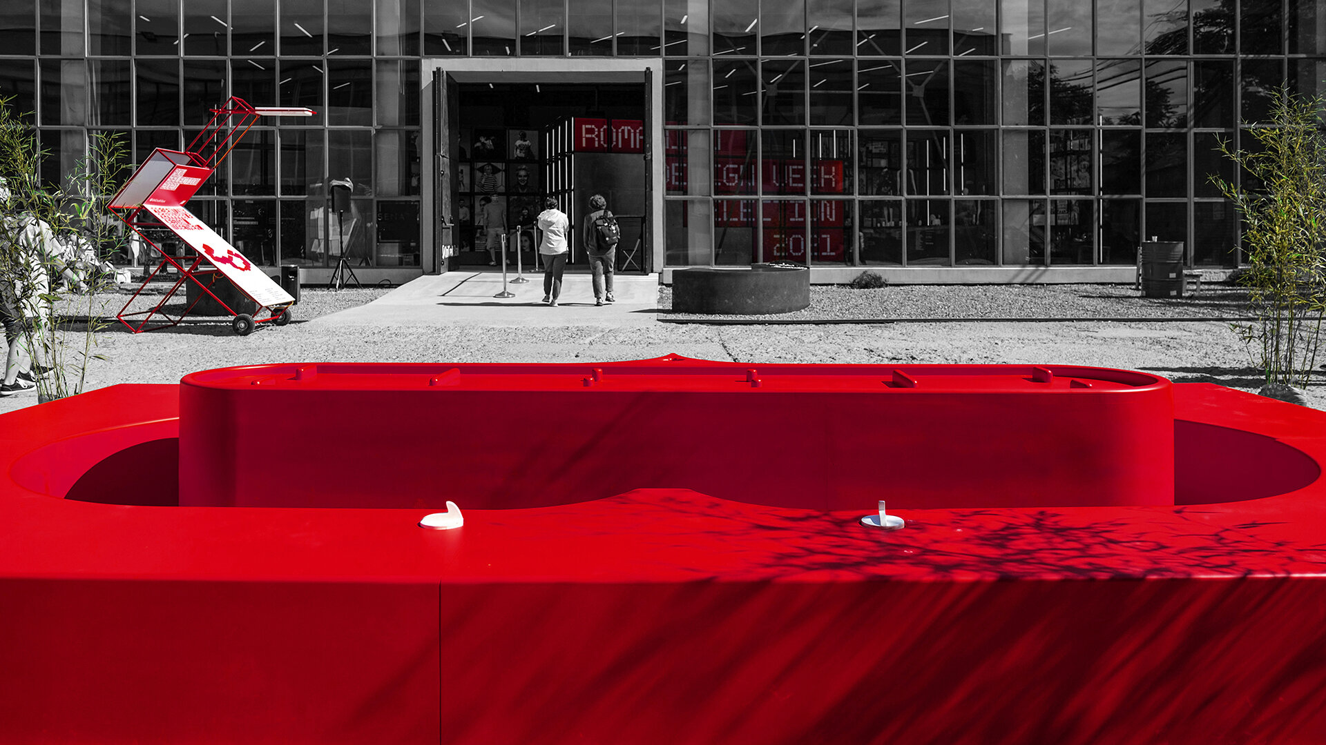 Împrăștiate prin curte panouri de semnalistică montate pe zigzaguri din cadre 90x90x30 vopsite roșu intens; grafică pe schele cu lumina proprie din cutii de opalină.