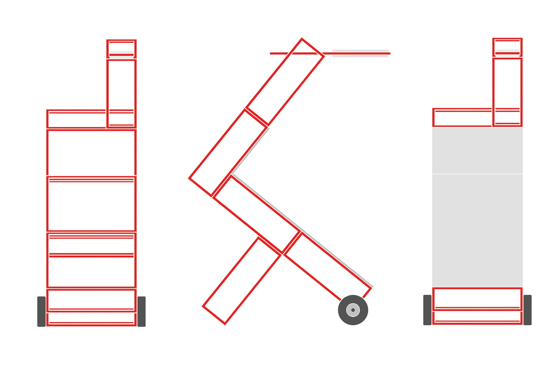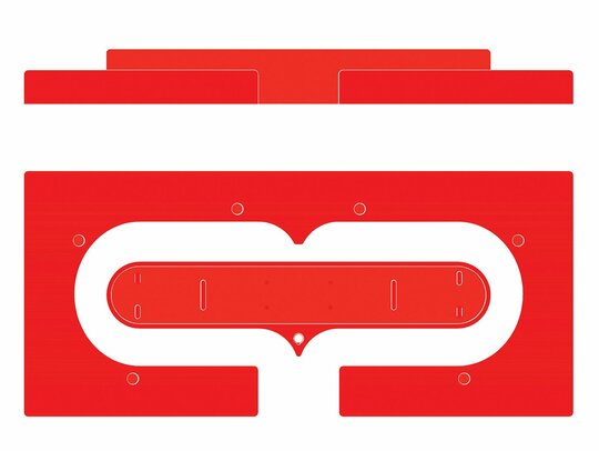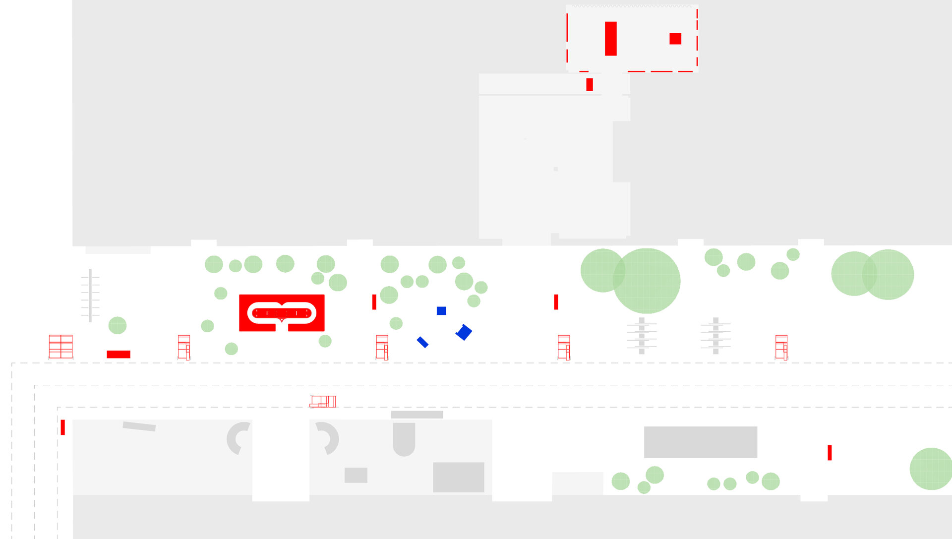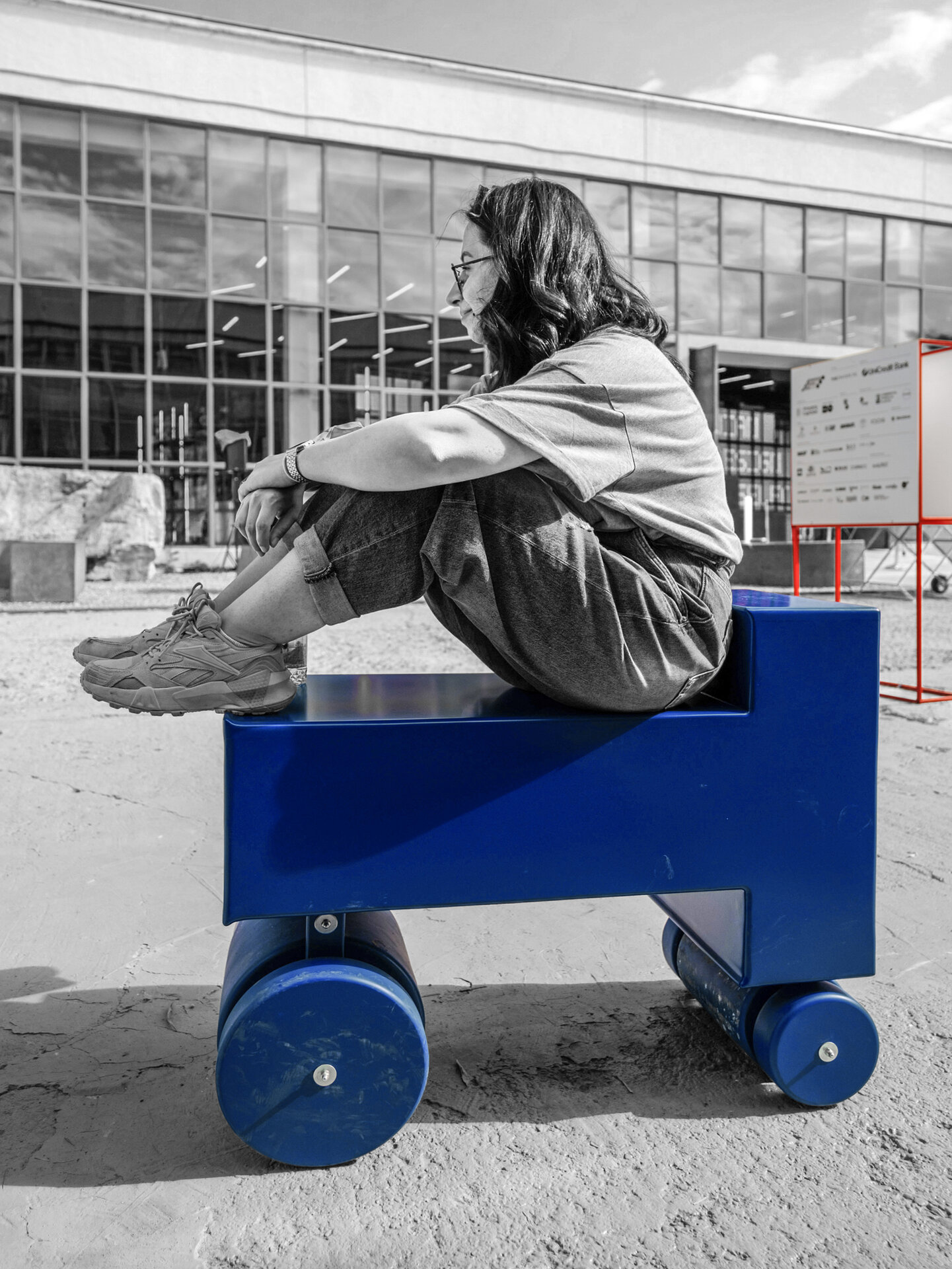 Împrăștiate prin curte panouri de semnalistică montate pe zigzaguri din cadre 90x90x30 vopsite roșu intens; grafică pe schele cu lumina proprie din cutii de opalină.