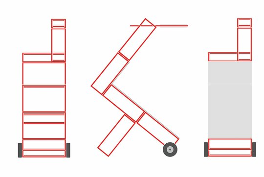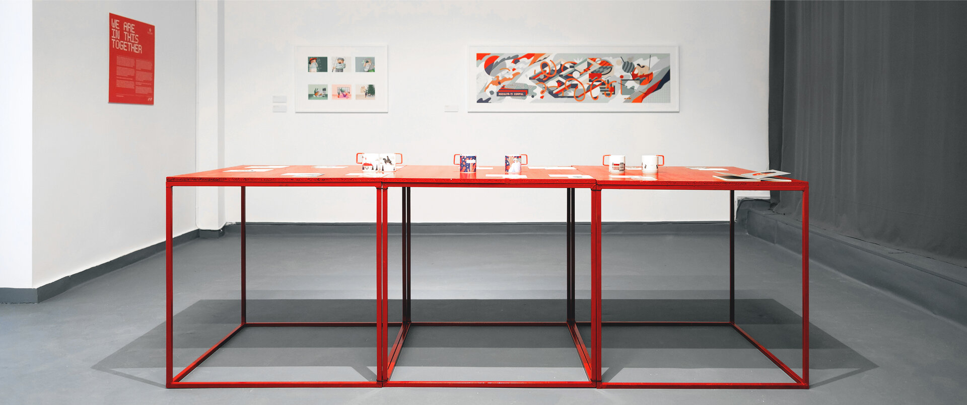 În ultima sala a halei: 4 cutii luminoase, cortină gri și 3 mese din cadre 90x90x90; container și suport pentru o expoziție de grafică.