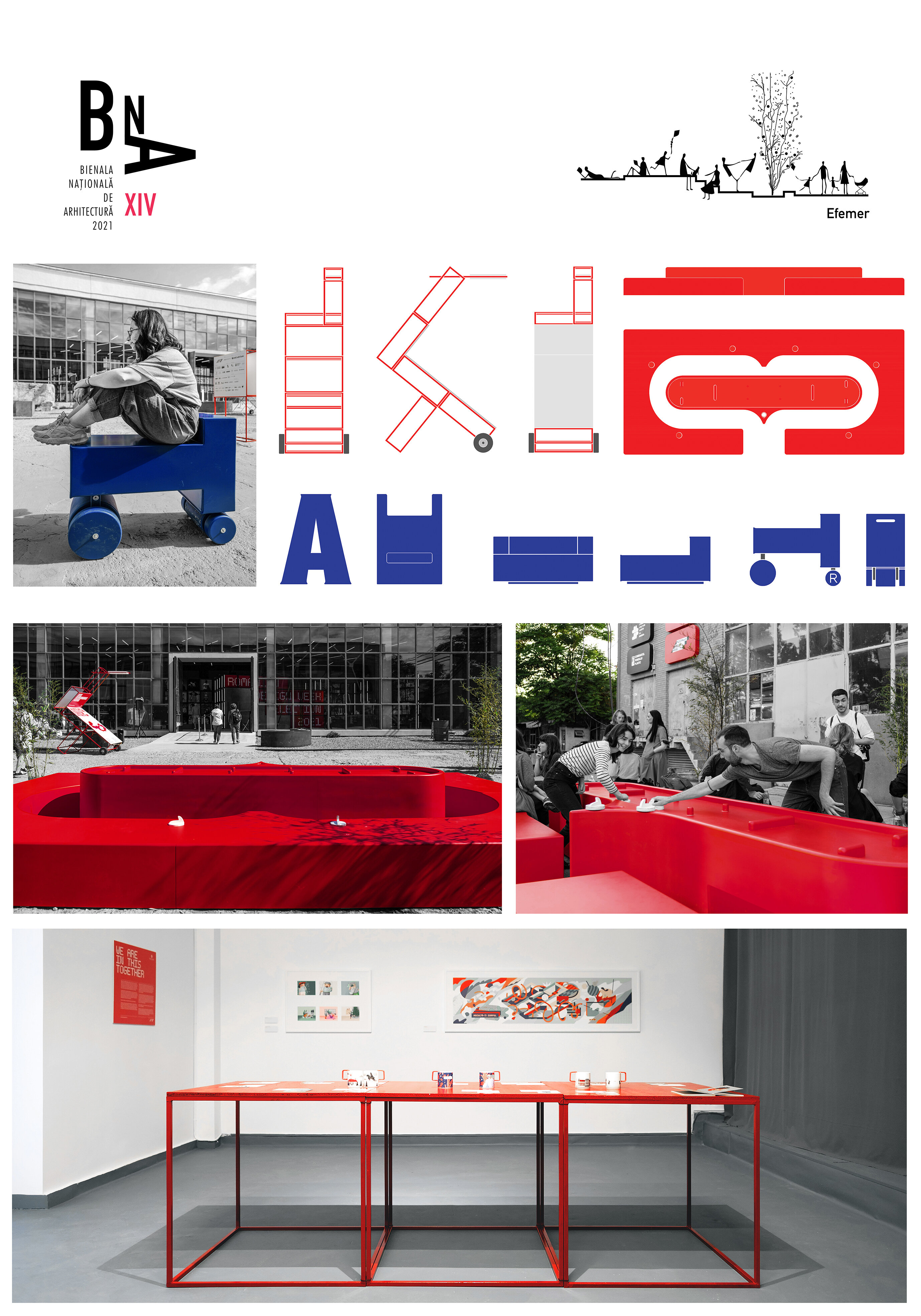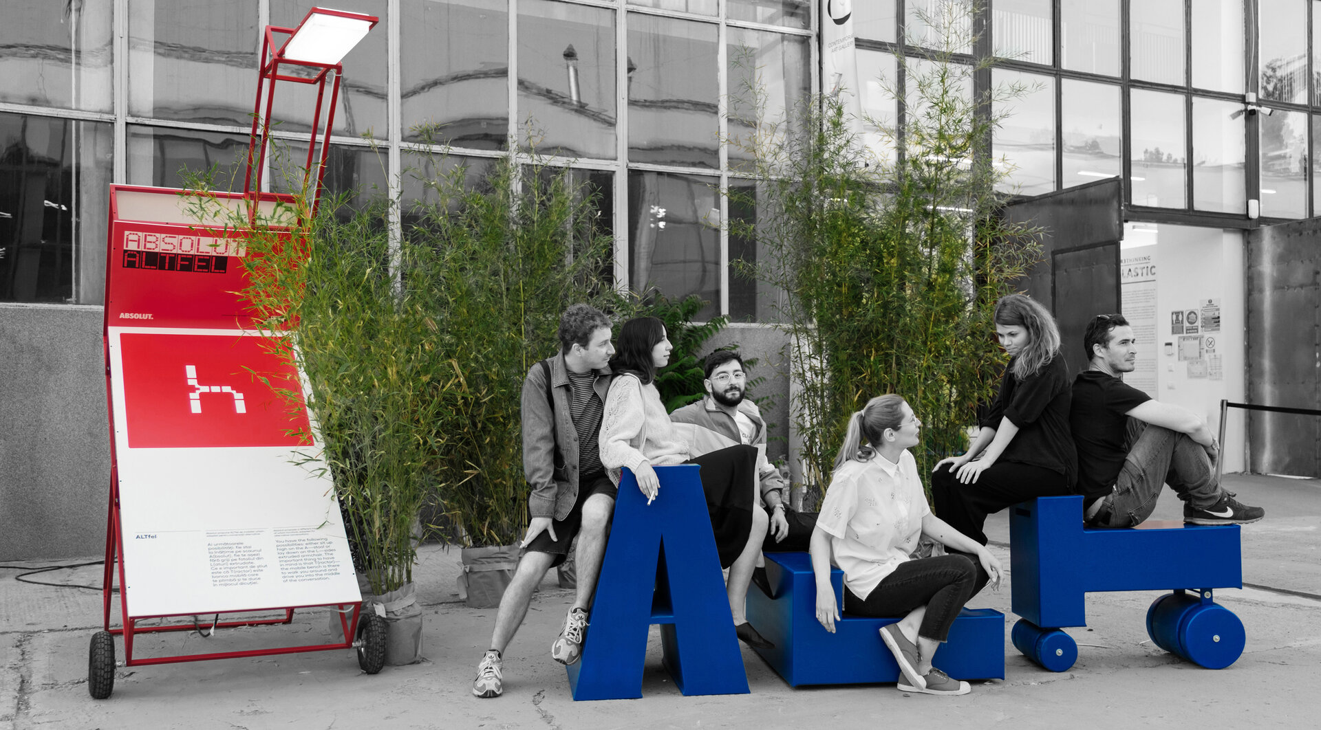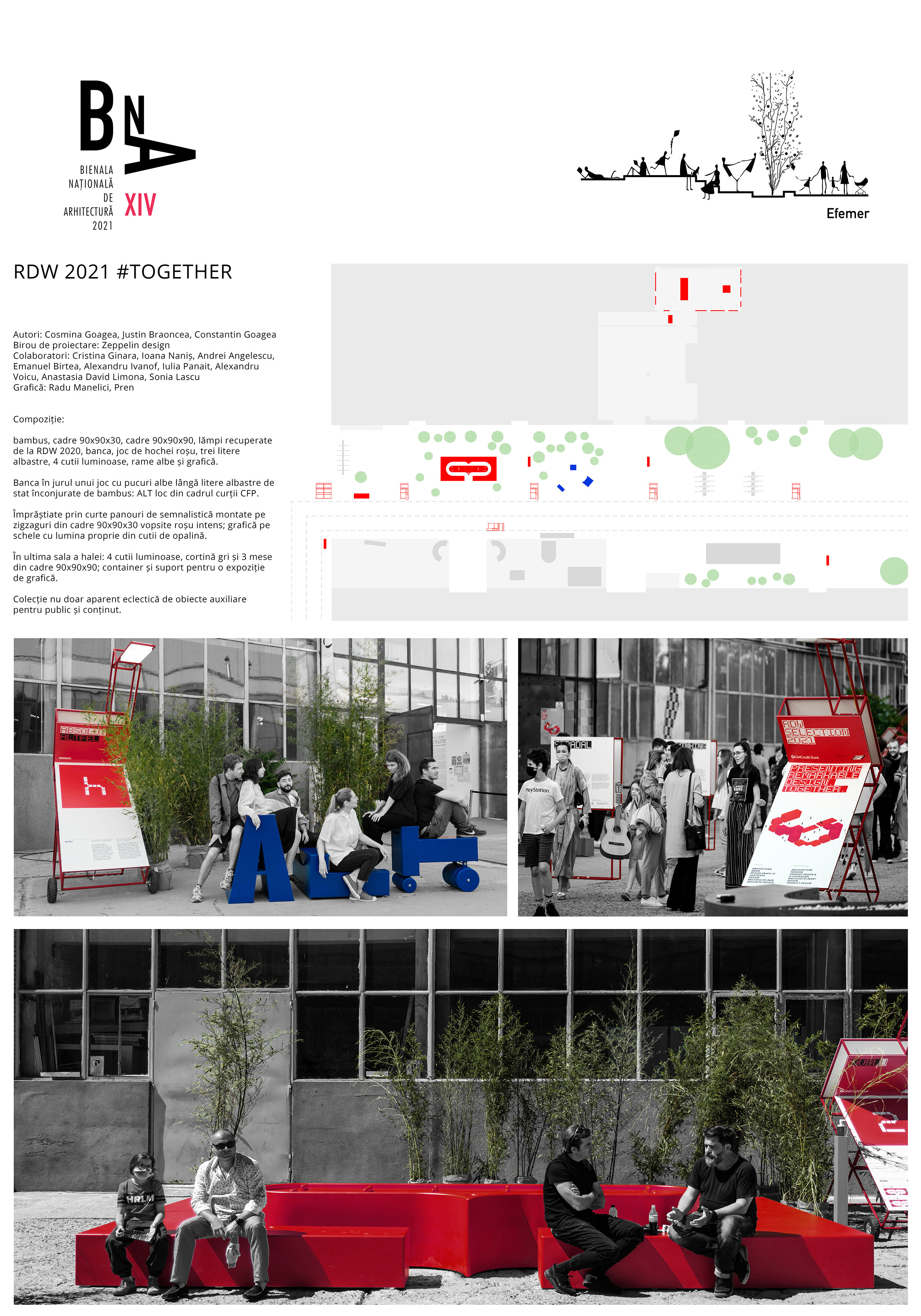 bambus, cadre 90x90x30, cadre 90x90x90, lămpi recuperate de la RDW 2020, banca, joc de hochei roșu, trei litere albastre, 4 cutii luminoase, rame albe și grafică.