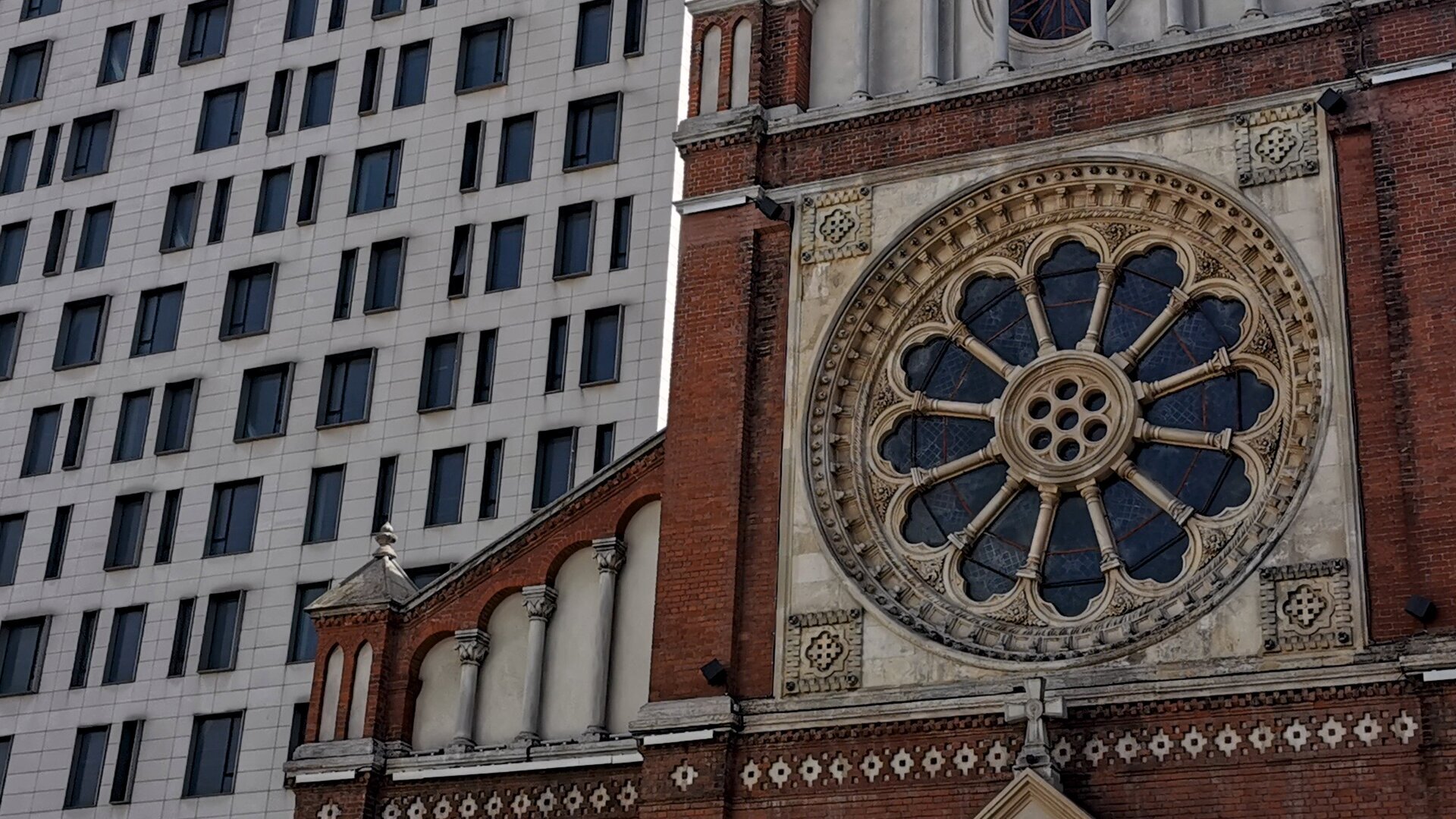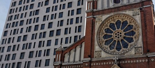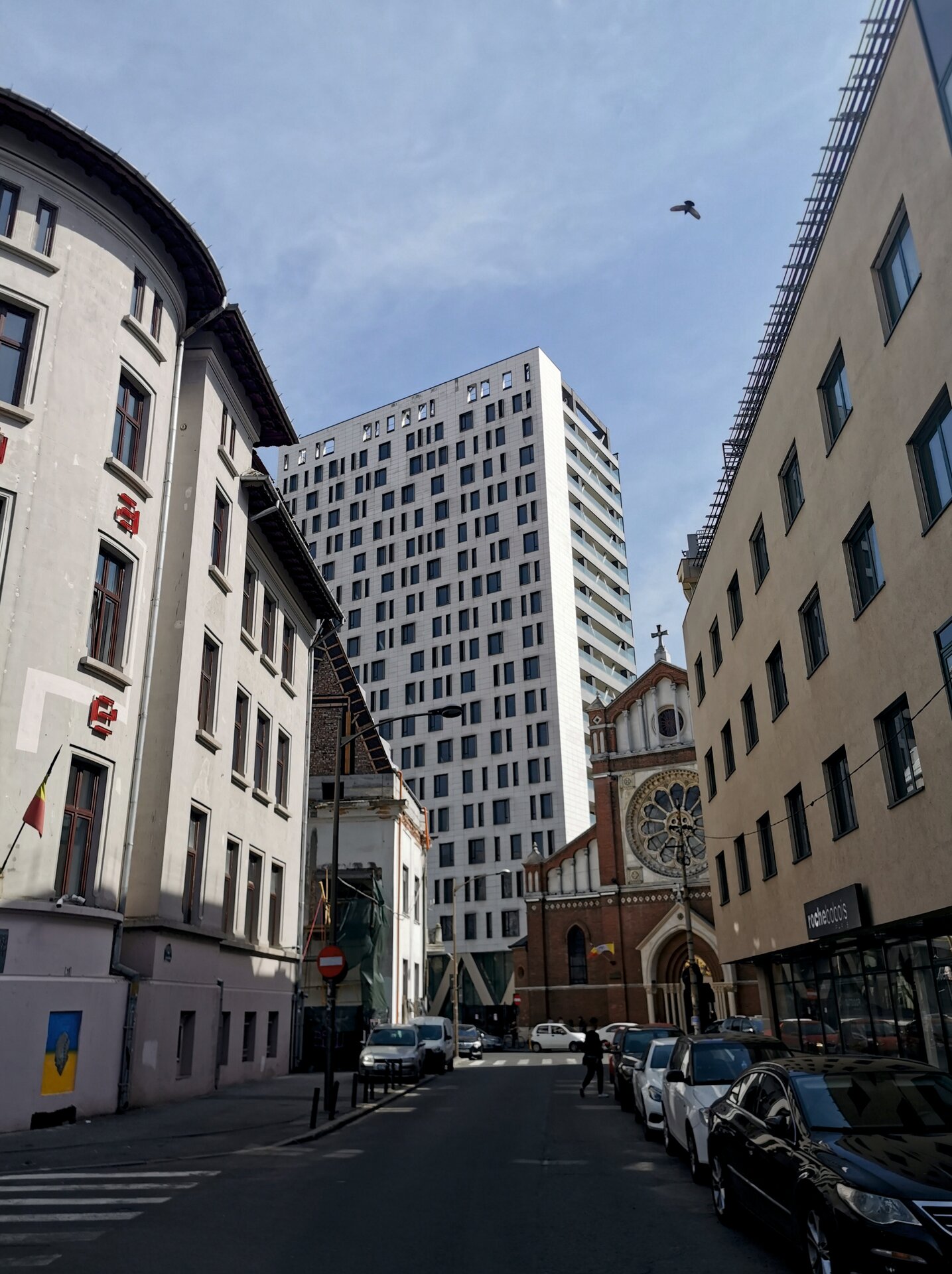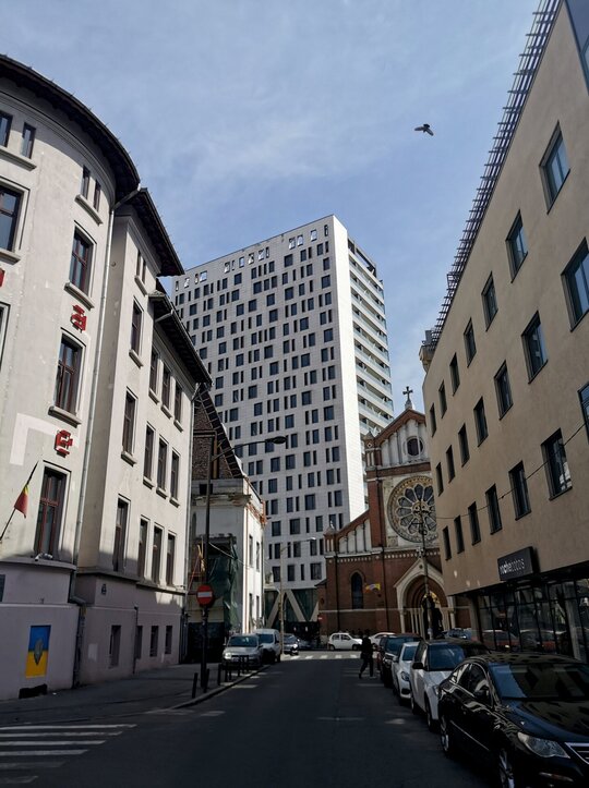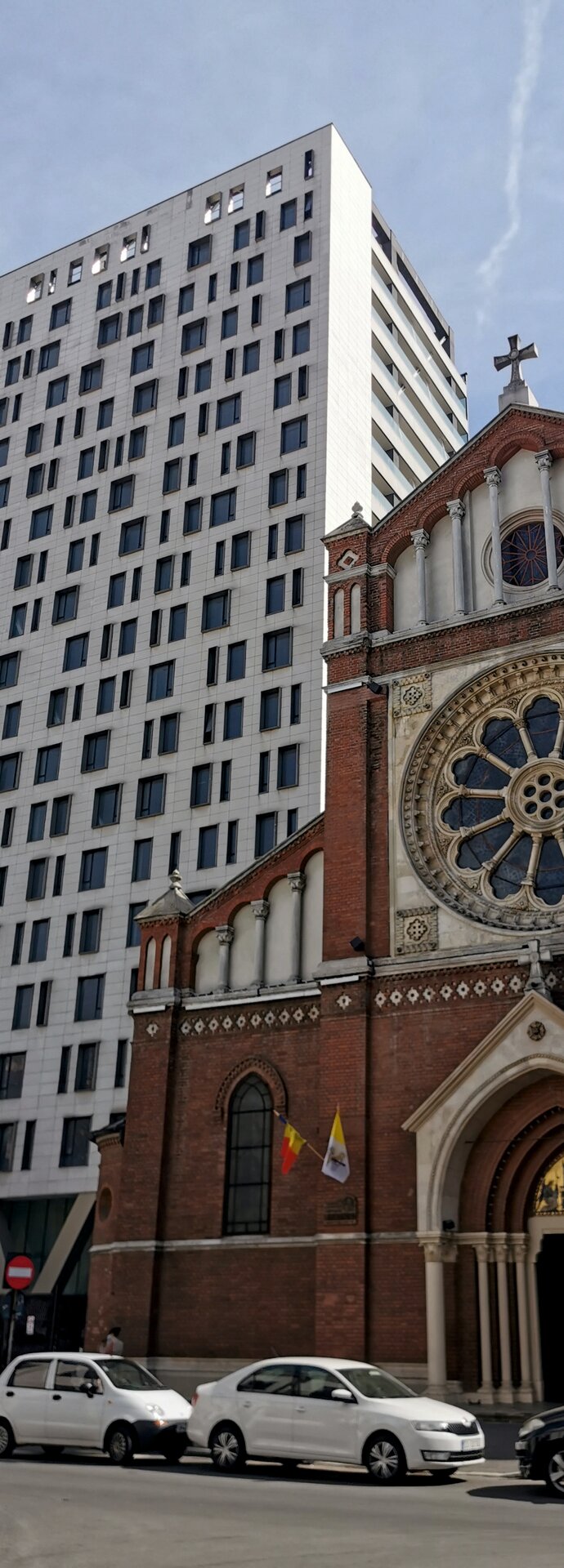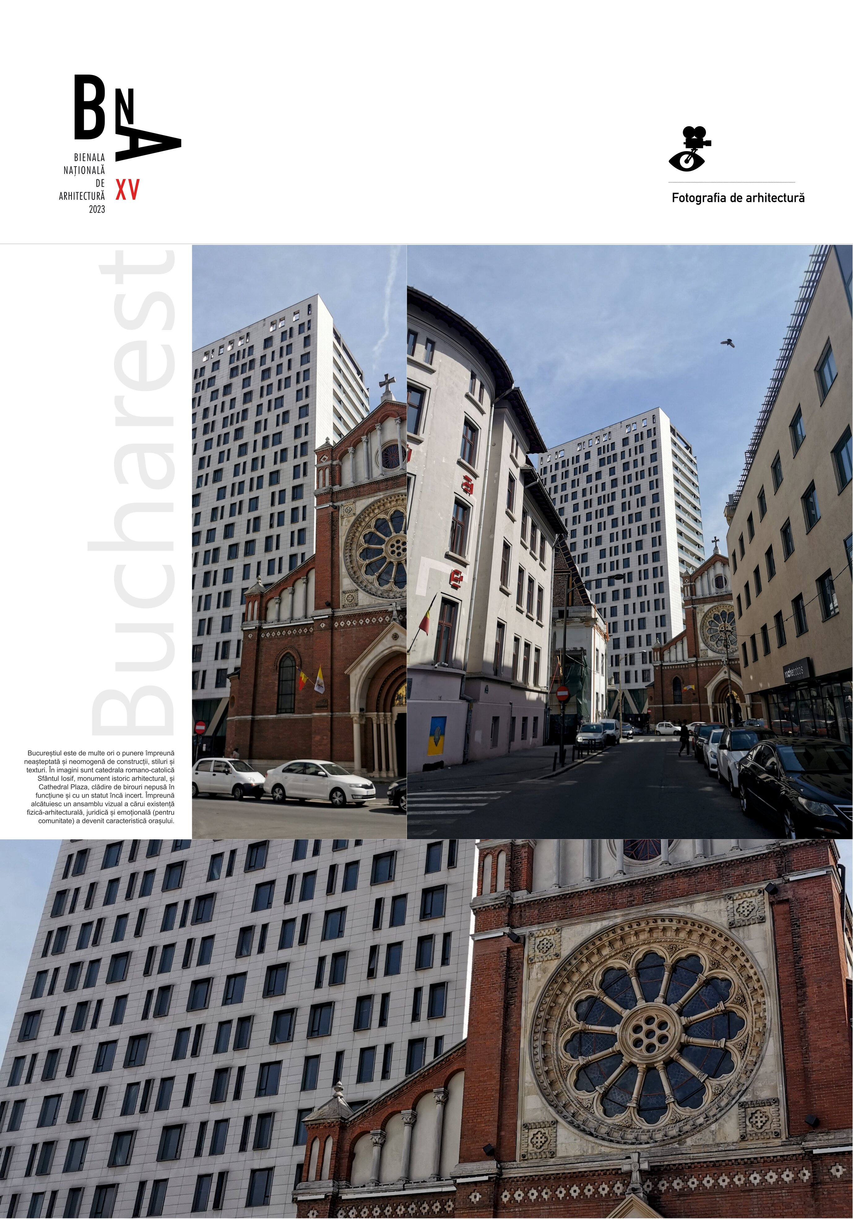 Bucureștiul este de multe ori o punere împreună neașteptată și neomogenă de construcții, stiluri și texturi. În imagini sunt catedrala romano-catolică Sfântul Iosif, monument istoric arhitectural, și Cathedral Plaza, clădire de birouri nepusă în funcțiune și cu un statut încă incert. Împreună alcătuiesc un ansamblu vizual a cărui existență fizică-arhitecturală, juridică și emoțională (pentru comunitate) a devenit caracteristică Bucureștiului.