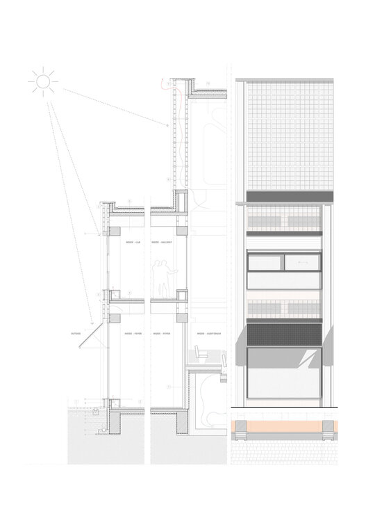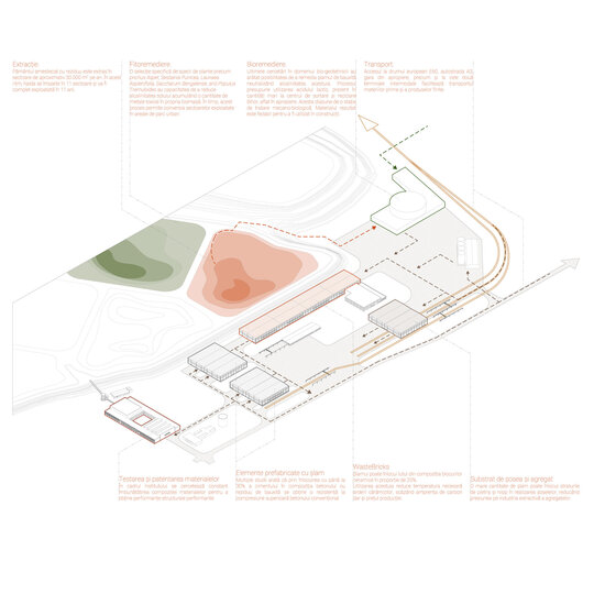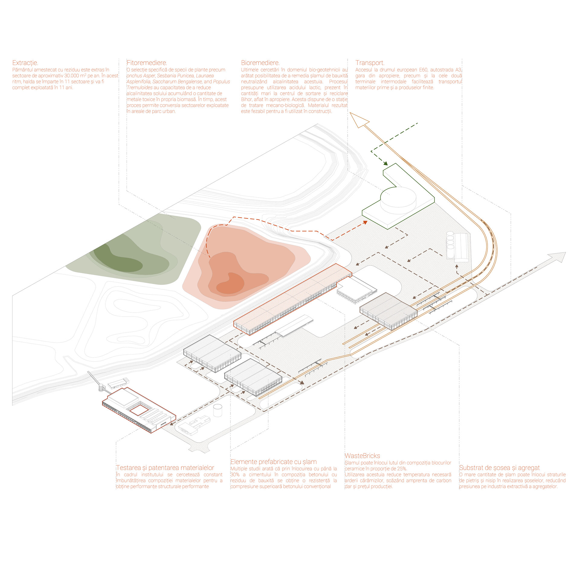 Institutul de cercetare se așează firesc în proximitatea haldei și a platformei de fabricare a materialelor de construcții. Acesta este construit utilizând chiar elementele prefabricate realizate cu agregate de reziduu în componență, reducând astfel amprenta de carbon aferentă transportului de materiale. Obiectul de cercetare al institutui se va adapta în timp la și cercetarea altor moduri de valorificare a deșeurilor și realizarea materialelor de construcșii experimentale. Astfel utilizarea prefabricatelor și a sistemului constructiv regulat permite modificarea sau extinderea institutului în viitor pentru a răspunde necesităților.