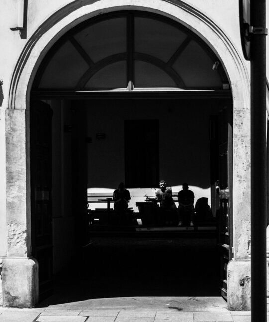 Personajul principal aici este clădirea; oamenii sunt sensul său, chiar și atunci când se află în trecere. Dacă sunt împreună, cu atât mai bine.