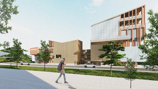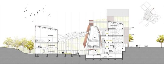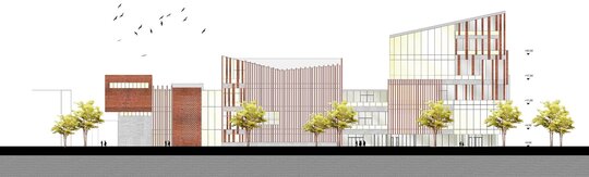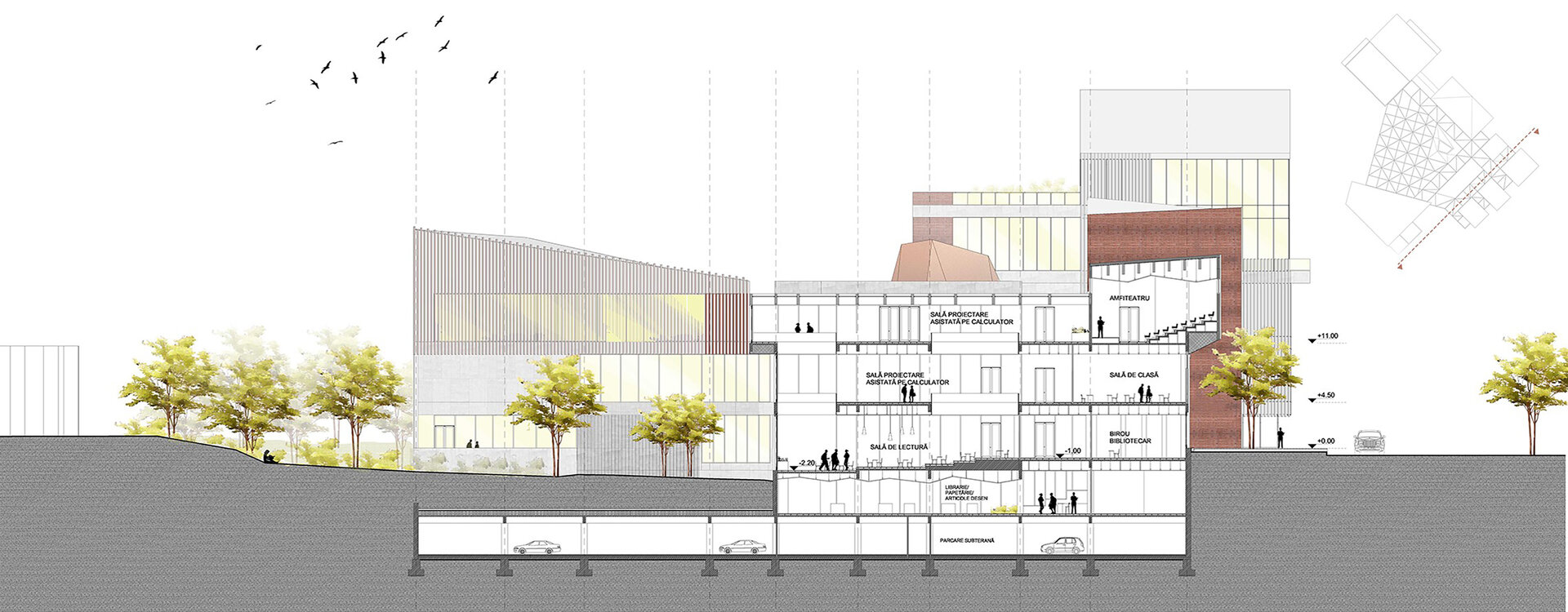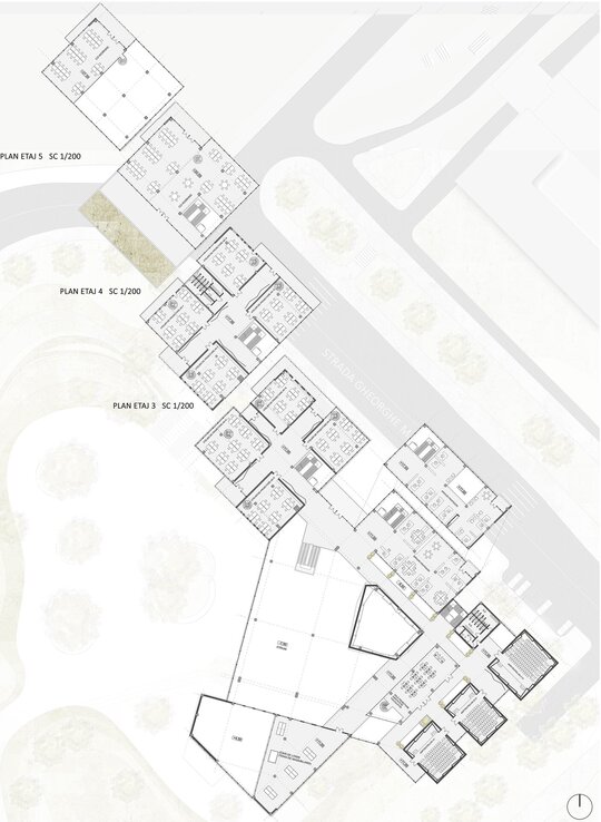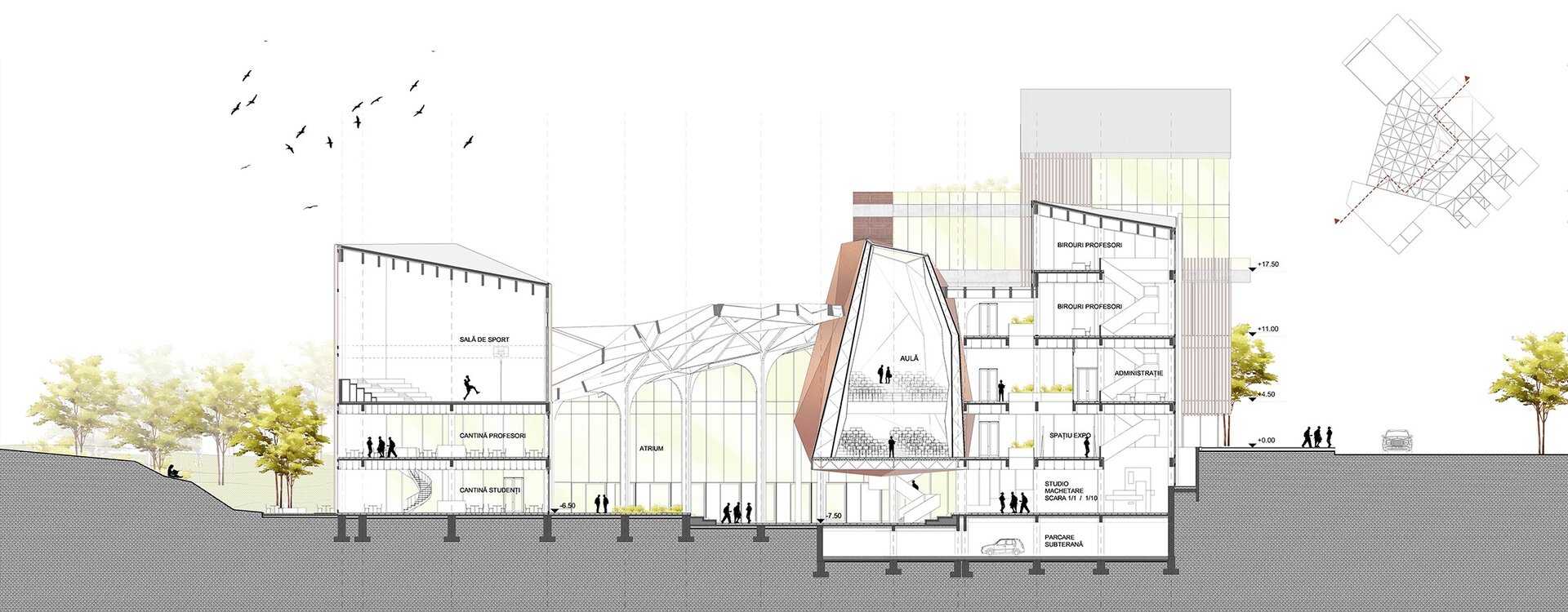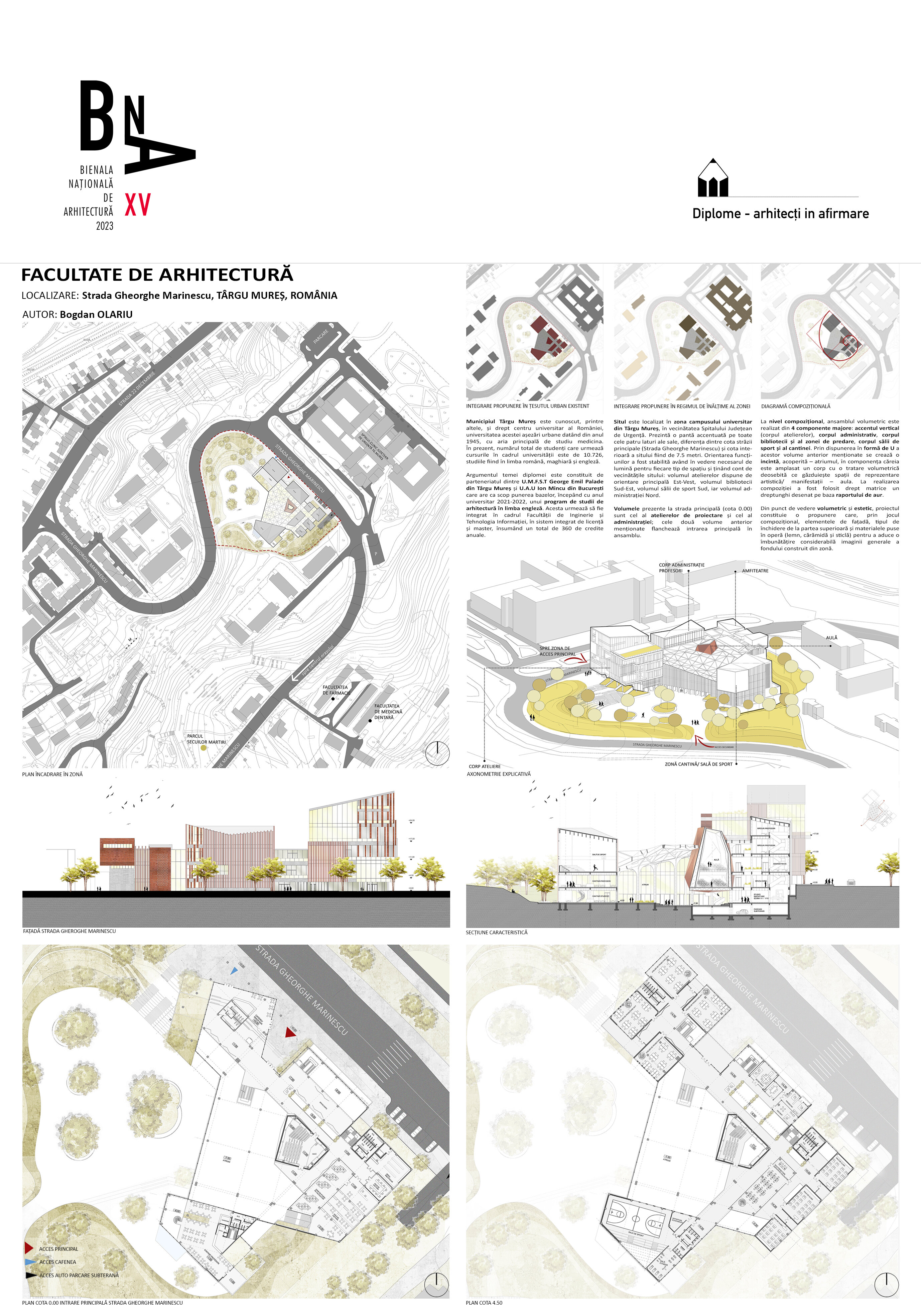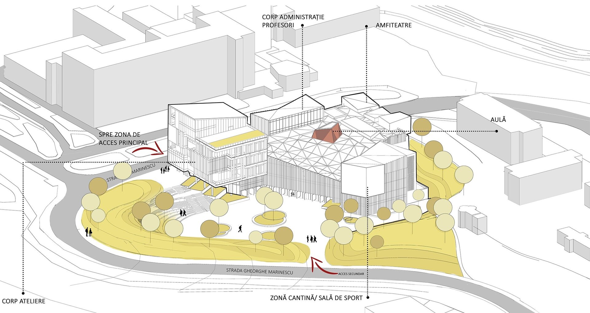 Pornind de la această premisă, abordarea personală s-a concretizat într-un proiect care are șase componente funcționale majore: zona central-polarizatoare (prezintă un atrium polivalent în componența căruia se regăsește o aulă de evenimente), zona atelierelor de proiectare (dezvoltată pe mai multe niveluri, aceasta cuprinde atelierele- grupate câte patru pe fiecare etaj, fiecărui an de studiu fiindu-i desemnate câte două săli și câteva mici spații comune de regrupare), zona administrativă (cuprinde administrația facultății, secretariatul, decanatul și birourile profesorilor), zona de studiu (librărie, bibliotecă cu un spațiu de depozitare aferent fondului de carte și o sală principală de lectură, în trepte, amfiteatre cursuri și săli de predare, dotate cu aparatură digitală, spațiu de machetare la scară mare 1/5, 1/10, spații machetare laser – C.N.C și printer 3D), zona de alimentație (cantină cu spații tehnice aferente) și zona de activități sportive (sală principală de sport, sală de gimnastică, sală tenis de masă și vestiare). Spațiile au fost astfel dimensionate astfel încât să poată găzdui un număr de 60 de studenți/an.