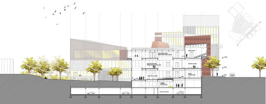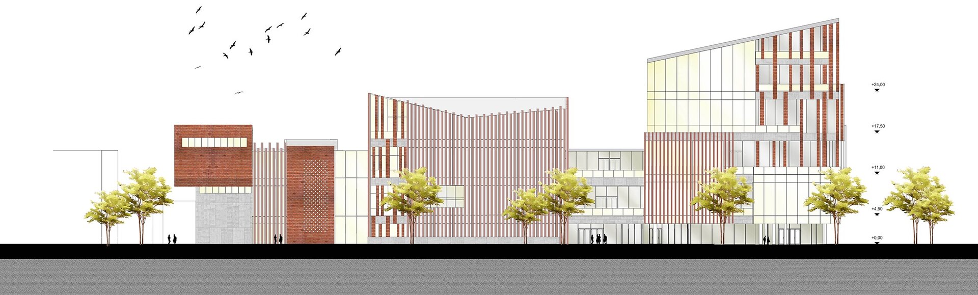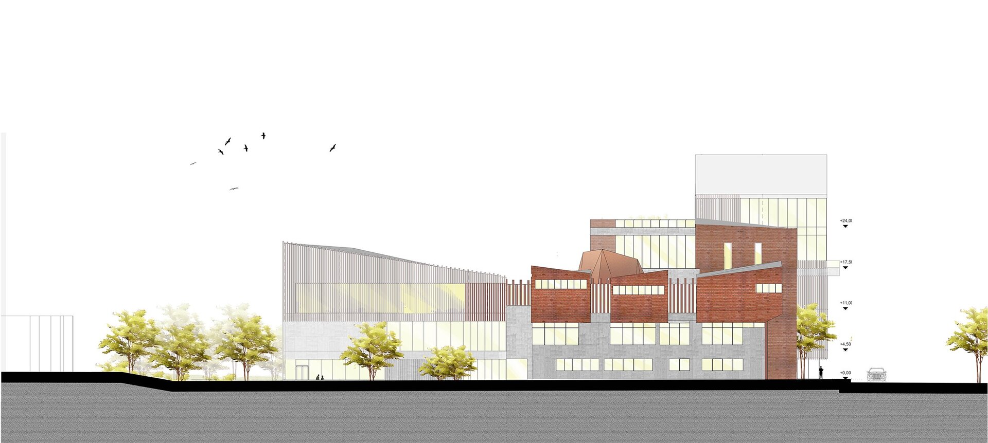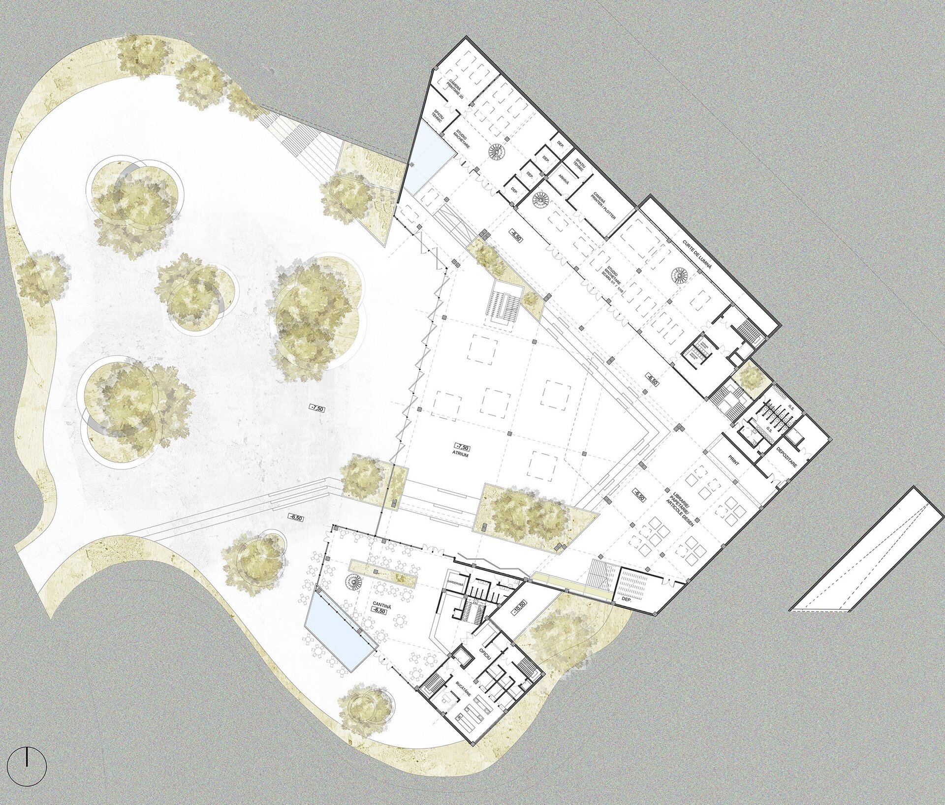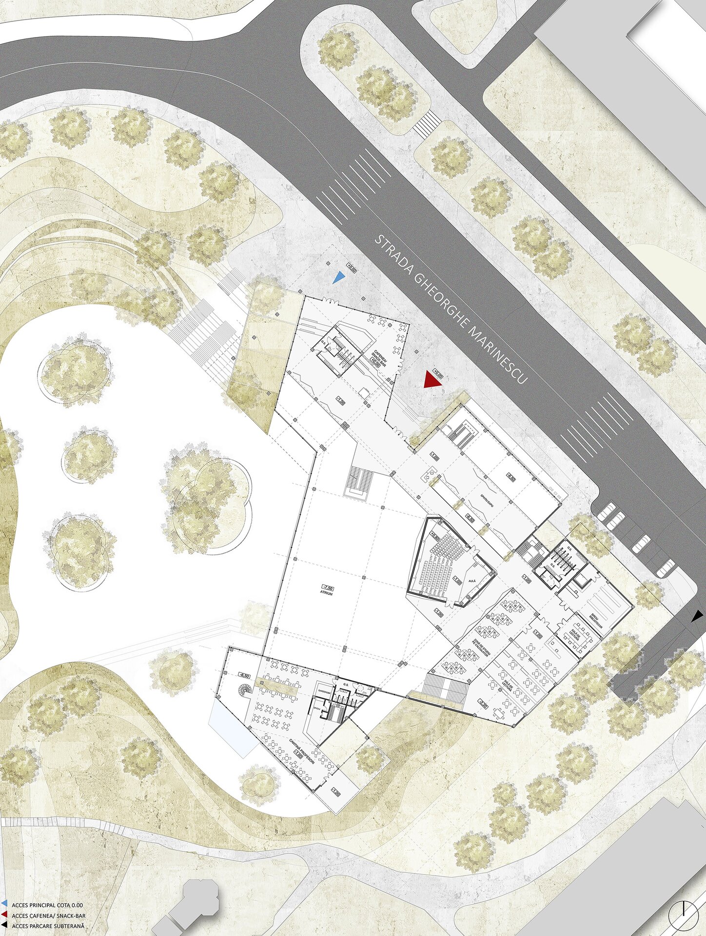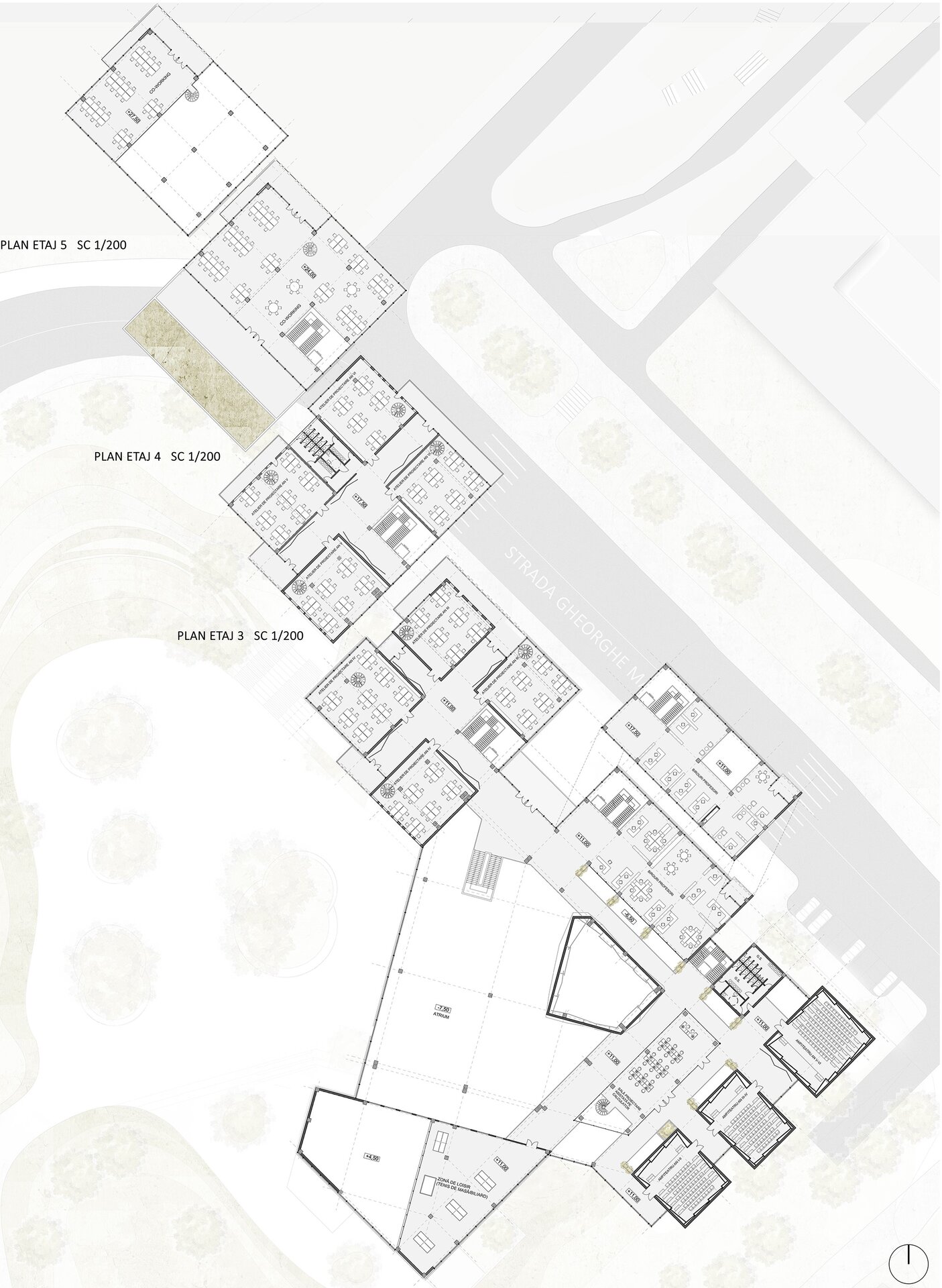 Volumele prezente la strada principală (cota 0.00) sunt cel al atelierelor de proiectare și cel al administrației; cele două volume anterior menționate flanchează intrarea principală în ansamblu.