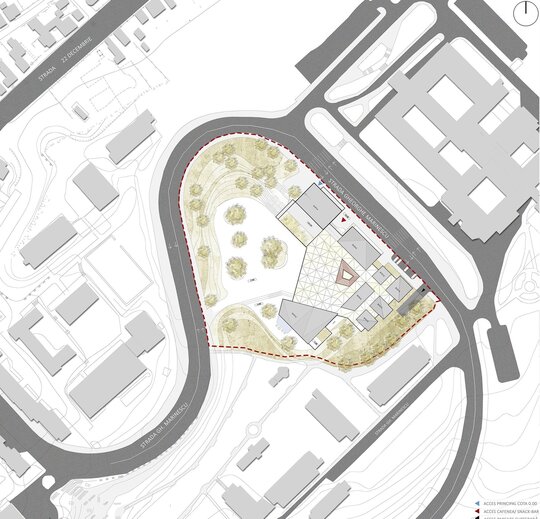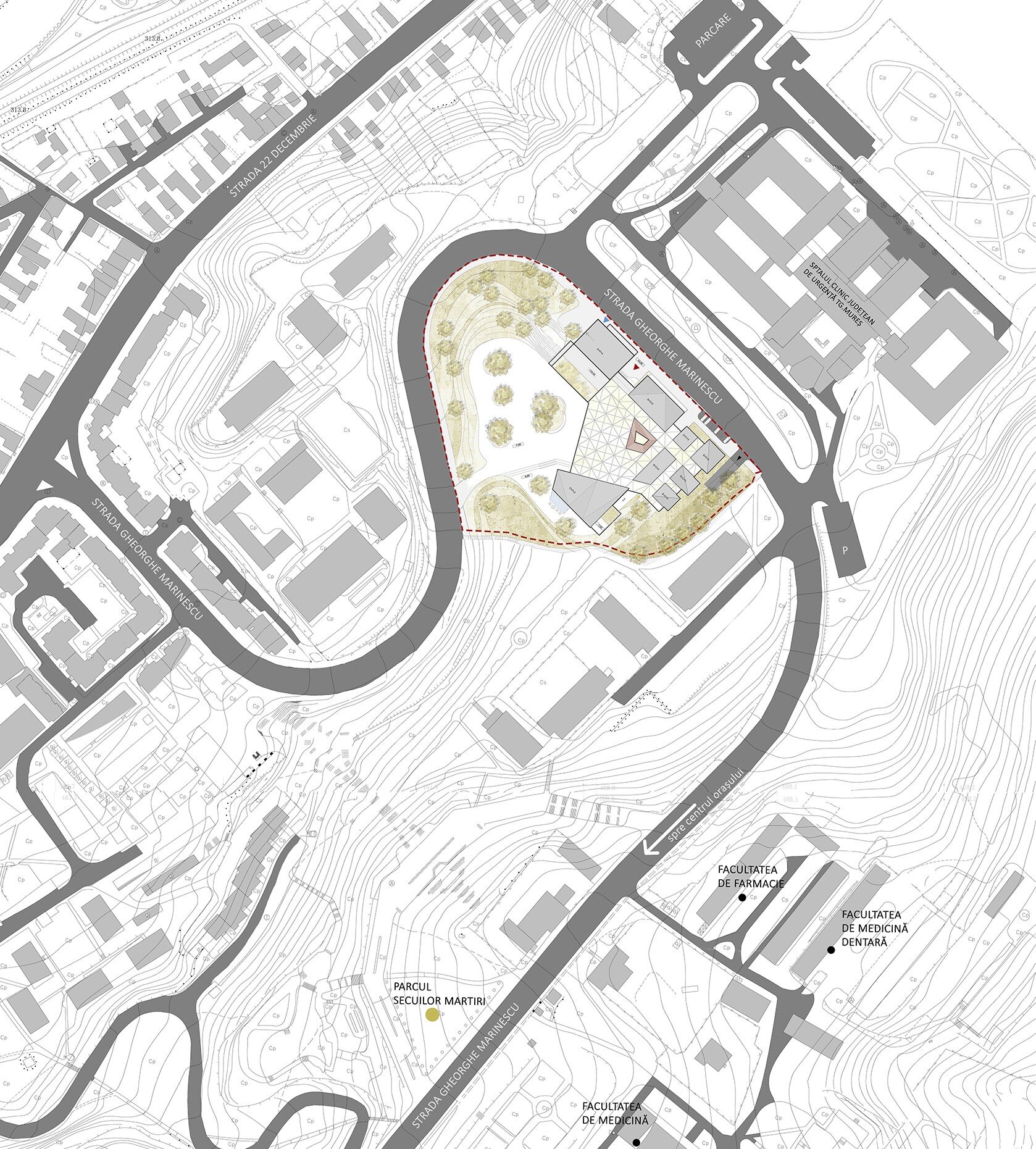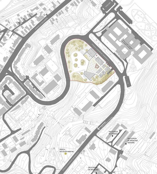 Situl este localizat în zona campusului universitar din Târgu Mureș, în vecinătatea Spitalului Județean de Urgență. Prezintă o pantă accentuată pe toate cele patru laturi ale sale, diferența dintre cota străzii princpiale (Strada Gheorghe Marinescu) și cota interioară a sitului fiind de 7.5 metri. Orientarea funcțiunior a fost stabilită astfel încât să fie asigurat necesarul de lumină pentru fiecare tip de spațiu și ținând cont de vecinătățile sitului: volumul atelierelor dispune de orientare principală Est-Vest, volumul bibliotecii Sud-Est, volumul sălii de sport Sud, iar volumul administrației spre Nord.