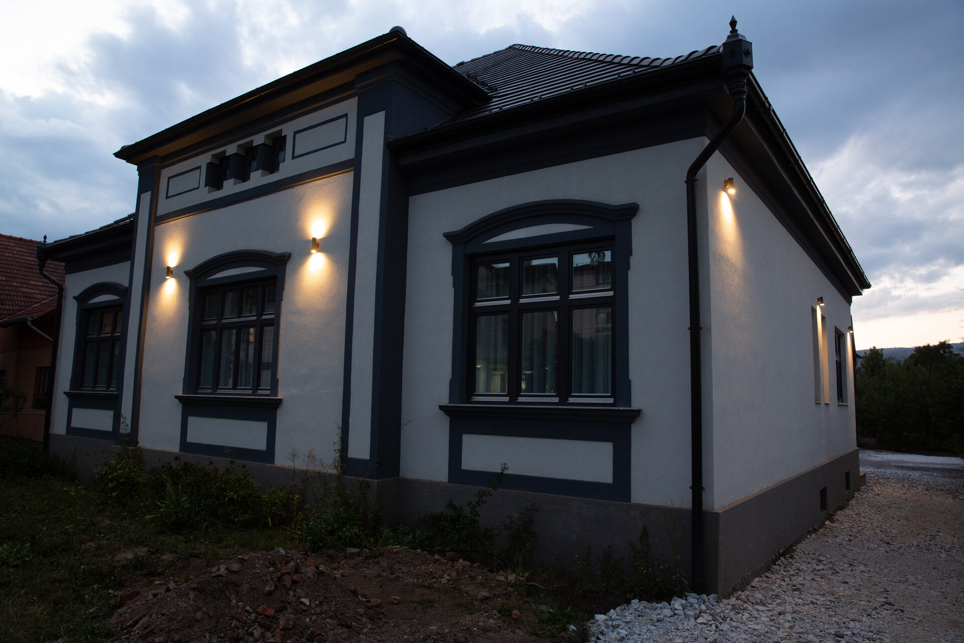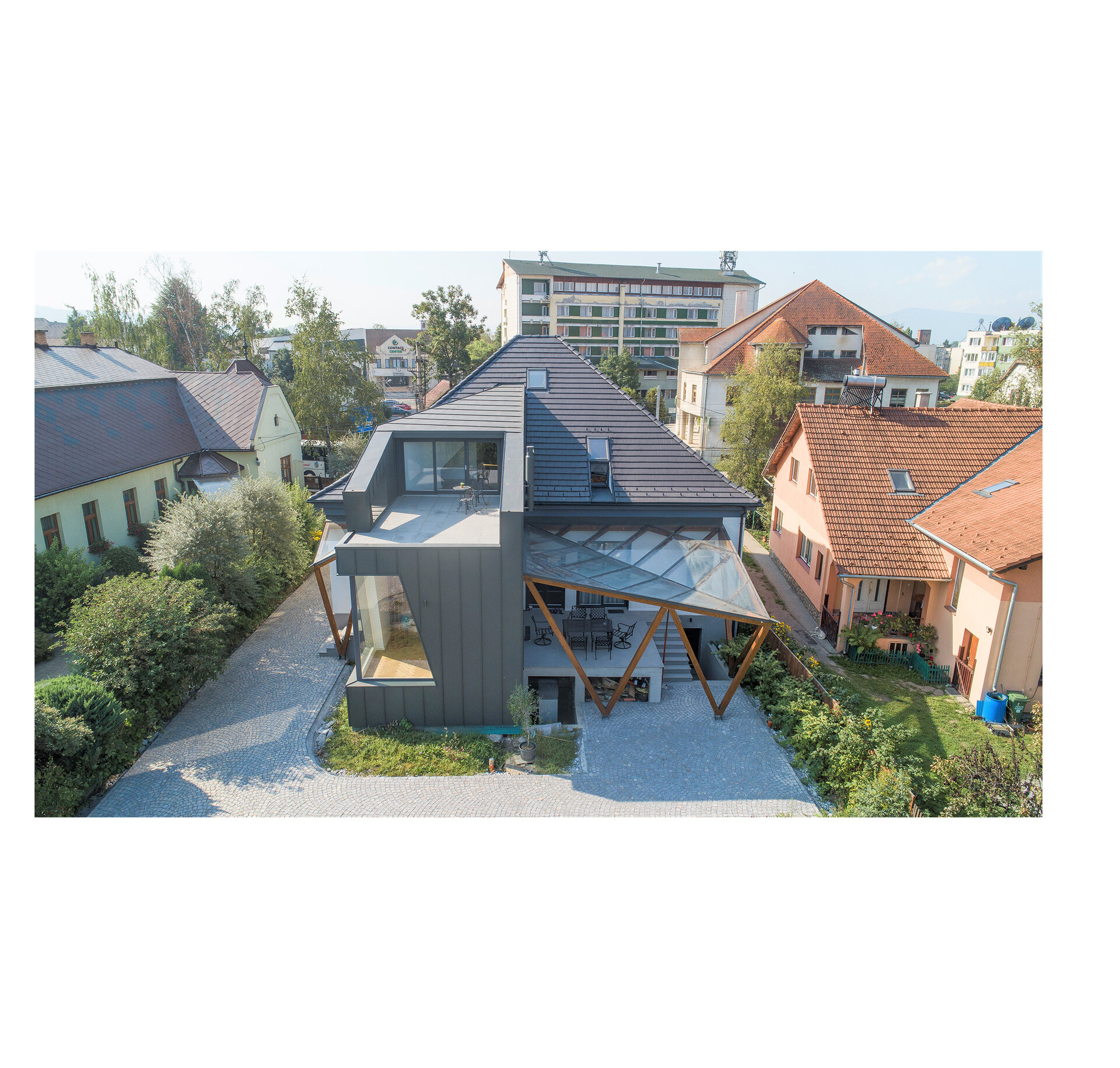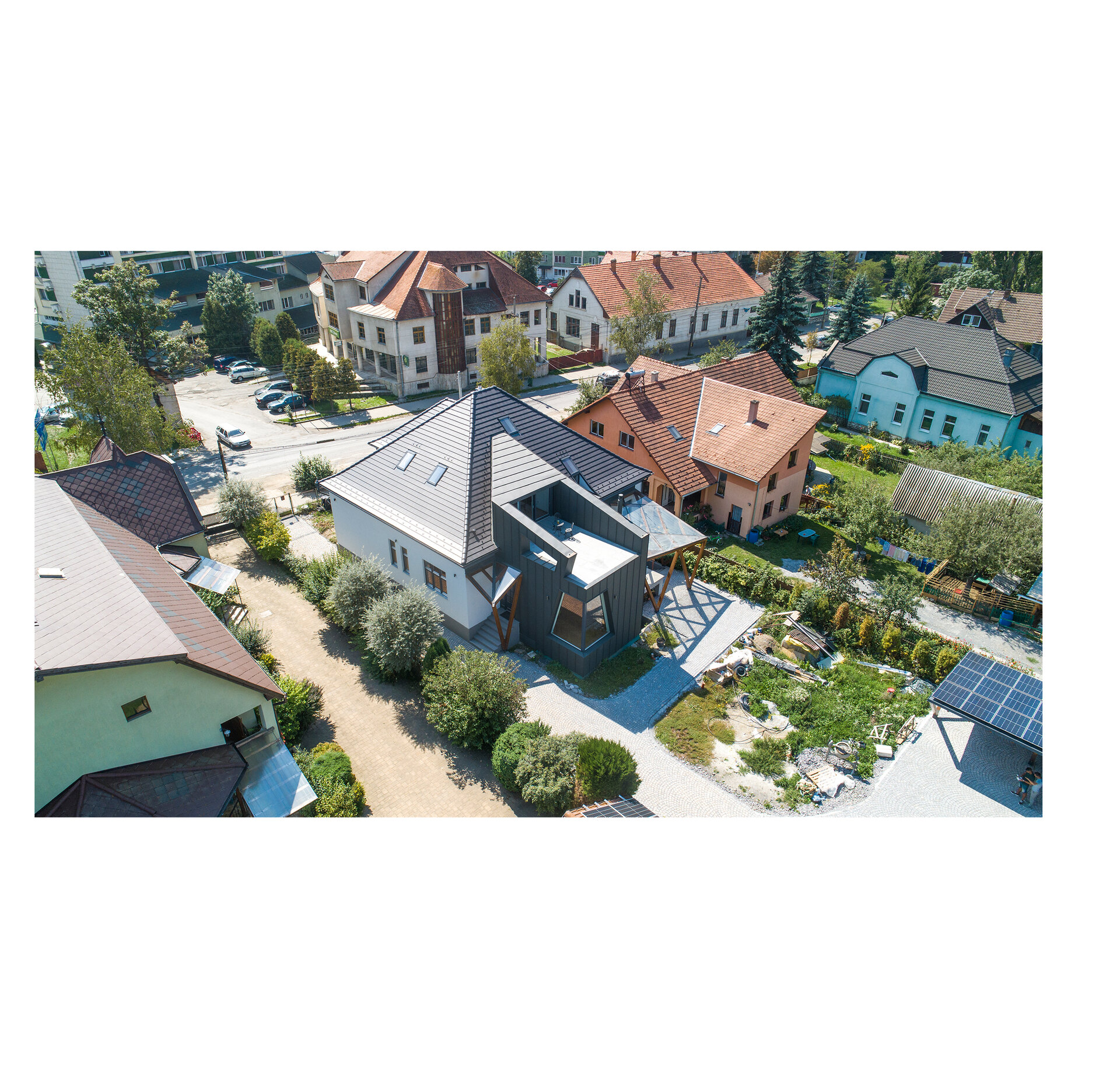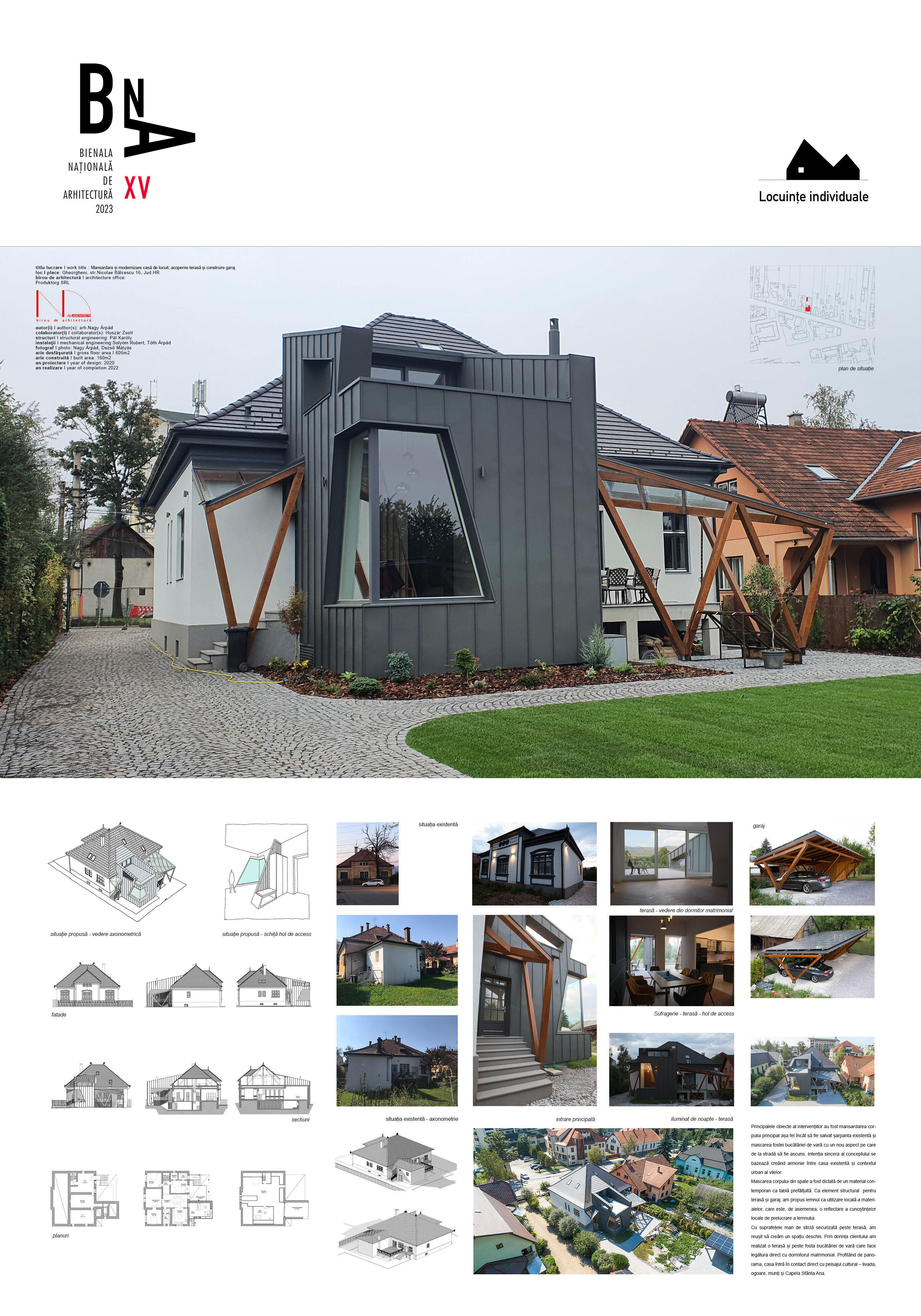 Principalul obiect al intervențiilor au fost mansardarea corpului principal așa fel încât să fie salvat șarpanta existentă și mascarea fostei bucătăriei de vară cu un nou aspect estetic. Intenția sincera al conceptului se bazează creând armonie între casa existentă și contextul urban al vilelor. Mascarea corpului din spate a fost dictată de un material contemporan ca tablă prefălțuită. Ca element structural pentru terasă și garaj, am propus lemnul ca utilizare locală a materialelor, care este, de asemenea, o reflectare a cunoștințelor locale de prelucrare a lemnului. Cu suprafețele mari de sticlă securizată peste terasă, am reușit să creăm un spațiu deschis. Prin dorința clientului am realizat o terasă și peste fosta bucătăriei de vară care face legătura direct cu dormitorul matrimonial. Profitând de panorama, casa întră în contact direct cu peisajul cultural – livada, ogoare, munți și Capela Sfânta Ana.