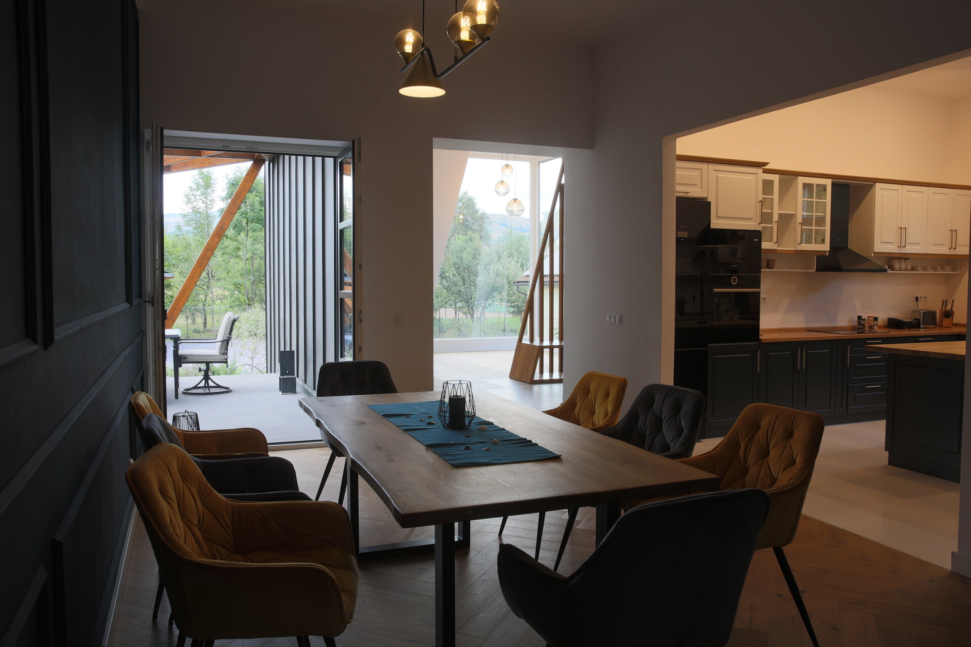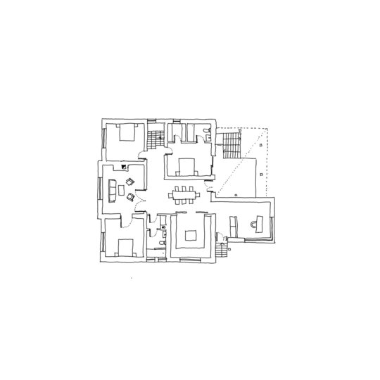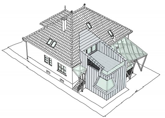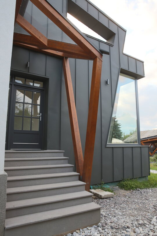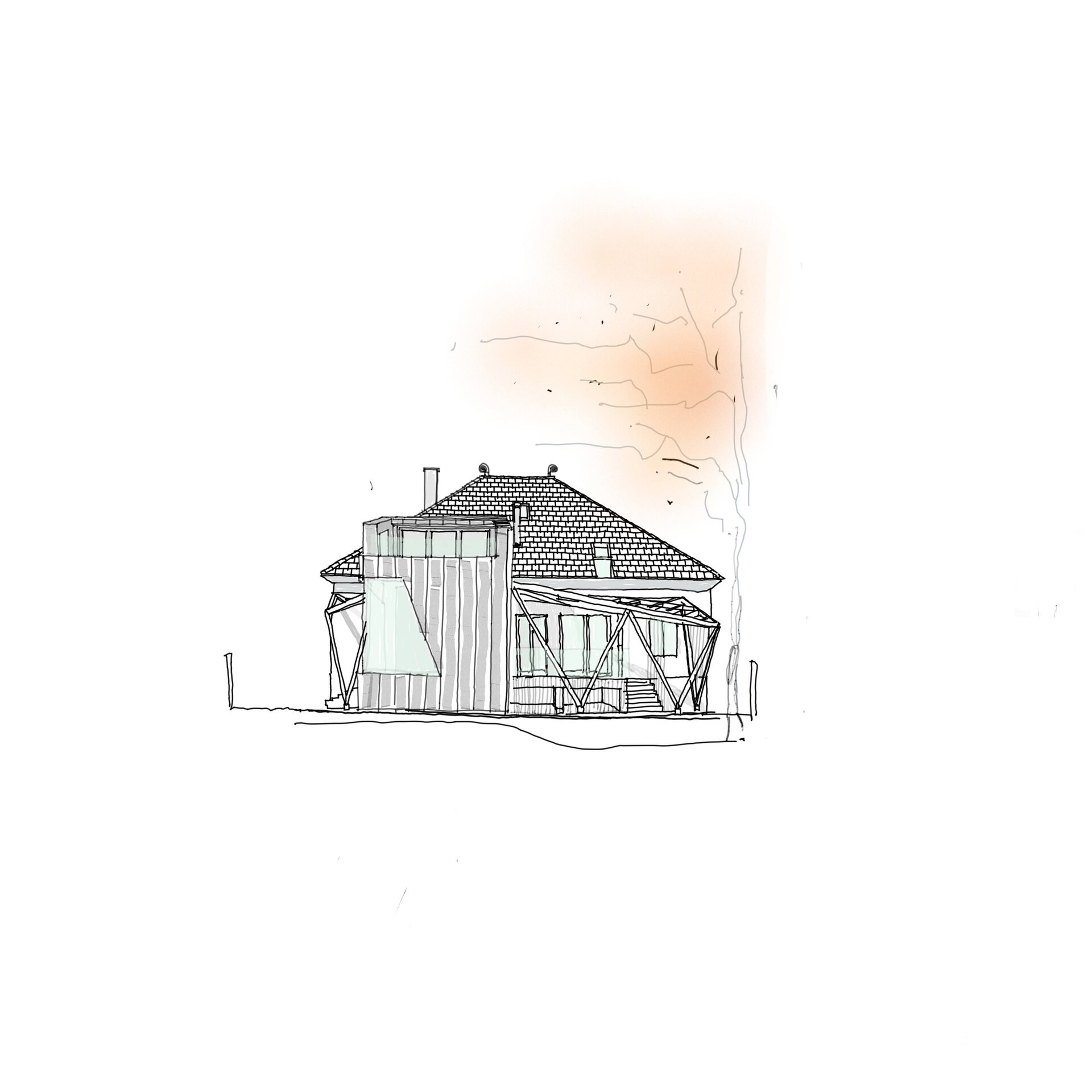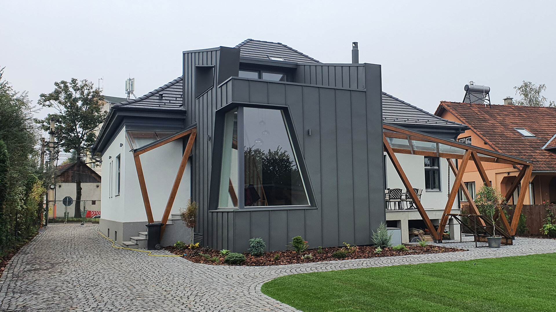 Principalul obiect al intervențiilor au fost mansardarea corpului principal așa fel încât să fie salvat șarpanta existentă și mascarea fostei bucătăriei de vară cu un nou aspect estetic. Intenția sincera al conceptului se bazează creând armonie între casa existentă și contextul urban al vilelor. Mascarea corpului din spate a fost dictată de un material contemporan ca tablă prefălțuită. Ca element structural pentru terasă și garaj, am propus lemnul ca utilizare locală a materialelor, care este, de asemenea, o reflectare a cunoștințelor locale de prelucrare a lemnului. Cu suprafețele mari de sticlă securizată peste terasă, am reușit să creăm un spațiu deschis. Prin dorința clientului am realizat o terasă și peste fosta bucătăriei de vară care face legătura direct cu dormitorul matrimonial. Profitând de panorama, casa întră în contact direct cu peisajul cultural – livada, ogoare, munți și Capela Sfânta Ana.