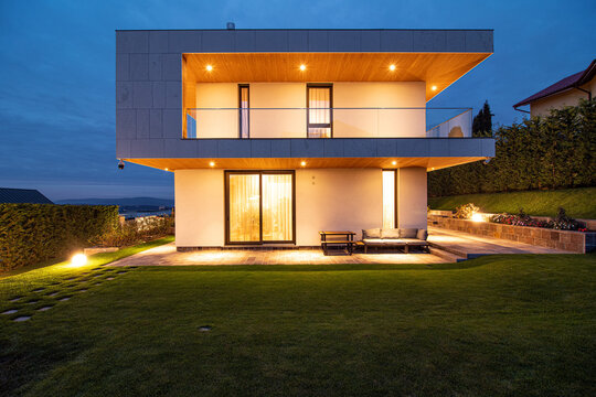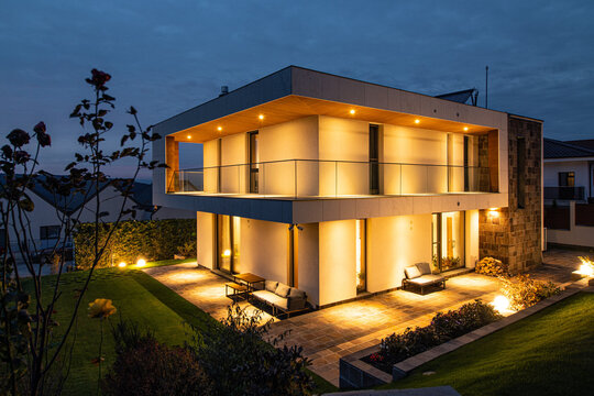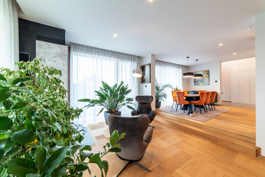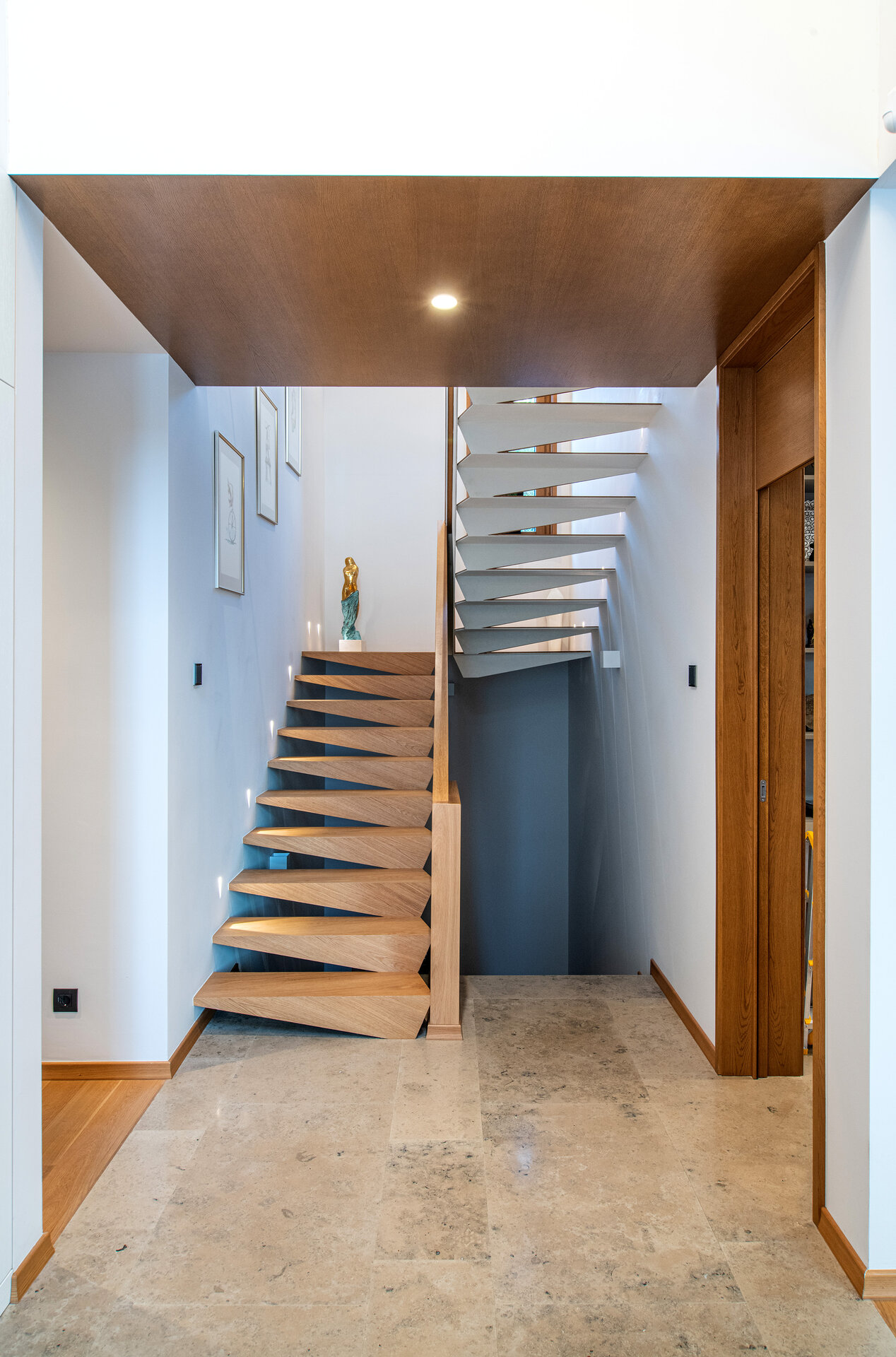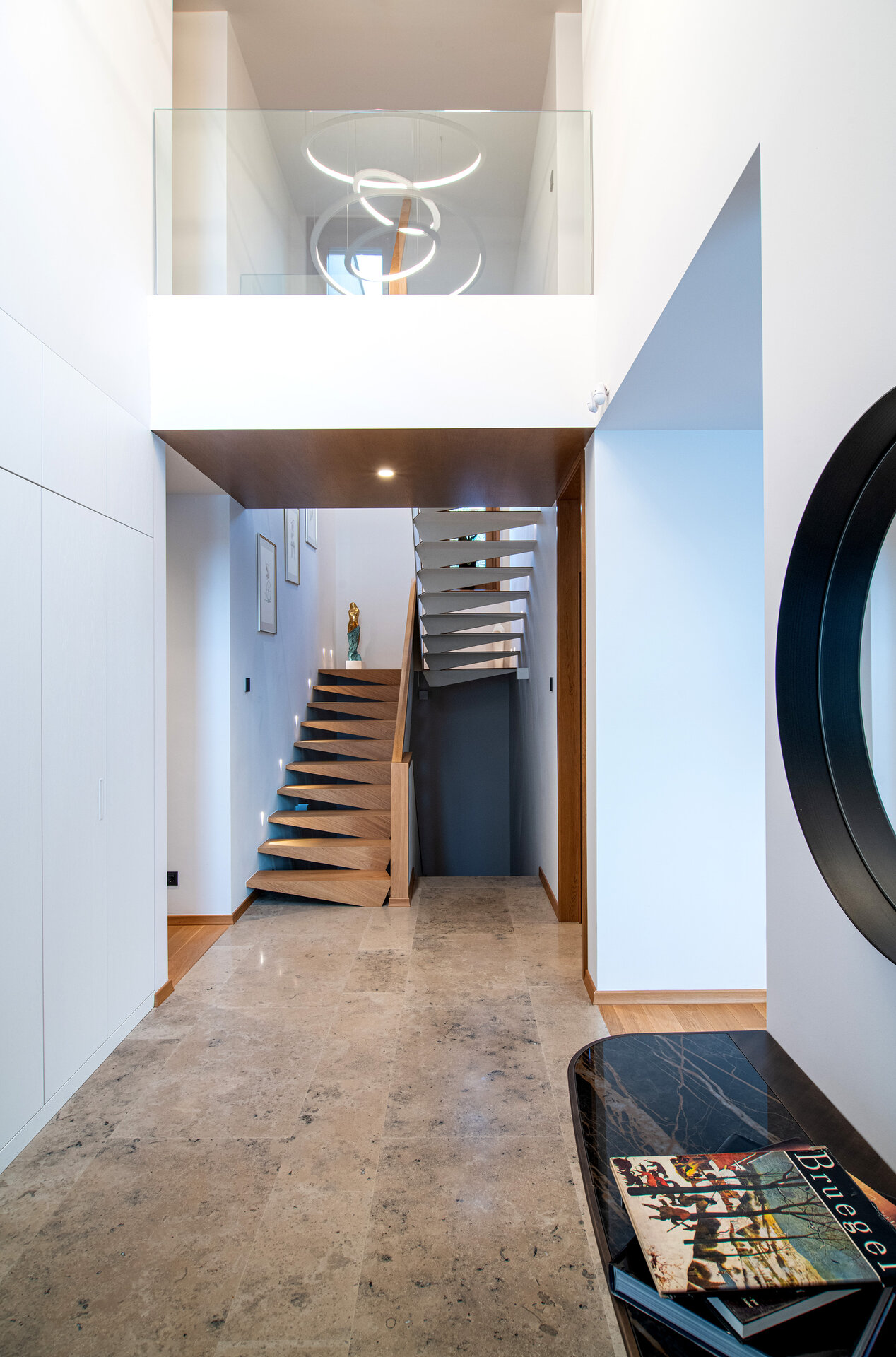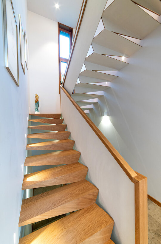 Conceptul de design interior este unul modern, funcțional, cu linii clare ce integrează în diferite moduri materiale naturale precum lemnul și piatra. Un element important în compoziție a fost „coloana vertebrală a casei” – scara, ce aduce puțină savoare alături de accentele de culoare și corpurile de iluminat.