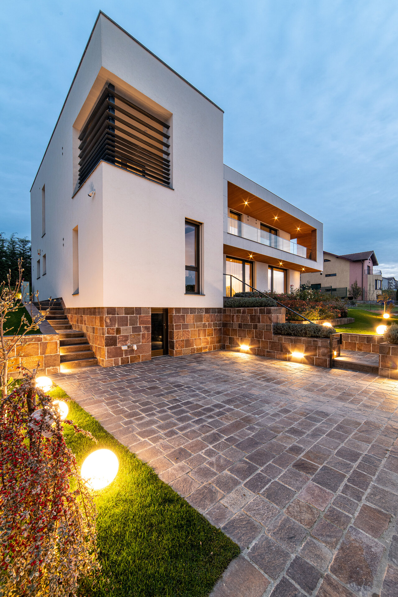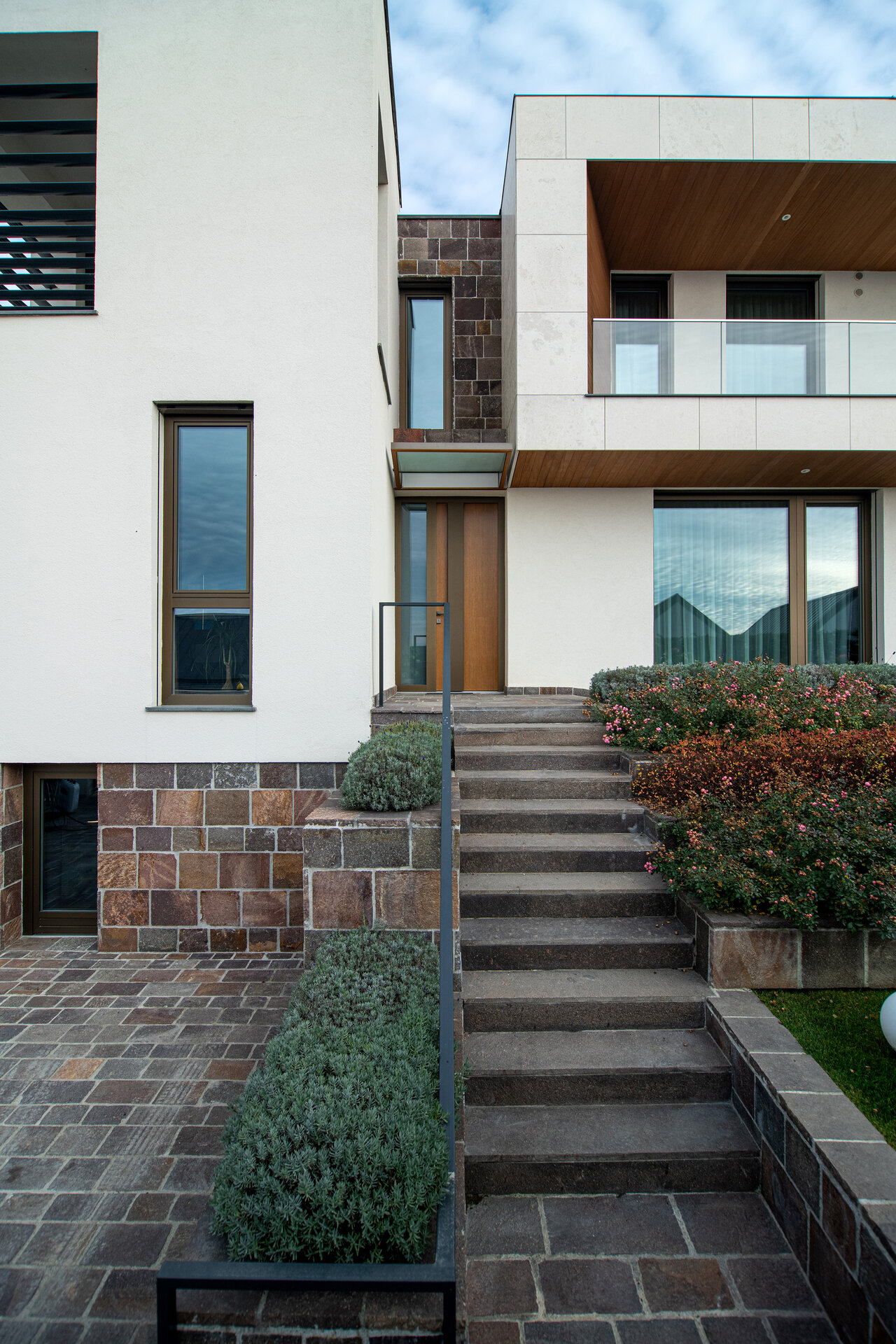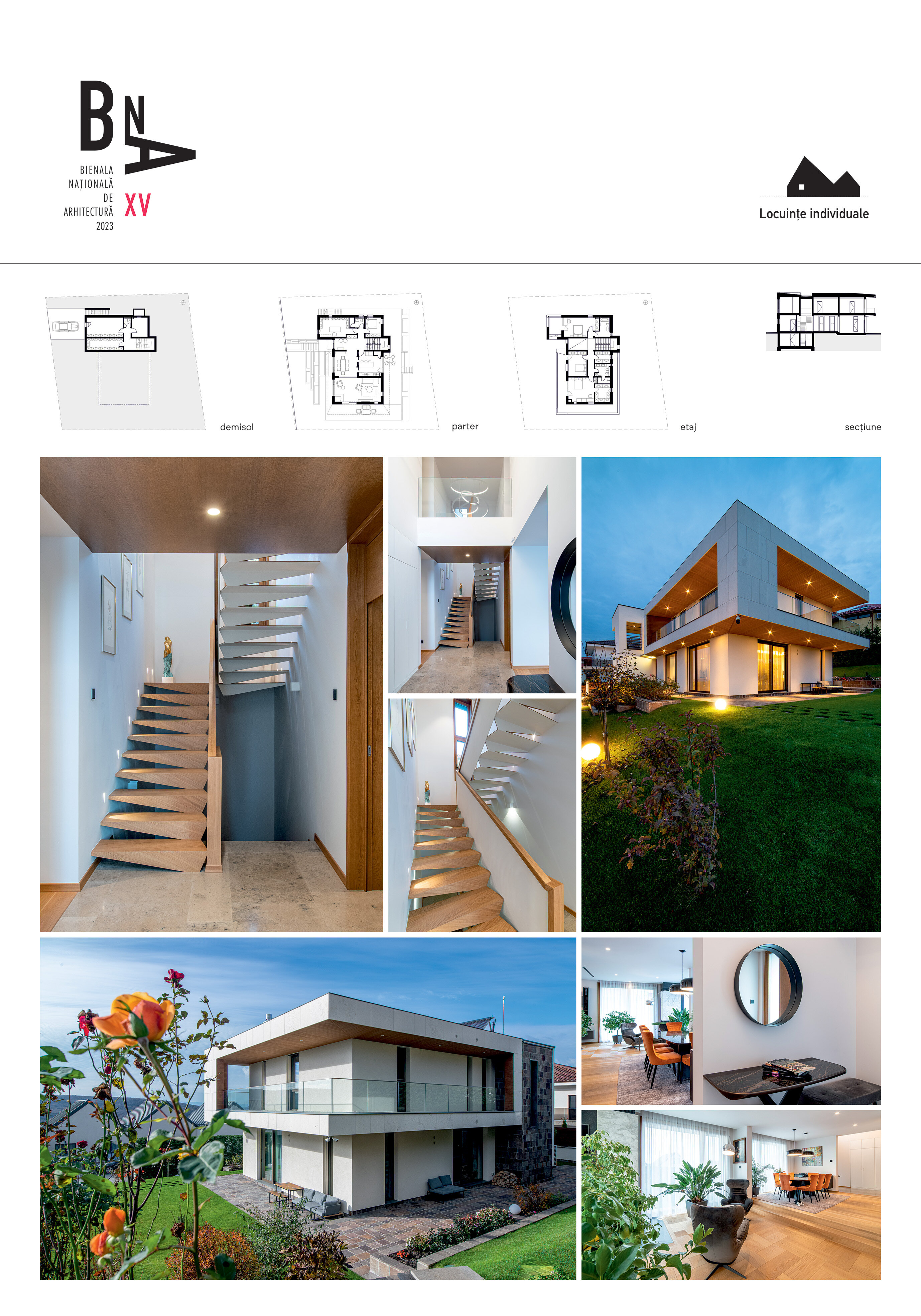 Spre vecinătățile deja constituite compoziția este mai ermetică, comunicând discret organizarea interioară. Vitrajele generoase și deschise încadrează priveliștile exterioare dinspre gradină în diferite spații.