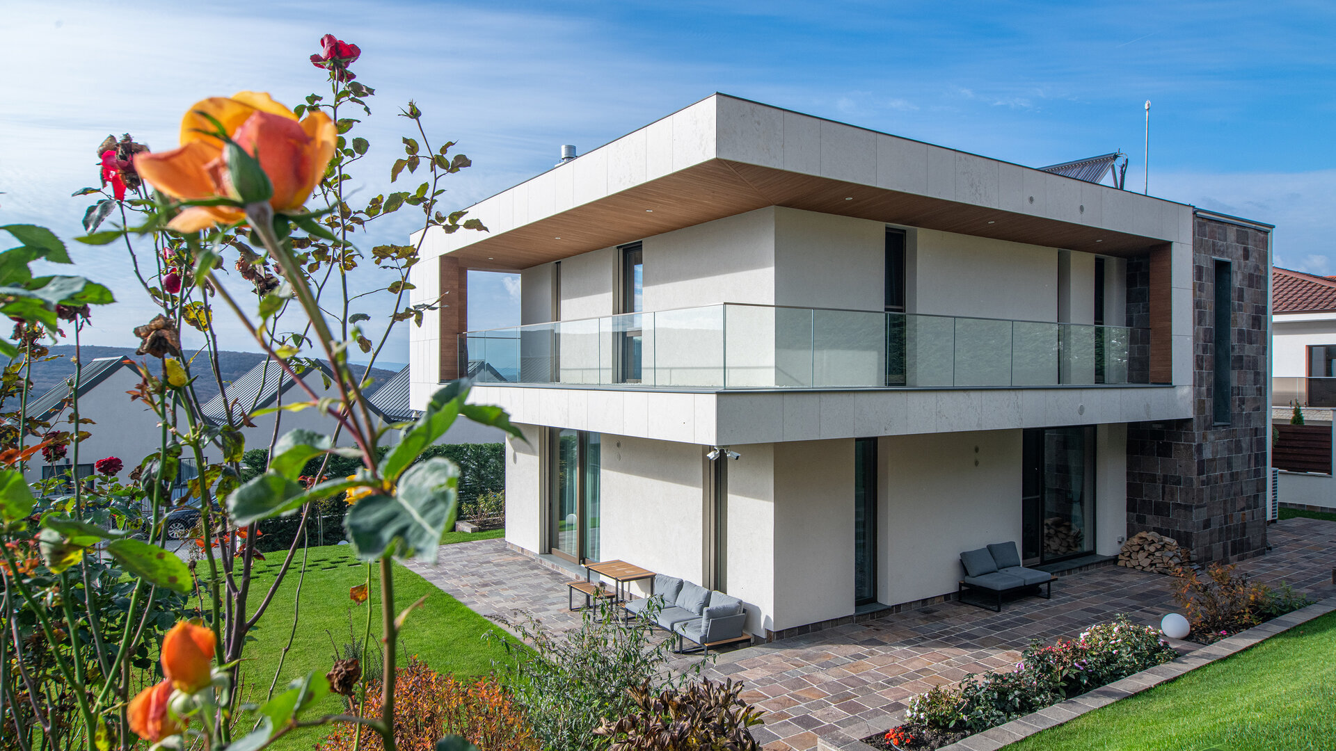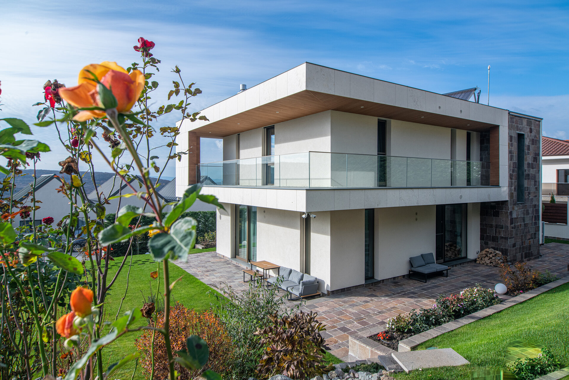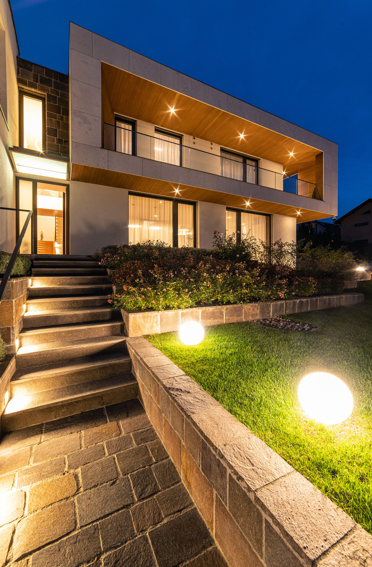 Spre vecinătățile deja constituite compoziția este mai ermetică, comunicând discret organizarea interioară. Vitrajele generoase și deschise încadrează priveliștile exterioare dinspre gradină în diferite spații.