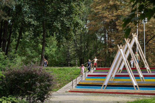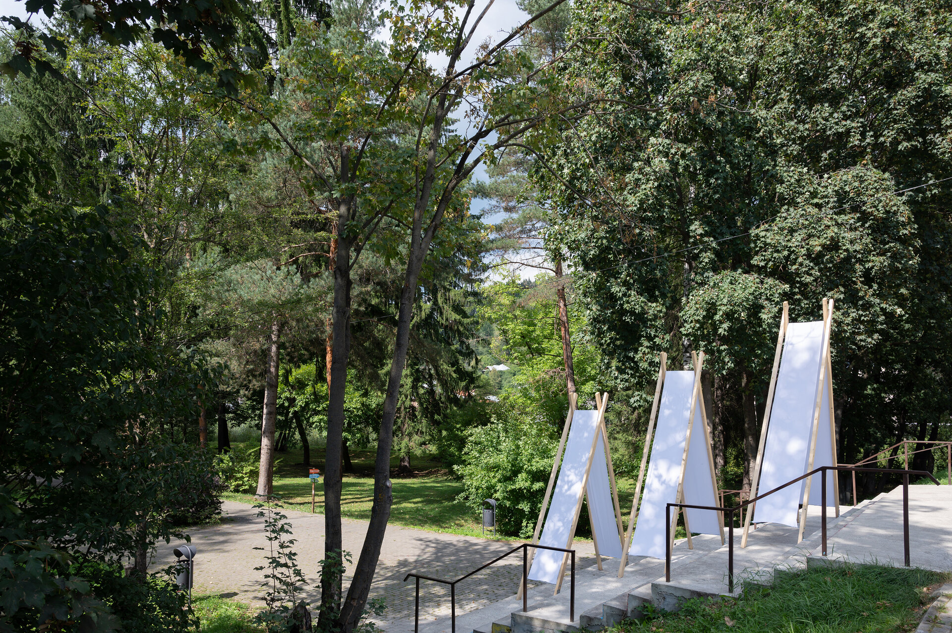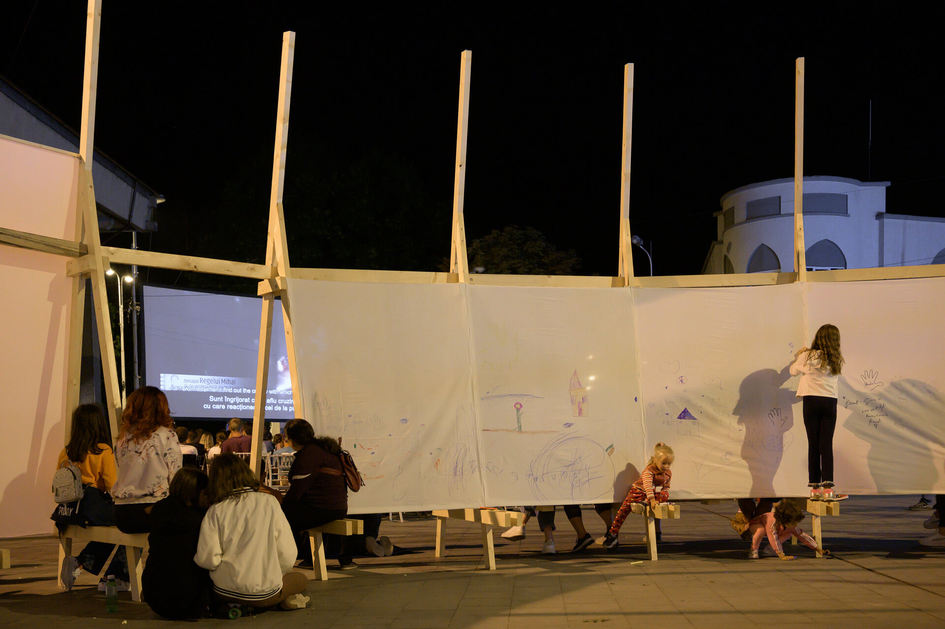 Pavilionul marchează intrarea în Parcul Eminescu, un punct intermediar pe traseul obiectivelor principale din timpul festivalului- proiecțiile de film în aer liber. Acestea sunt amplasate pe treptele de acces, la cote diferite si acționează mai mult ca un semnal de ghidare. Pânzele albe care acoperă structura reprezintă, ca și în cazul pavilionului central, elementul de interacțiune cu oamenii. Aceștia pot scrie, desena gânduri, impresii, mesaje pe suportul alb, ca simbol al apartenenței la această comunitate a orașului.