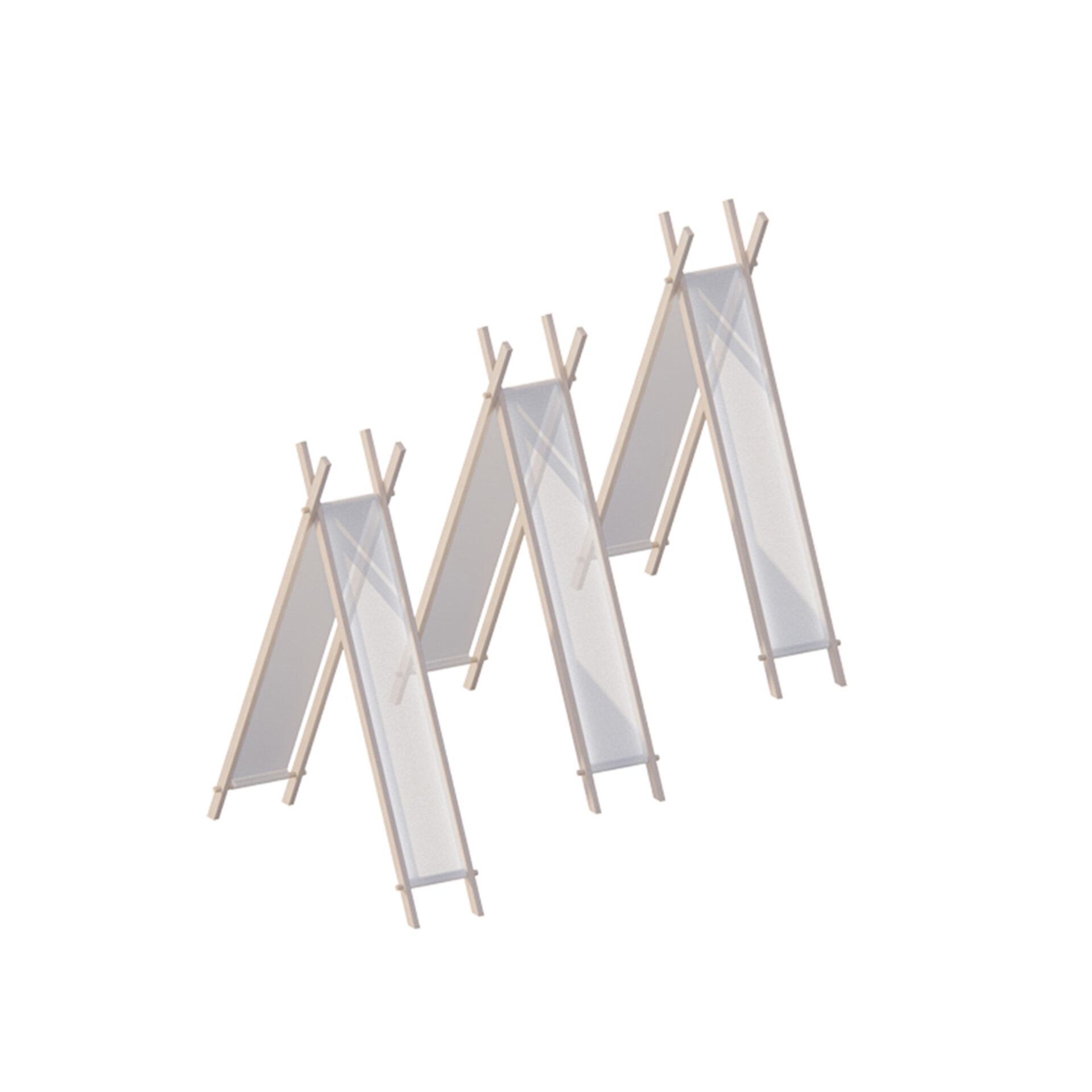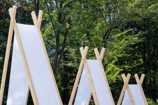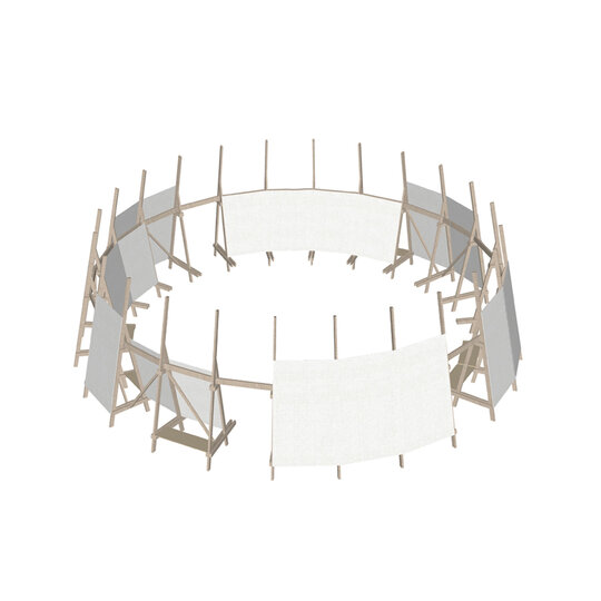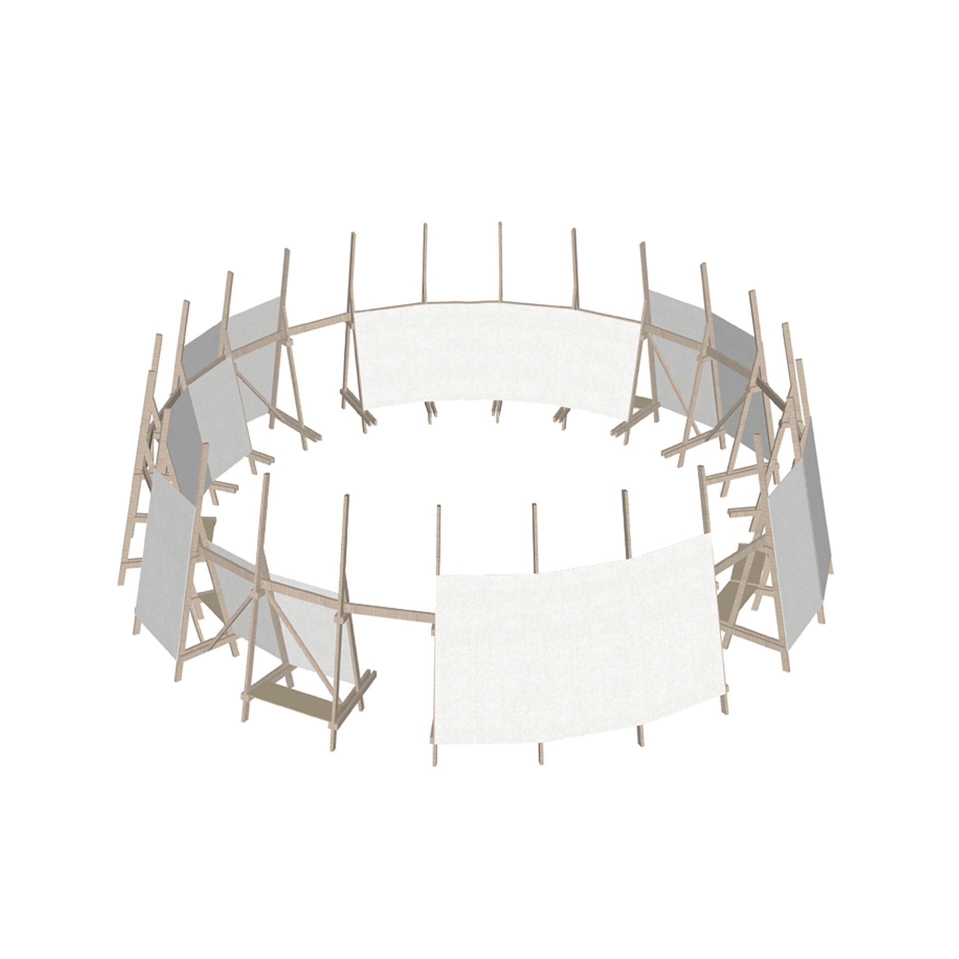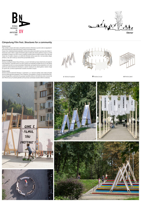 Pavilioanele sunt realizate din materiale locale, prezența lor fiind una reversibilă. Acestea folosesc un limbaj arhitectural comun, atât prin formă cât și prin materialele folosite: lemn și pânză albă. Pentru a facilita procesul constructiv și a reutiliza corpurile în alte ediții de festival sau cu alte ocazii, principiul structural este repetiția unor module nedeformabile cu îmbinări simple; modulele sunt prinse între ele cu tije filetate și piulițe pentru a putea fi ușor dezasamblate ulterior.