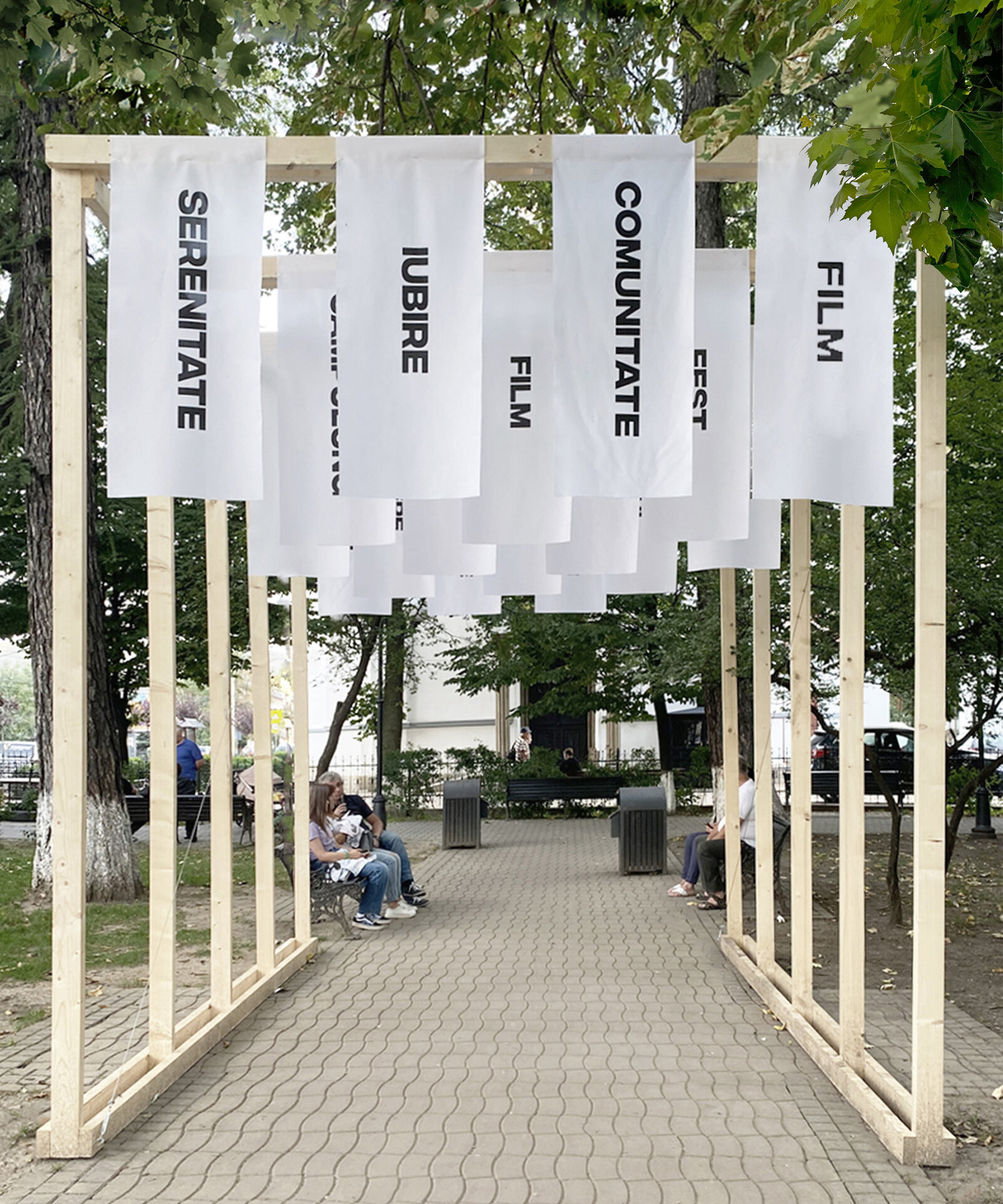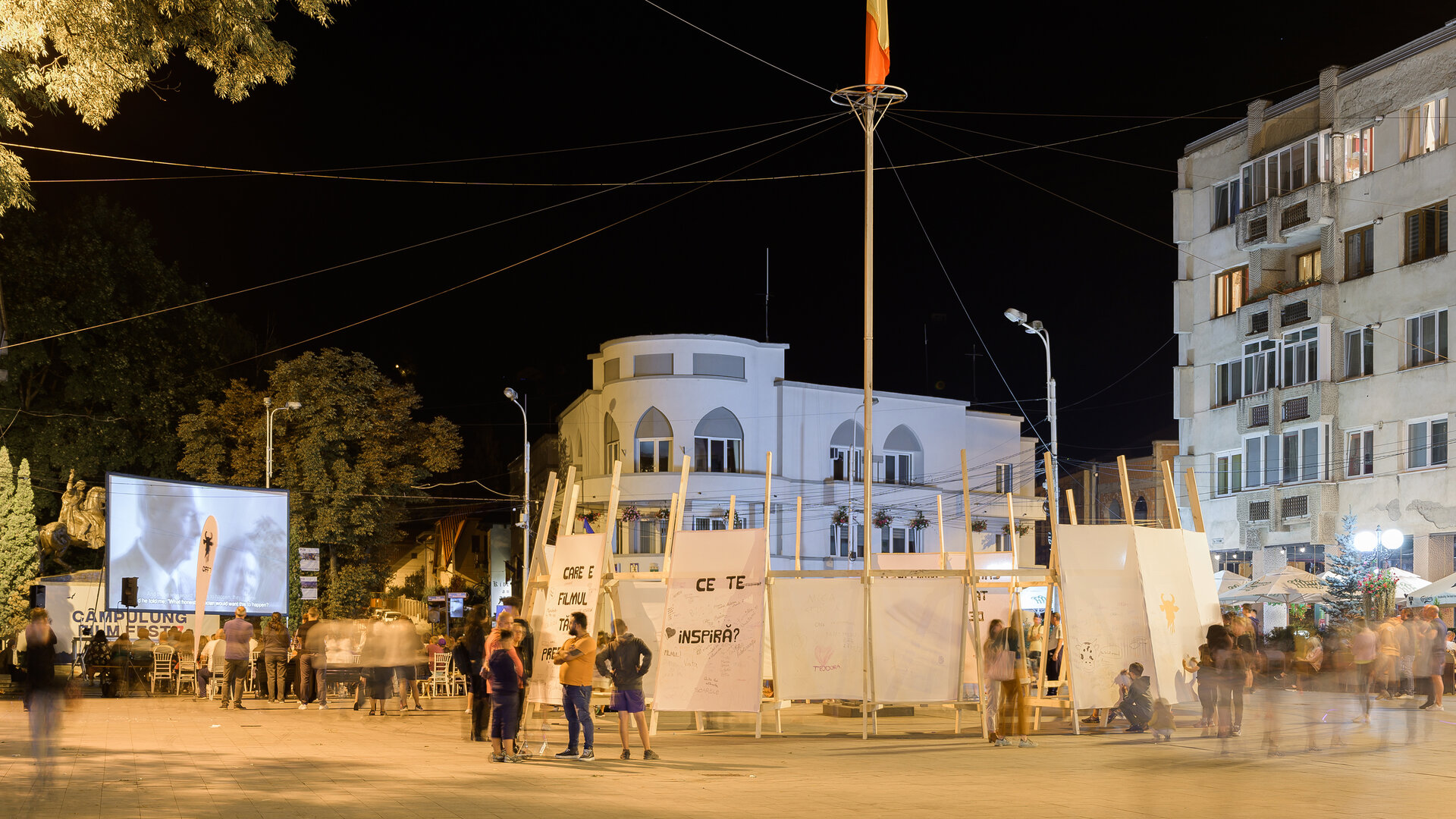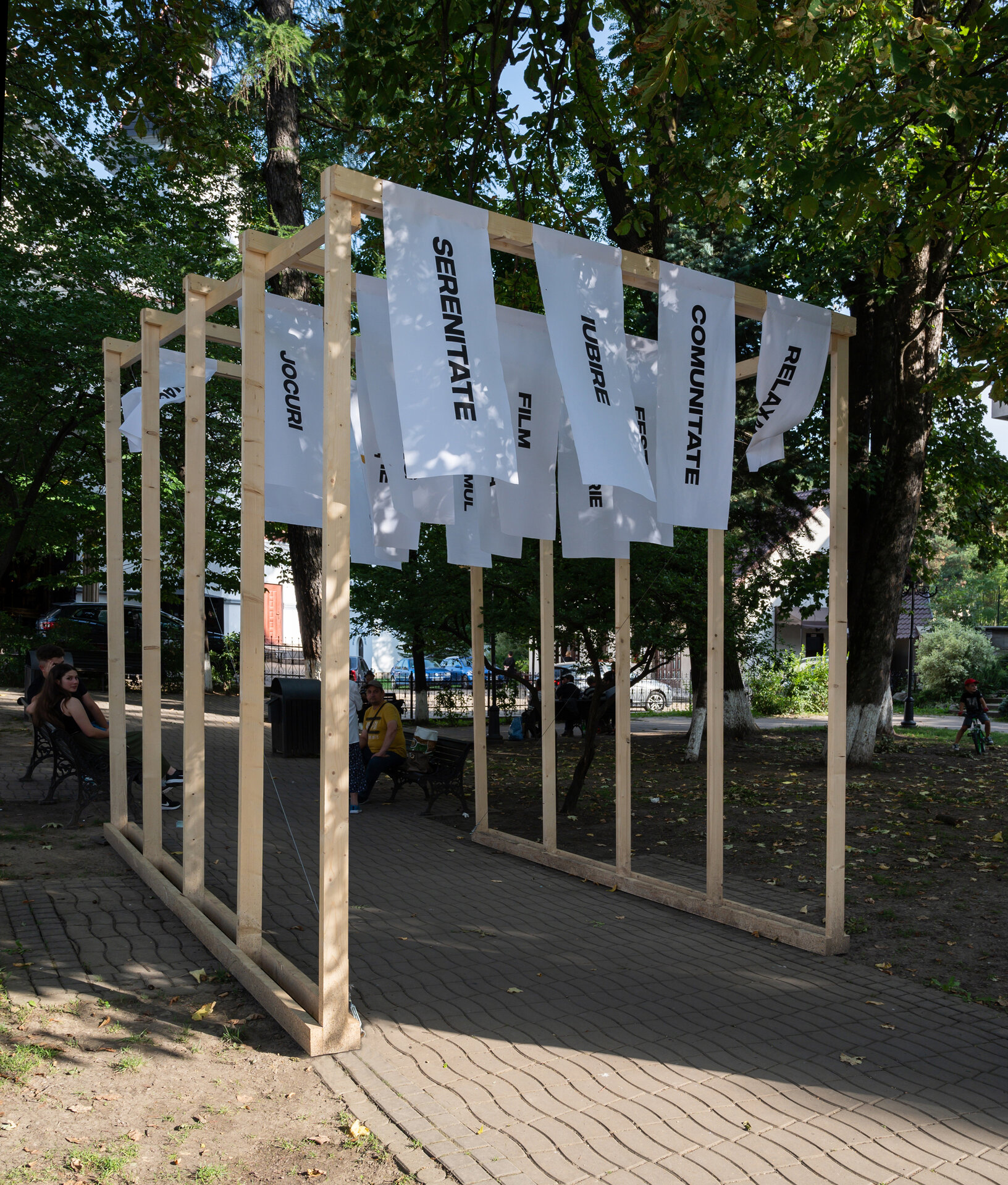 Pavilionul prezintă obiectivele festivalului și acționează ca un semnal de ghidare către locația principală. Structura dreptunghiulară amplasata în Parcul Orășenesc a fost gândită ca o poartă, iar dimensionarea acesteia pe întreaga lățime a pietonalului face aproape imposibilă ocolirea lui. Ești astfel atras către o structură de lemn filiformă care, prin prezența pânzelor prinse punctual, accentuează caracterul efemer al obiectului. Spre deosebire de celelalte două pavilioane, pânzele acestuia sunt folosite pentru a transmite mesaje către comunitate, pe ele fiind tipărite cuvinte cheie, simbolice.