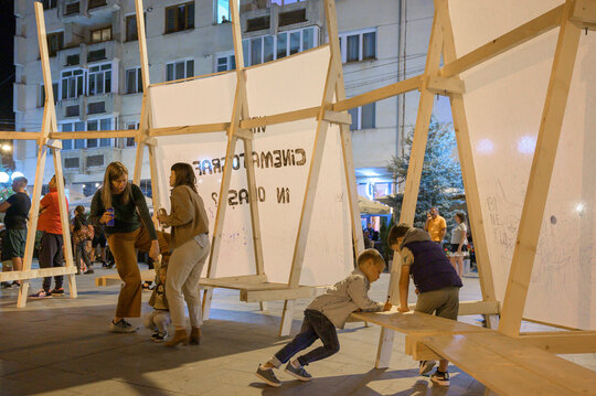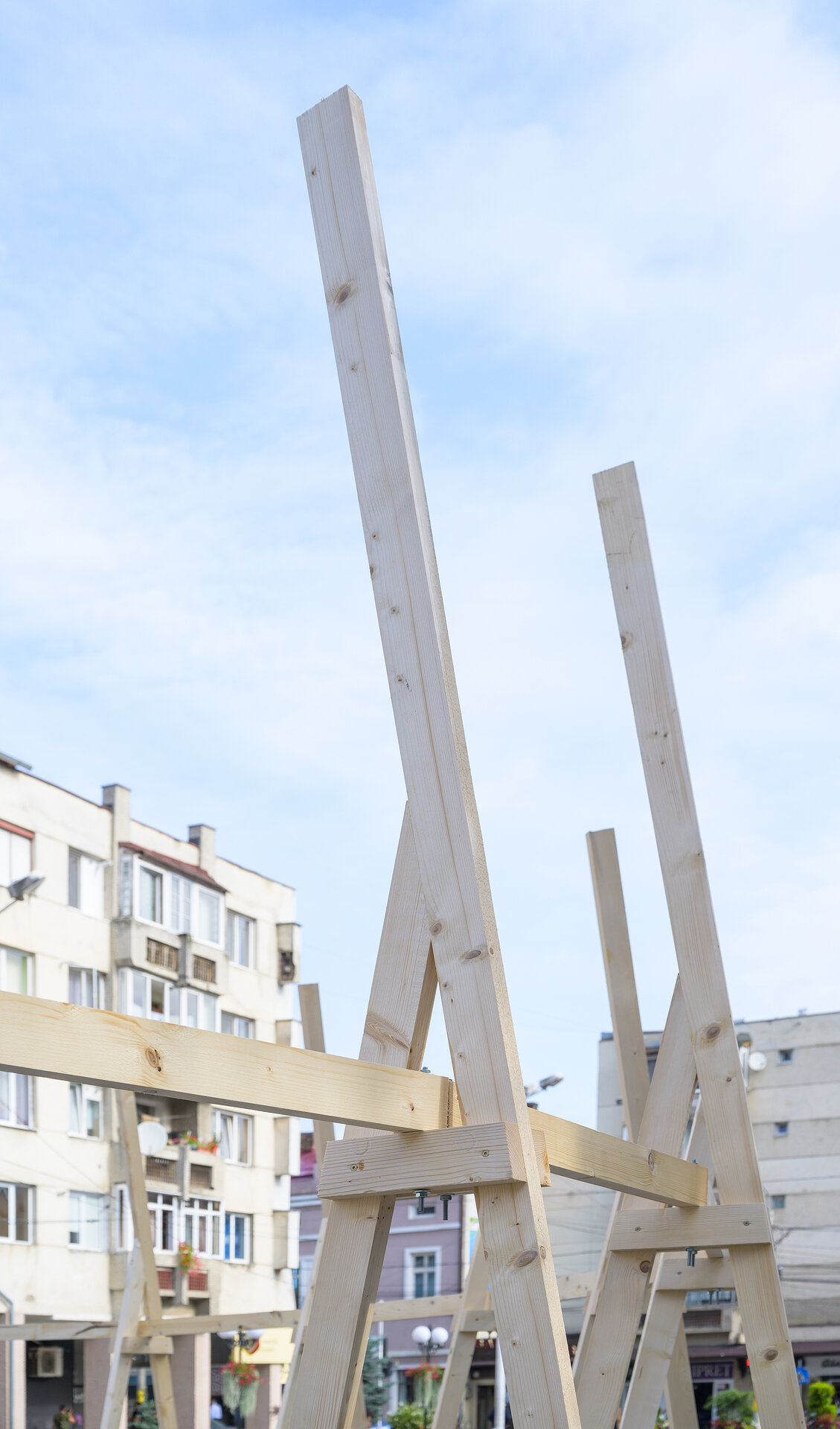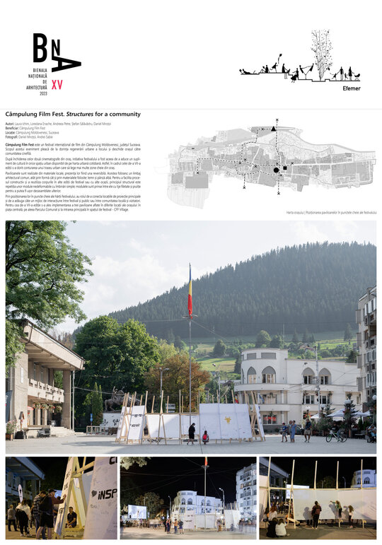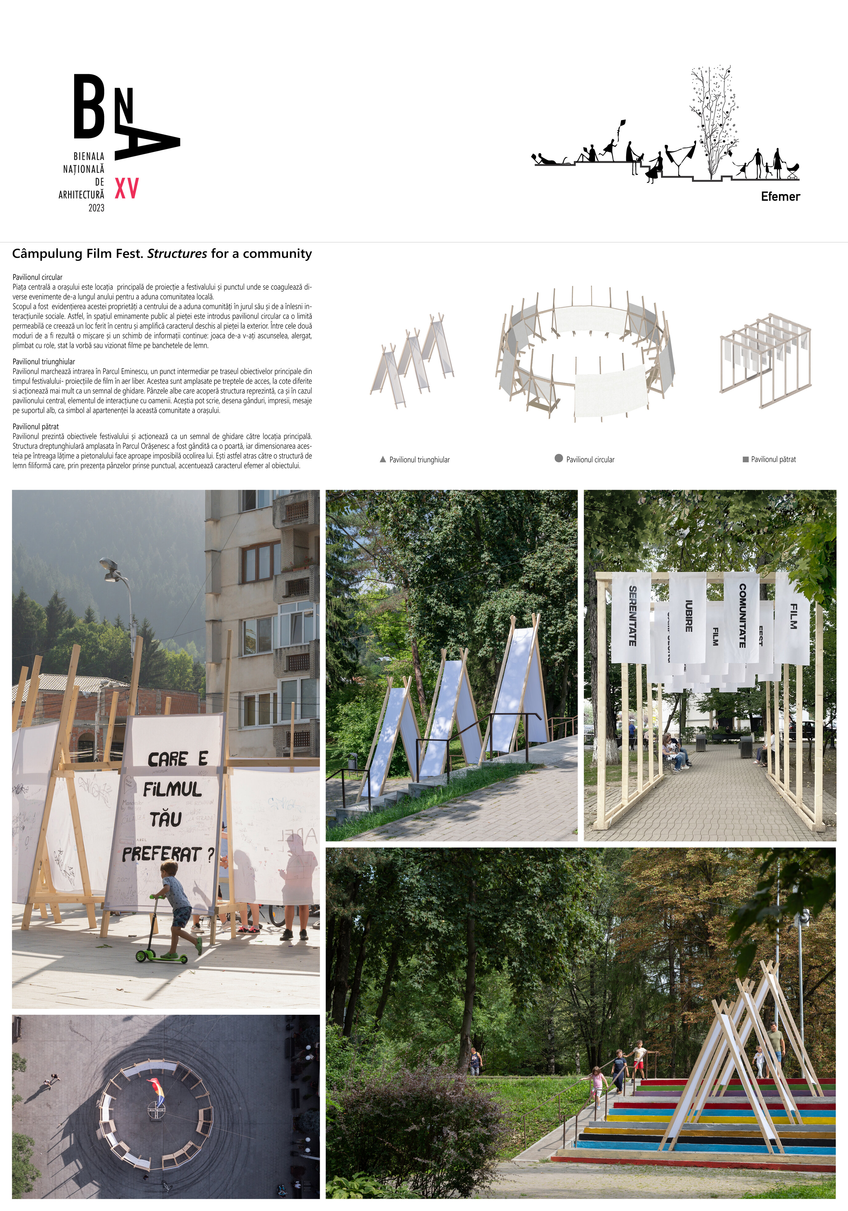 Pavilionul prezintă obiectivele festivalului și acționează ca un semnal de ghidare către locația principală. Structura dreptunghiulară amplasata în Parcul Orășenesc a fost gândită ca o poartă, iar dimensionarea acesteia pe întreaga lățime a pietonalului face aproape imposibilă ocolirea lui. Ești astfel atras către o structură de lemn filiformă care, prin prezența pânzelor prinse punctual, accentuează caracterul efemer al obiectului. Spre deosebire de celelalte două pavilioane, pânzele acestuia sunt folosite pentru a transmite mesaje către comunitate, pe ele fiind tipărite cuvinte cheie, simbolice.