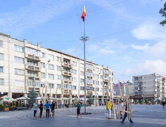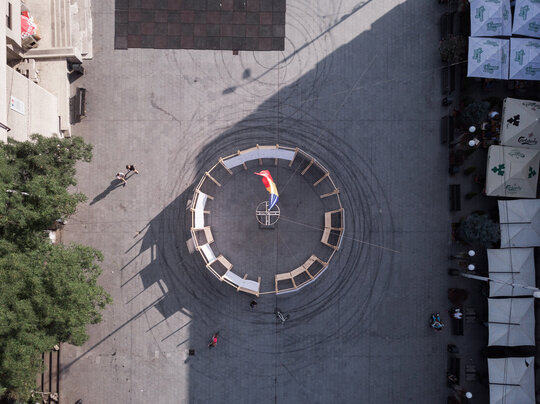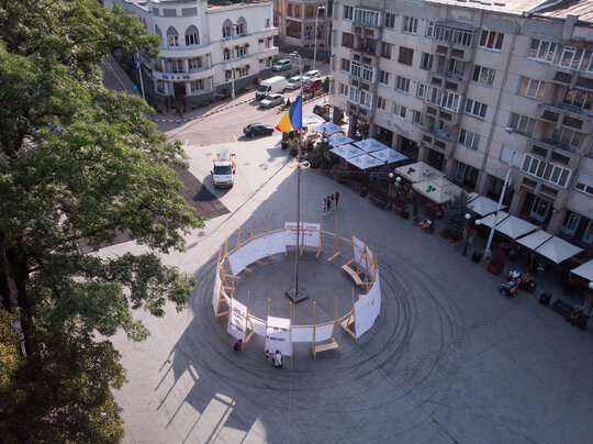 Scopul a fost evidențierea acestei proprietăți a centrului de a aduna comunități în jurul său și de a înlesni interacțiunile sociale. Astfel, în spațiul eminamente public al pieței este introdus pavilionul circular ca o limită permeabilă ce creează un loc ferit în centru și amplifică caracterul deschis al pieței la exterior. Între cele două moduri de a fi rezultă o mișcare și un schimb de informații continue: joaca de-a v-ați ascunselea, alergat, plimbat cu role, stat la vorbă sau vizionat filme pe banchetele de lemn. Pânzele albe ce leagă modulele nu sunt doar pentru a proteja și delimita spațiul interior, ele oferă un suport pentru transmiterea mesajelor, formulând participativ idei noi pentru oraș.