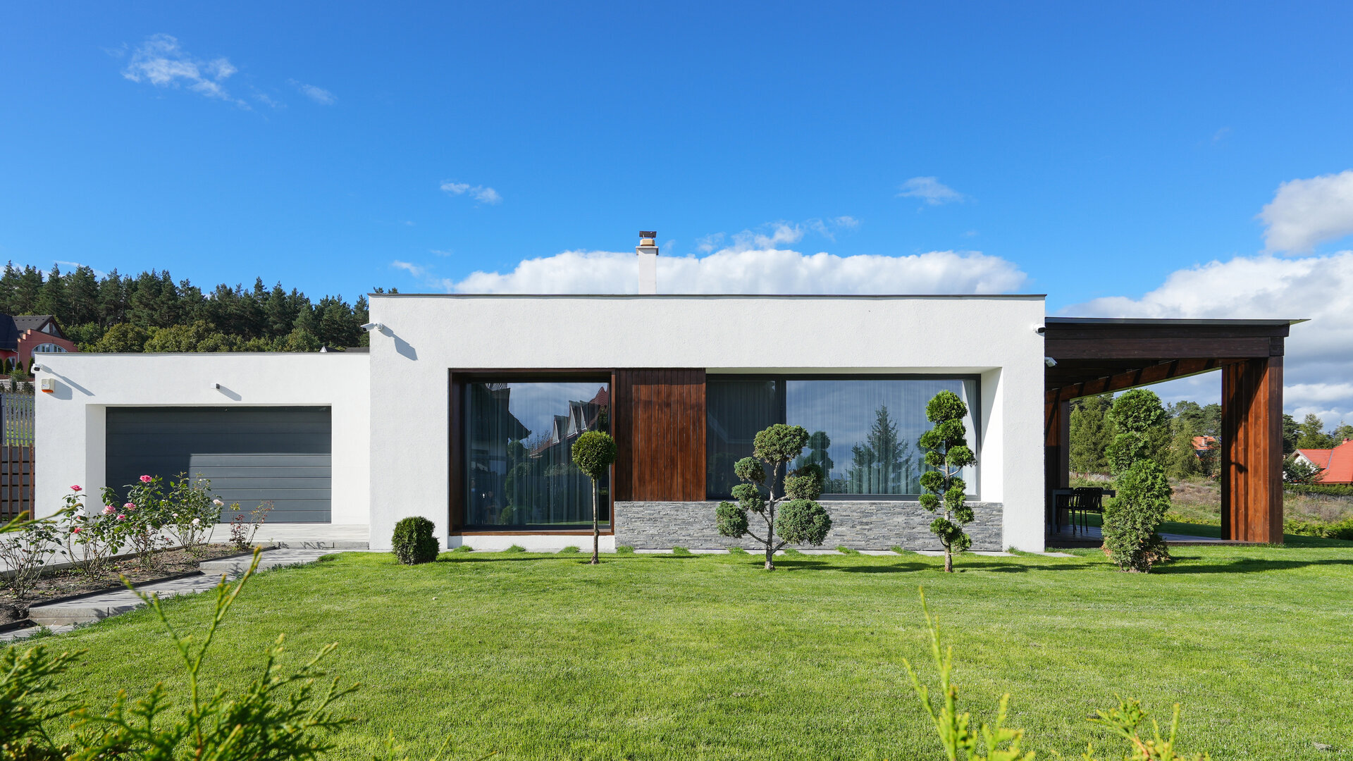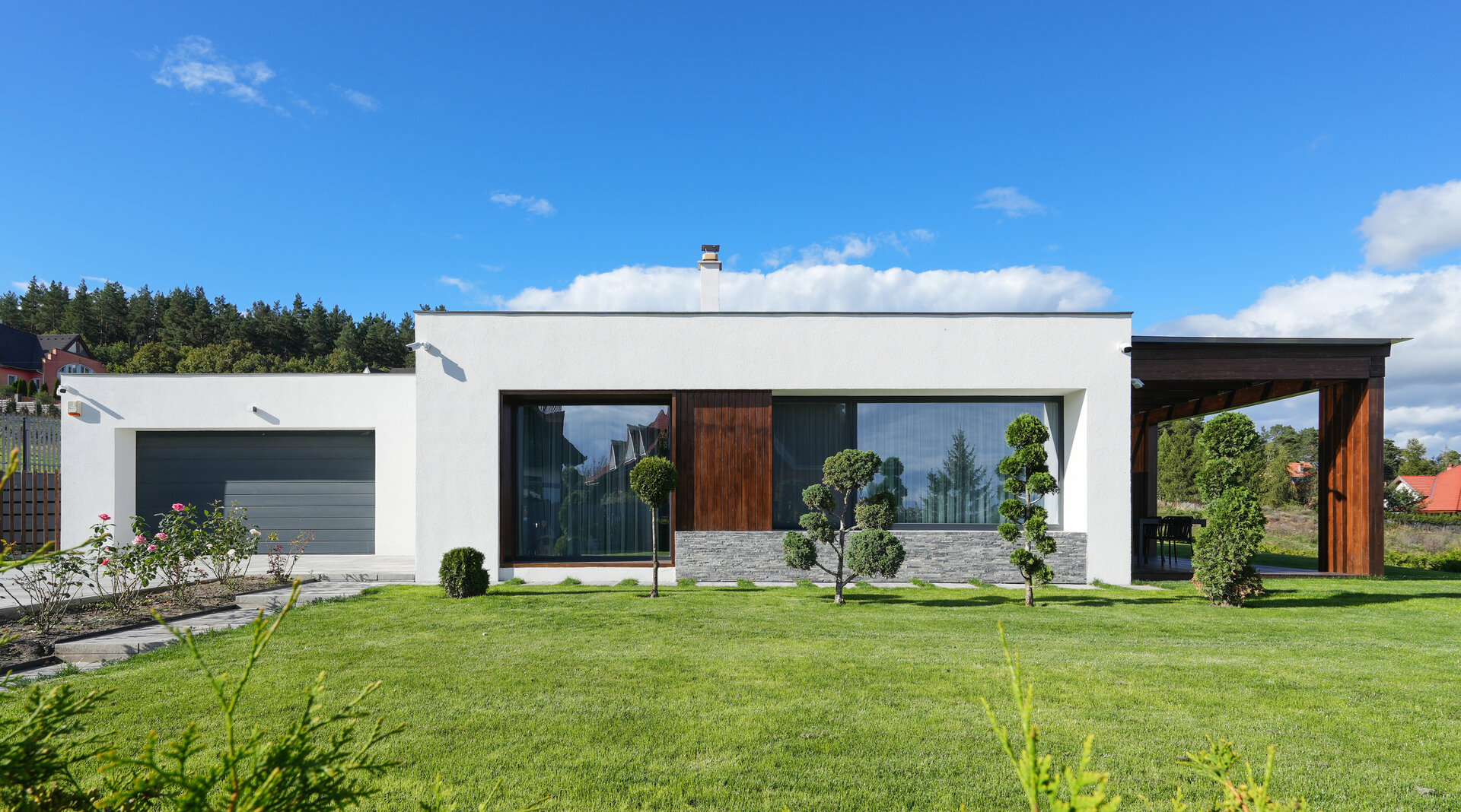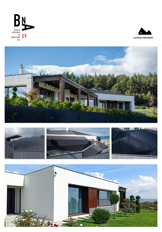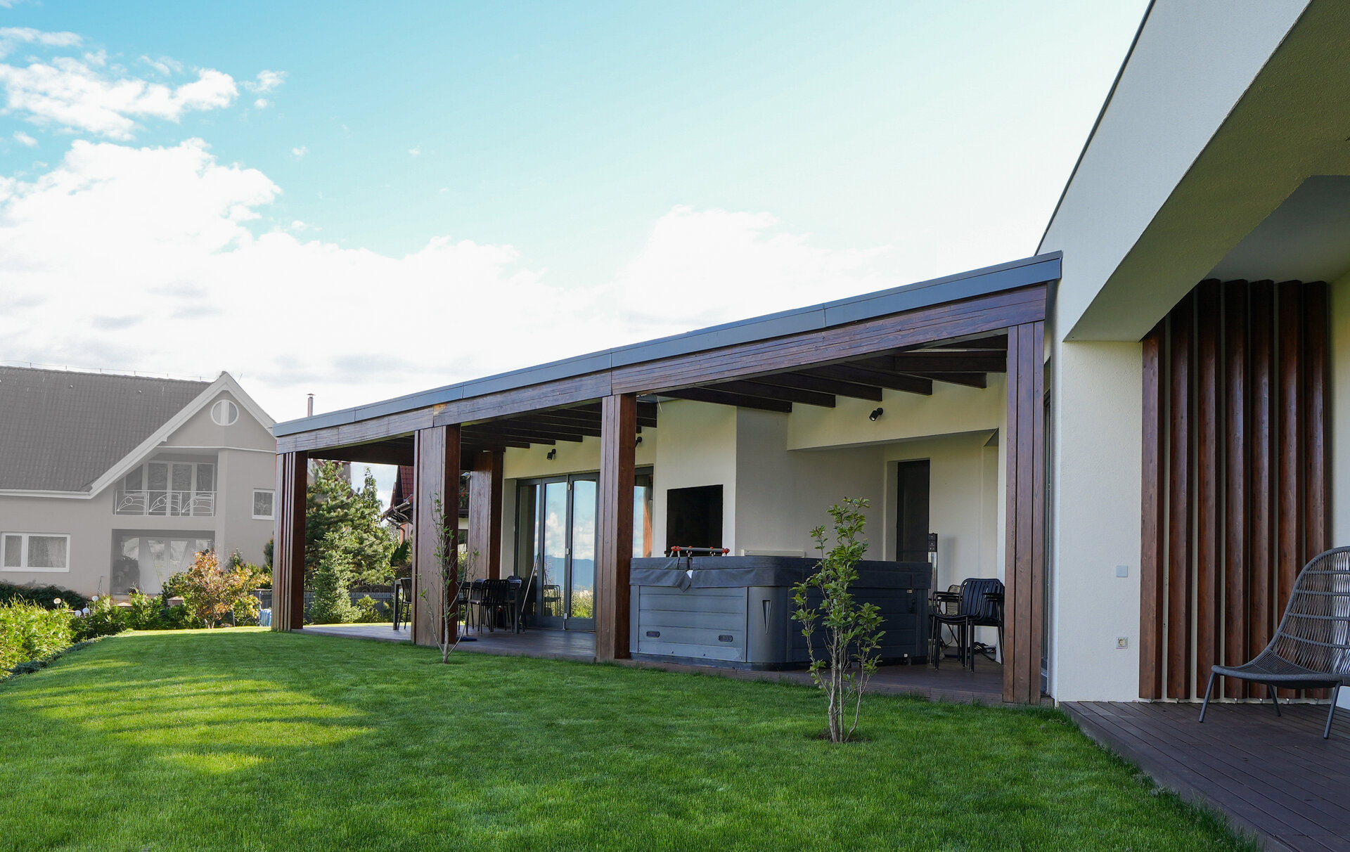 Volumele compoziției sunt simple, articulate printr-o pergolă de lemn.