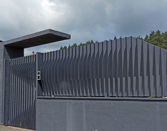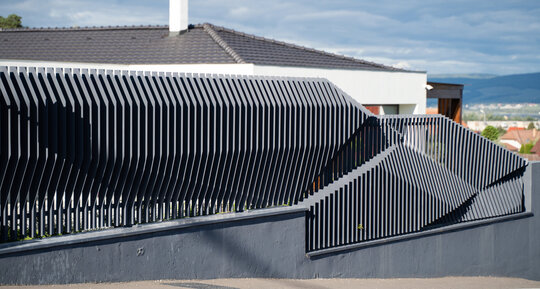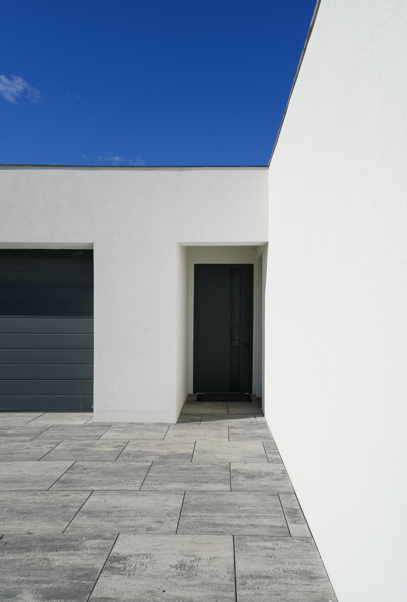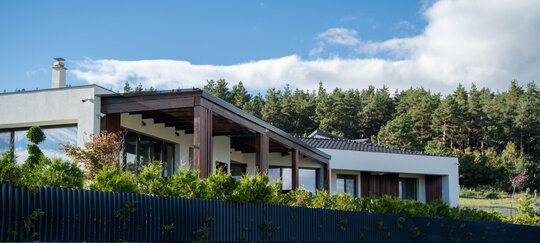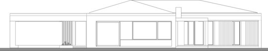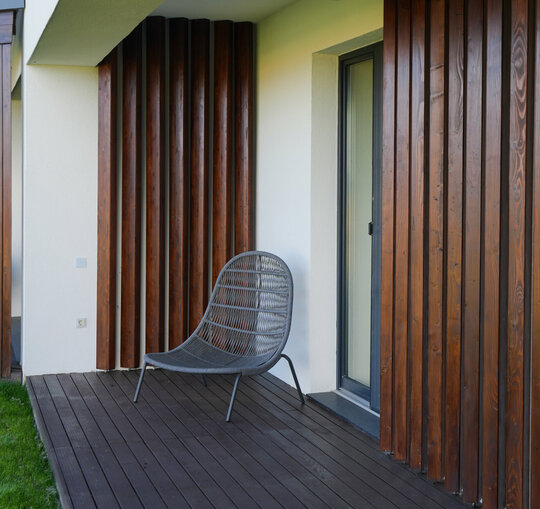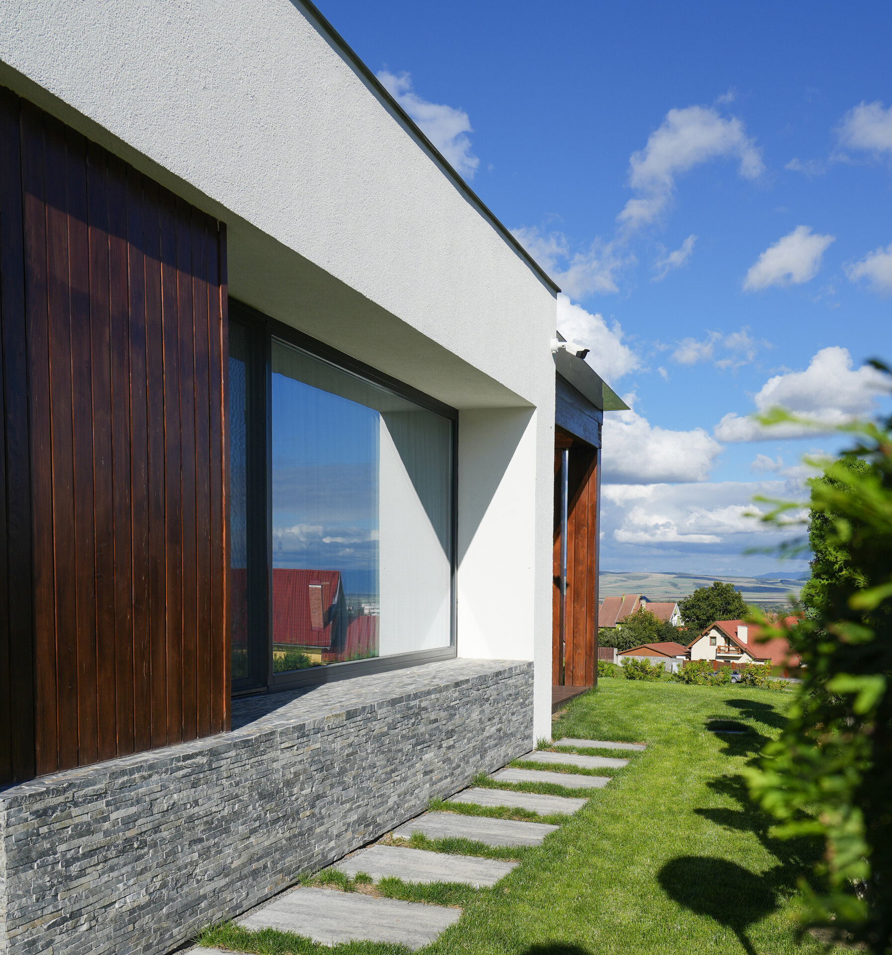 Volumele compoziției sunt simple, articulate printr-o pergolă de lemn.