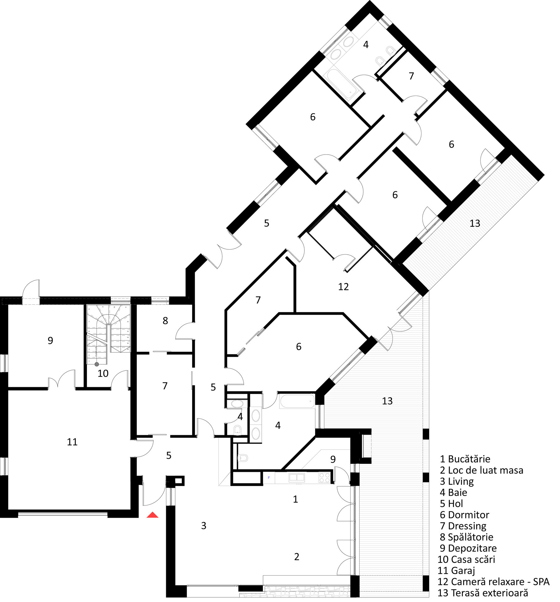 Distribuția spațiilor pe zone funcționale, generează o utilizare simplă și organizată a activităților. În zona accesului se află spații de depozitare ce pot fi imediat utilizate, o legătură bună cu garajul, zona de zi și cea de noapte.