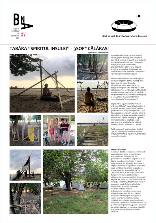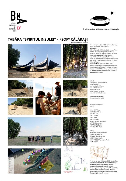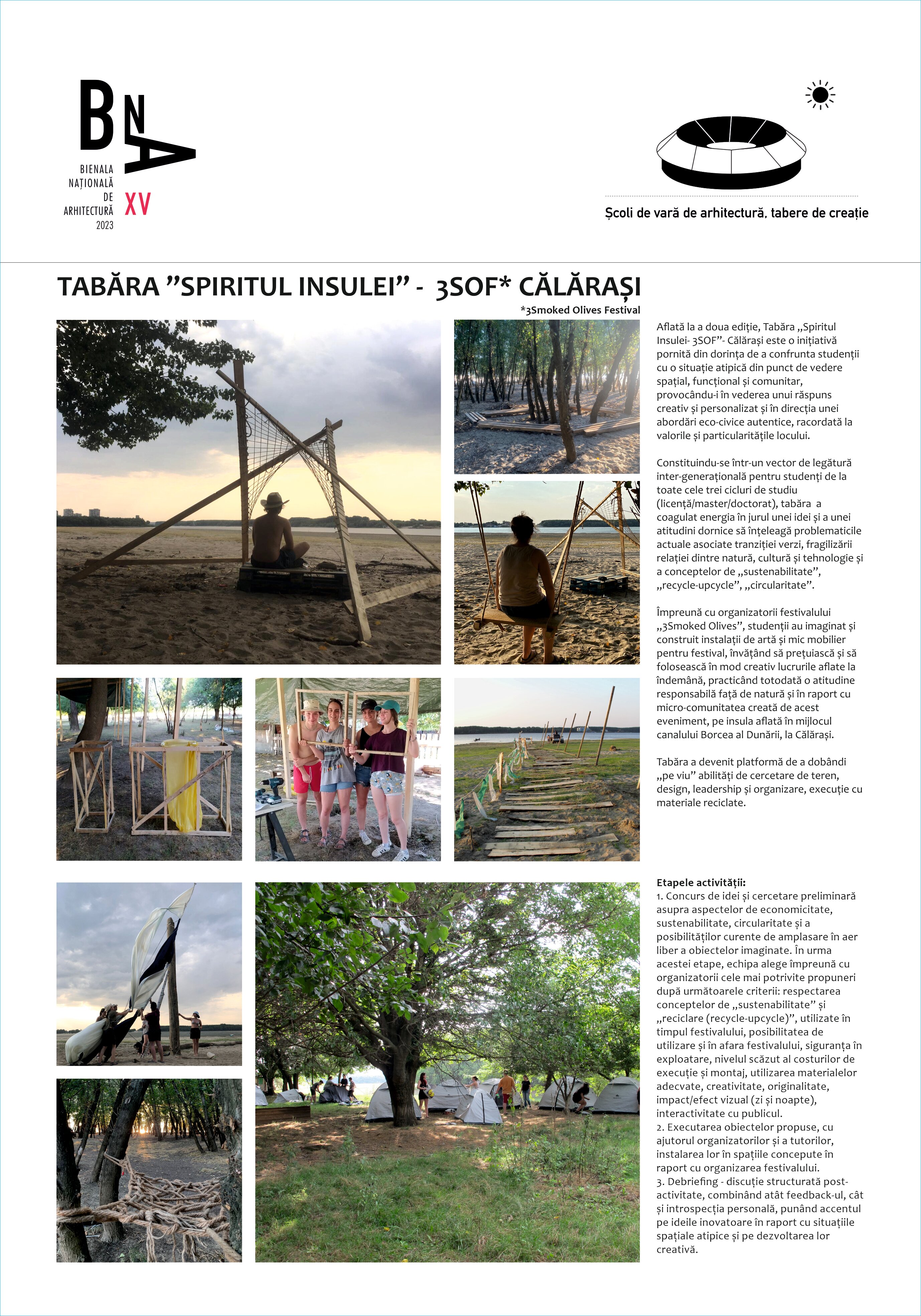 Tabăra este concepută ca o activitate non-formală de design & build, vizând exploatarea creativă și eco-responsabilă a unui loc excepțional: o insulă situată pe canalul Borcea al Dunării, în apropiere de orașul Călărași, unde se desfășoară anual un festival de muzică deja binecunoscut tinerilor: „3 Smoked Olives”. Constituindu-se într-un vector de legătură inter-generațională pentru studenți de la toate cele trei cicluri de studiu (licență/master/doctorat), tabăra „Spiritul Insulei” coagulează în jurul unei idei și a unei atitudini dornice să înțeleagă problematicile actuale asociate tranziției verzi, fragilizării relației dintre natură, cultură și tehnologie și a conceptelor de „sustenabilitate”, „recycle-upcycle”, „circularitate”.