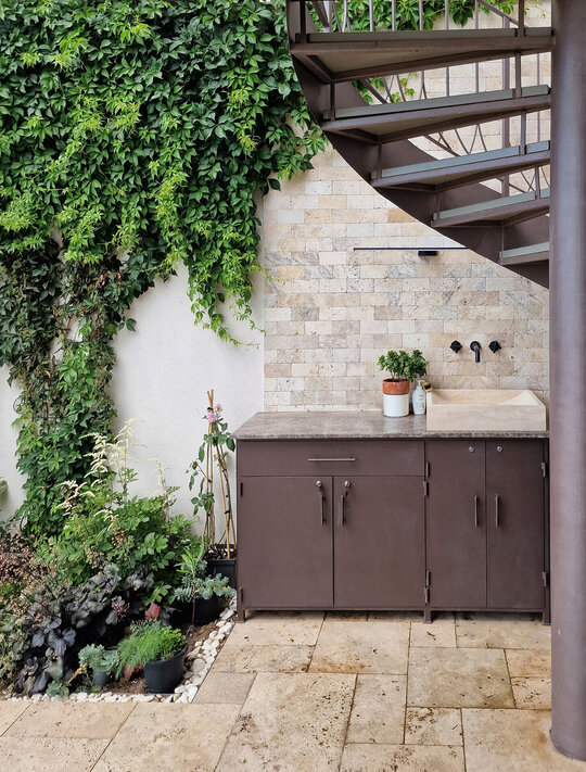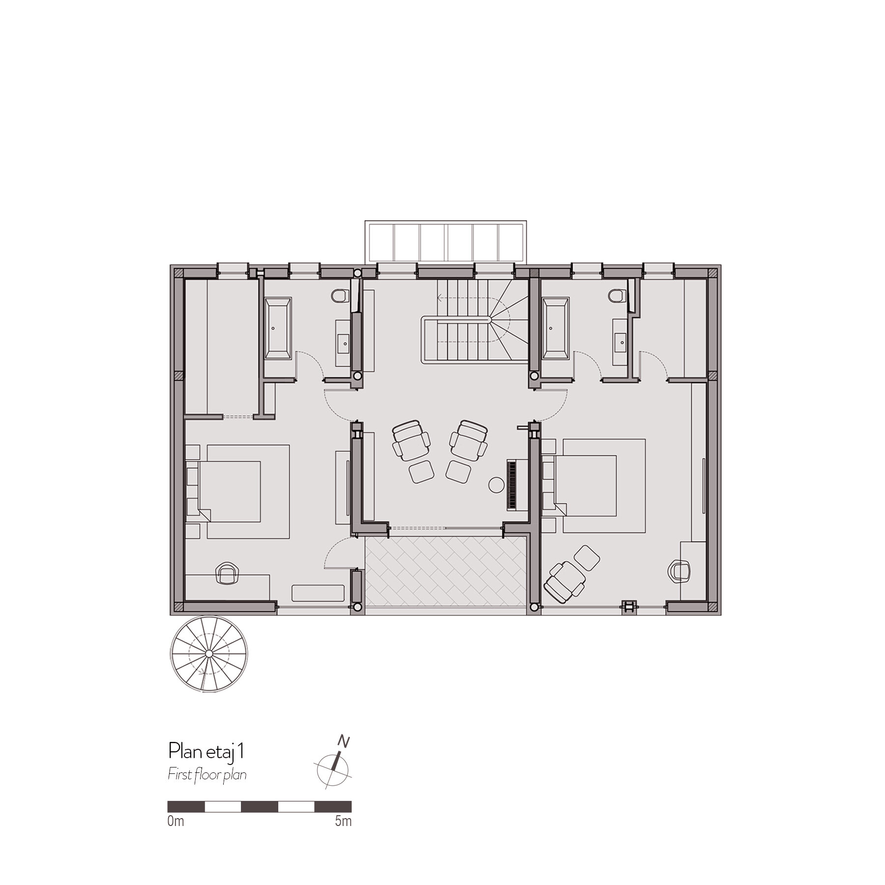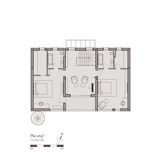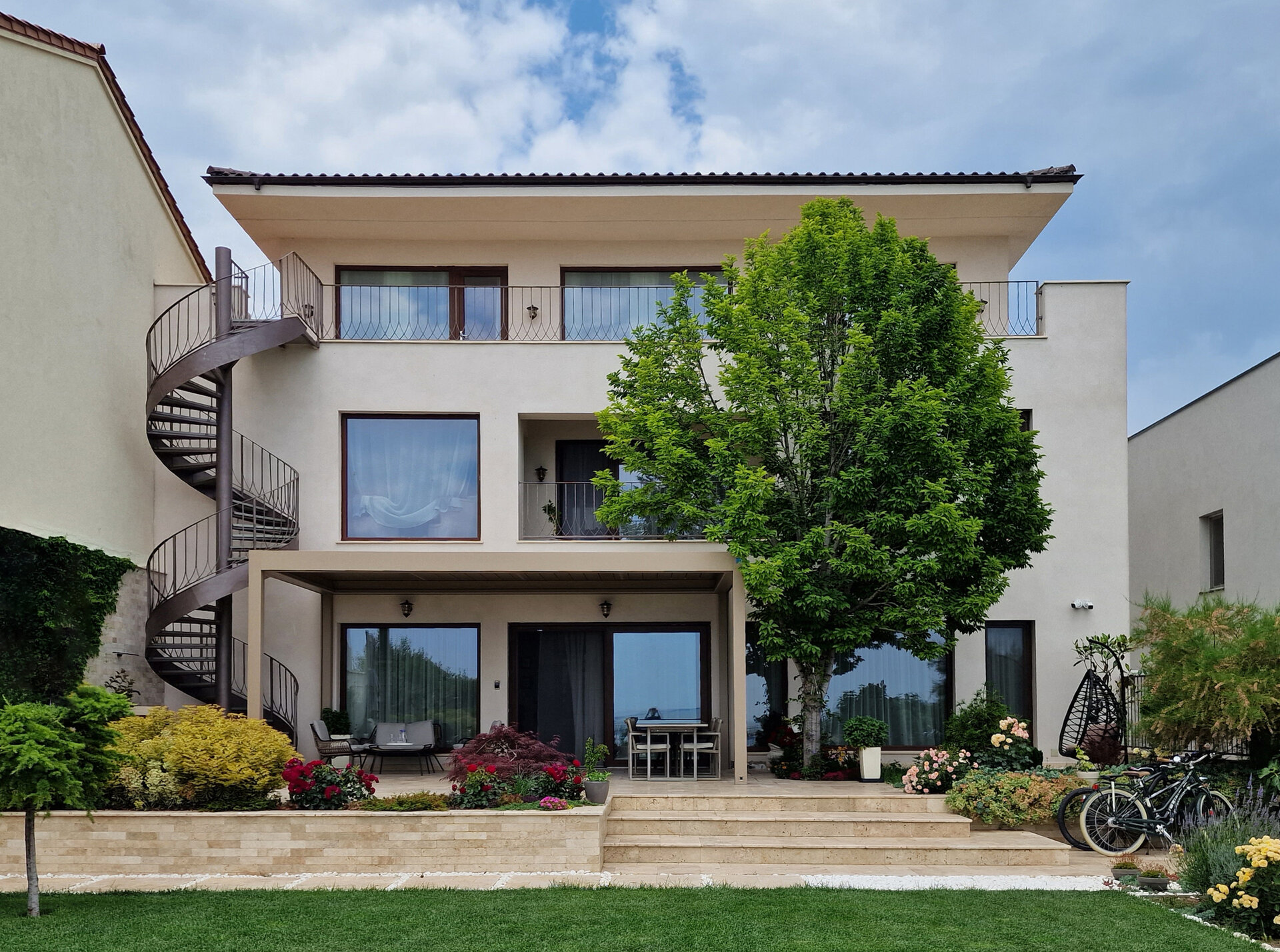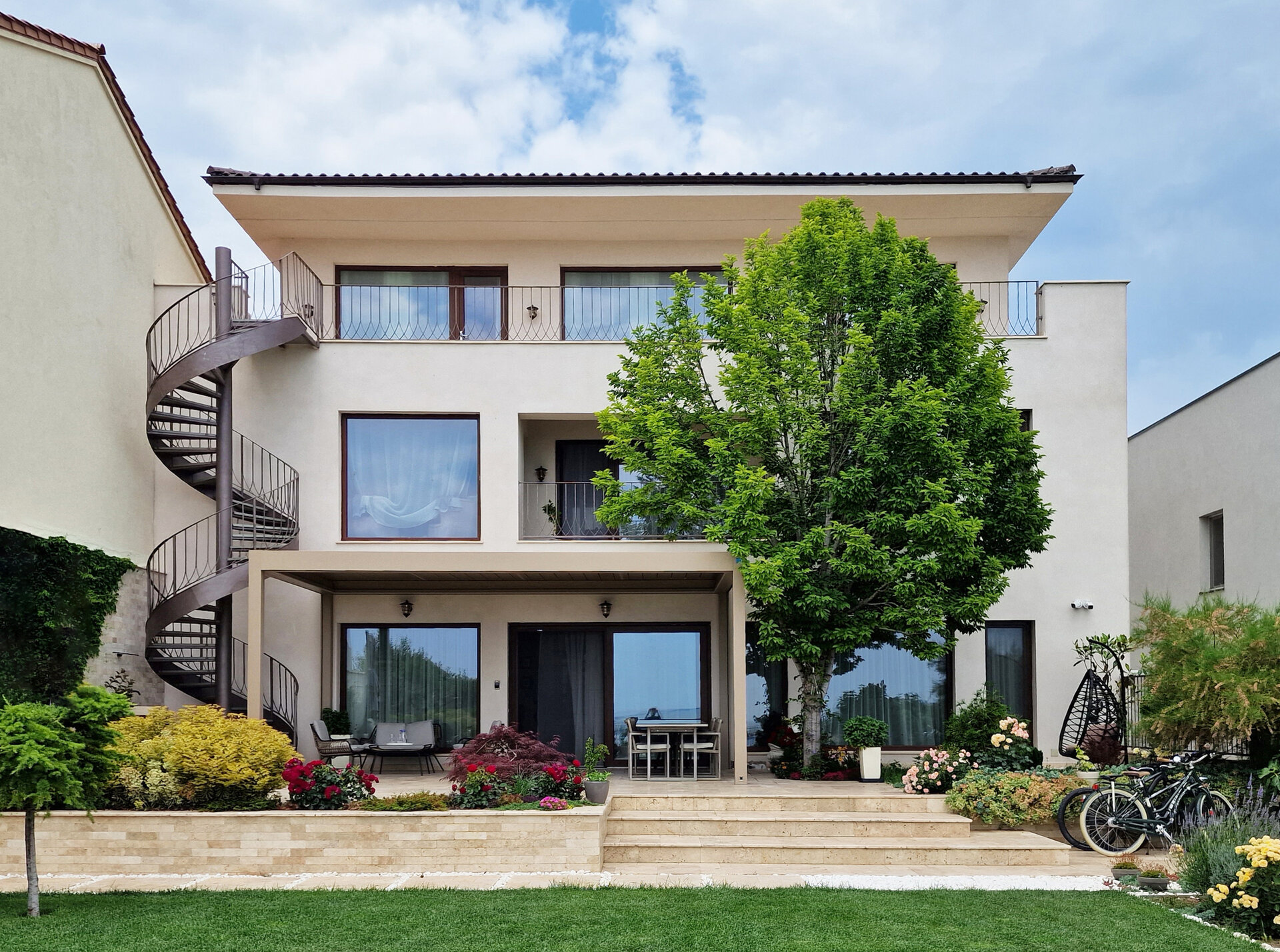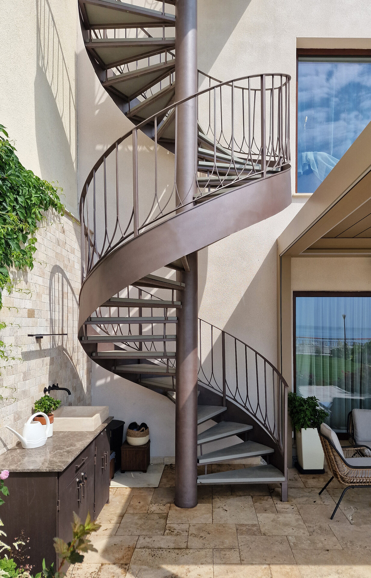 Elementele de arhitectură au fost proiectate în detaliu, precum scara elicoidală, uşa principală de lemn şi balustradele. Atenţie deosebită a fost dată şi amenajării grădinii şi teraselor, cu detalii precum pavajele în dale, duşul exterior şi mobilierul proiectat.