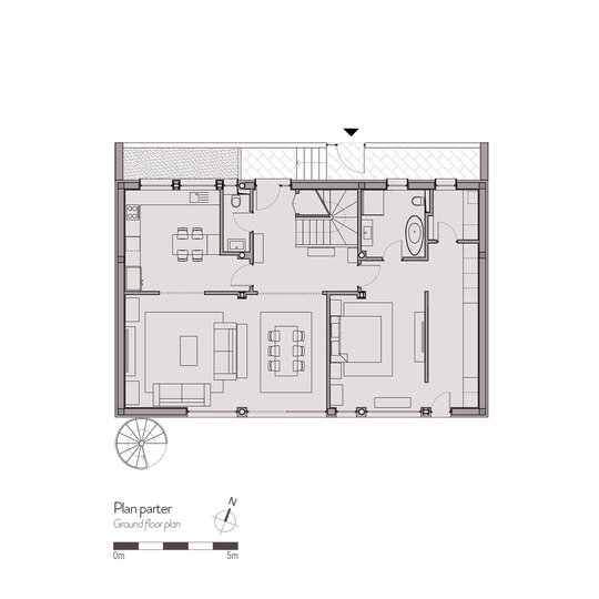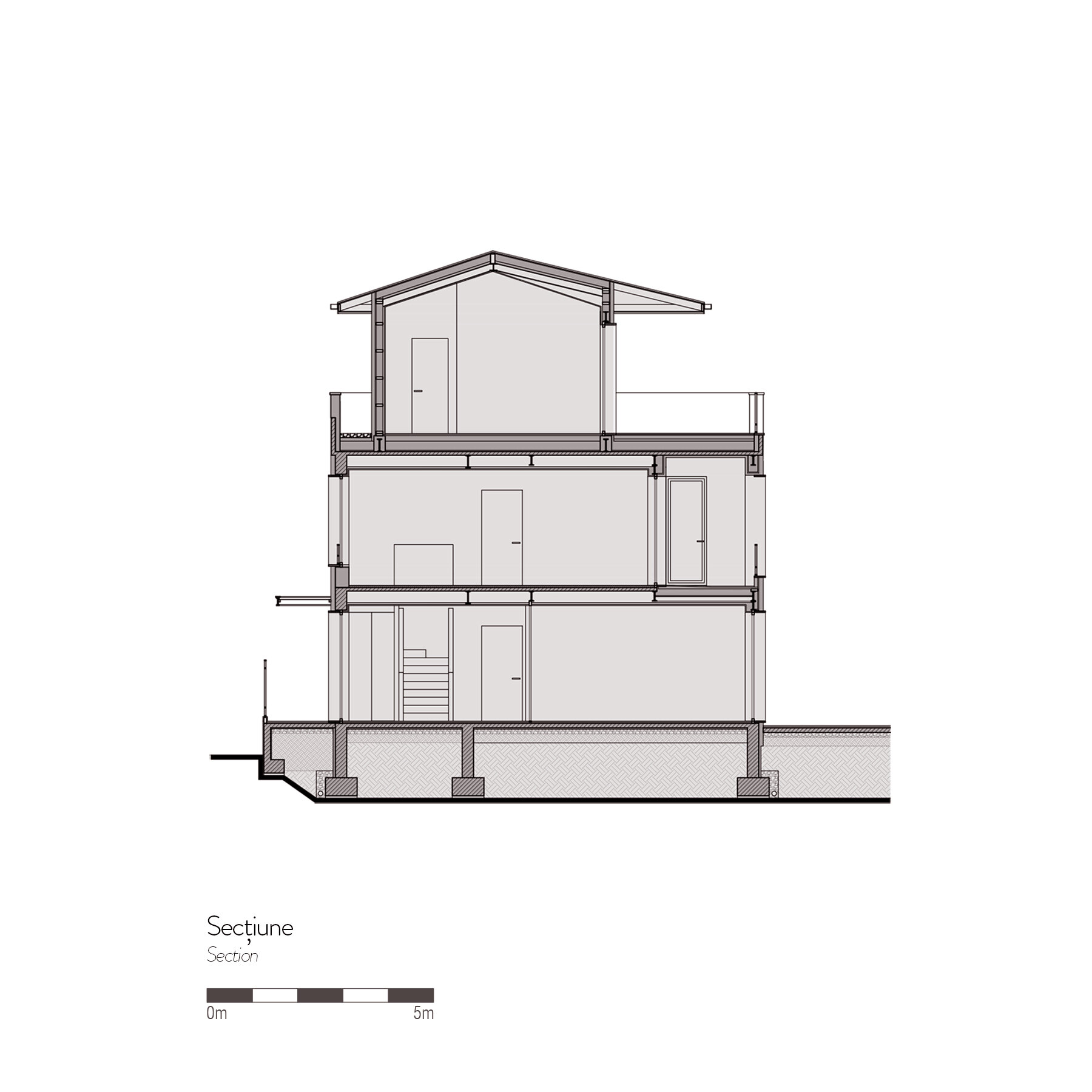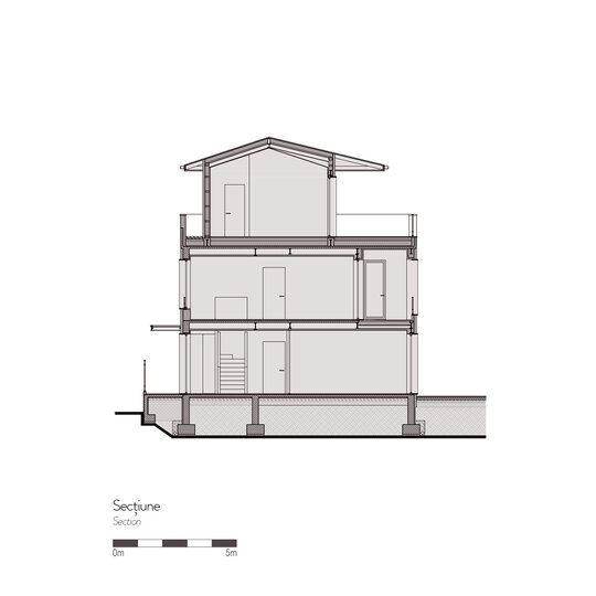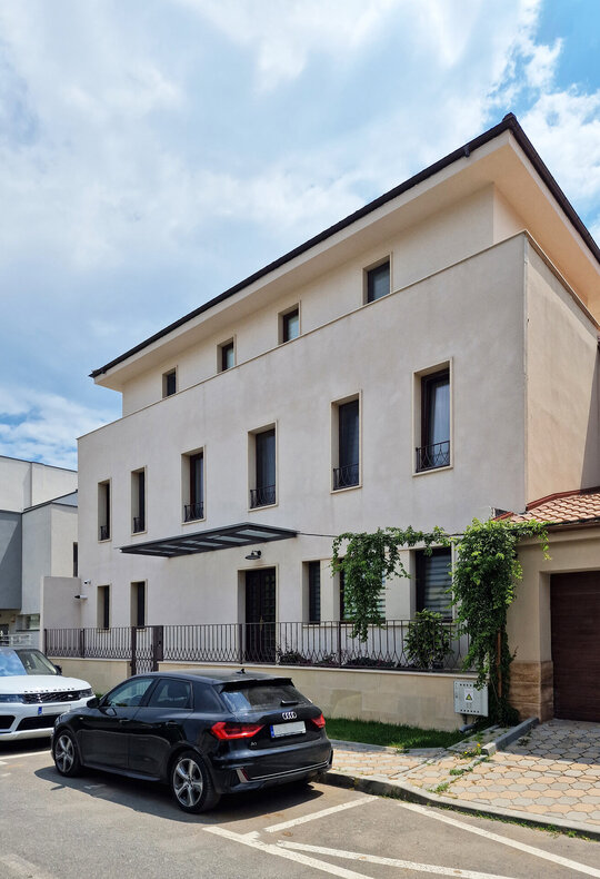 Soluţia de arhitectură a pornit de la păstrarea volumului iniţial, dar cu simplificarea geometriei existente şi cu supraetajare parţială. Imaginea rezultată este mai simplă, modestă, cu influenţe mediteraneene şi cu o atenţie deosebită dată detaliilor constructive. Etajul nou este retras de la toate cele patru laturi pentru a nu contribui considerabil la masivitatea construcţiei. Cu retragerea cea mai mare către sud, acesta este imperceptibil de la parter.