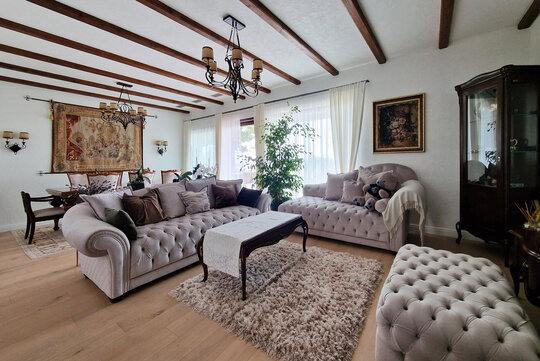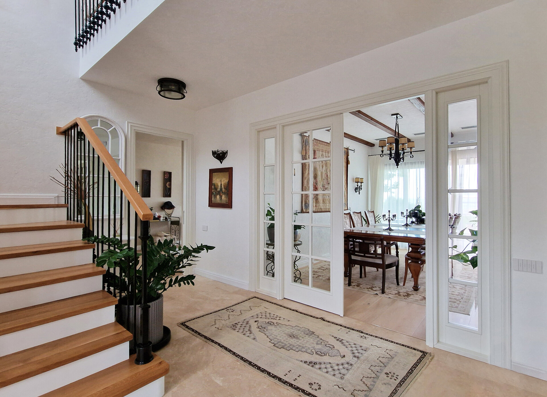 Amenajarea interioară contrastează cu simplitatea exteriorul deoarece s-a optat pentru o imagine mai clasică, cu influenţe ale stilului colonial spaniol, regăsit în elemente precum balustrada, finisajele, sau uşile mari vitrate din lemn.