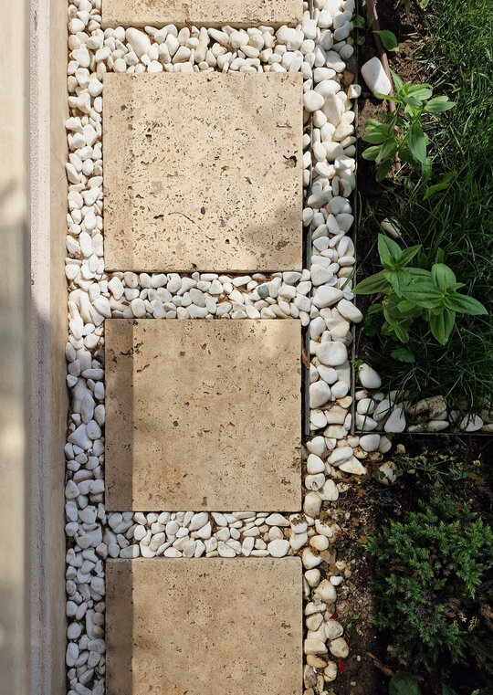 Grădina este un spaţiu intim datorită elevaţiei de 2m dinspre spatele terenului, unde se învecinează cu o alee cu acces secundar către plajă. Arbuştii plantaţi perimetral vor creea în timp un filtru vizual către proprietăţile învecinate, iar plantele căţărătoare vor acapara calcanului dinspre vest. Singurul arbore existent iniţial pe teren a fost păstrat, deşi obstrucţionează parţial vederea către sud.
