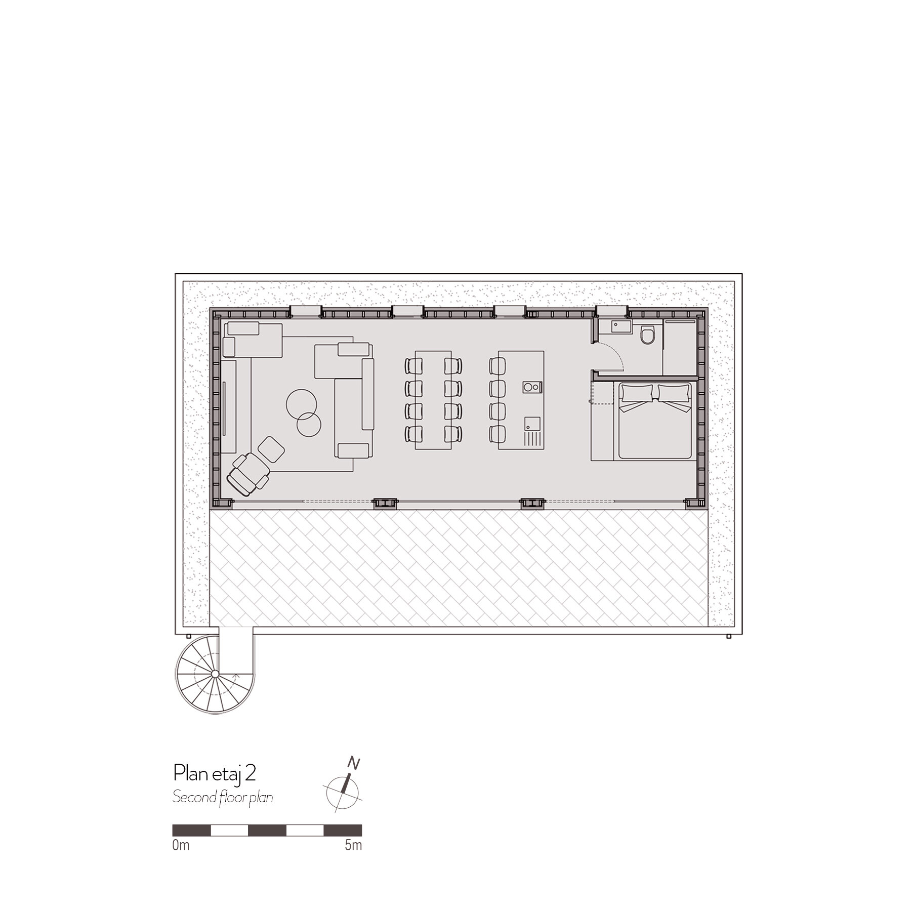 Etajul 2, cu acces separat pe o scară elicoidală exterioară nouă, deserveşte un studio cu terasă şi ferestre generoase, cu vedere spectaculoasa către mare, plaje si silueta oraşului.