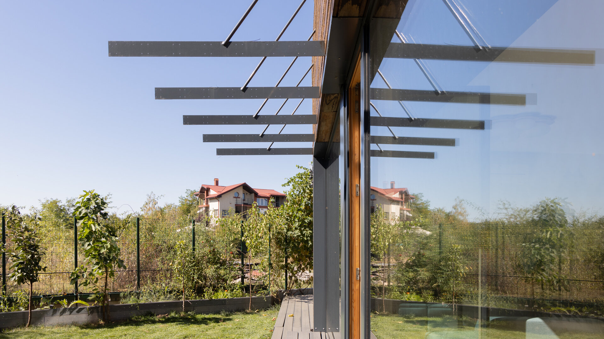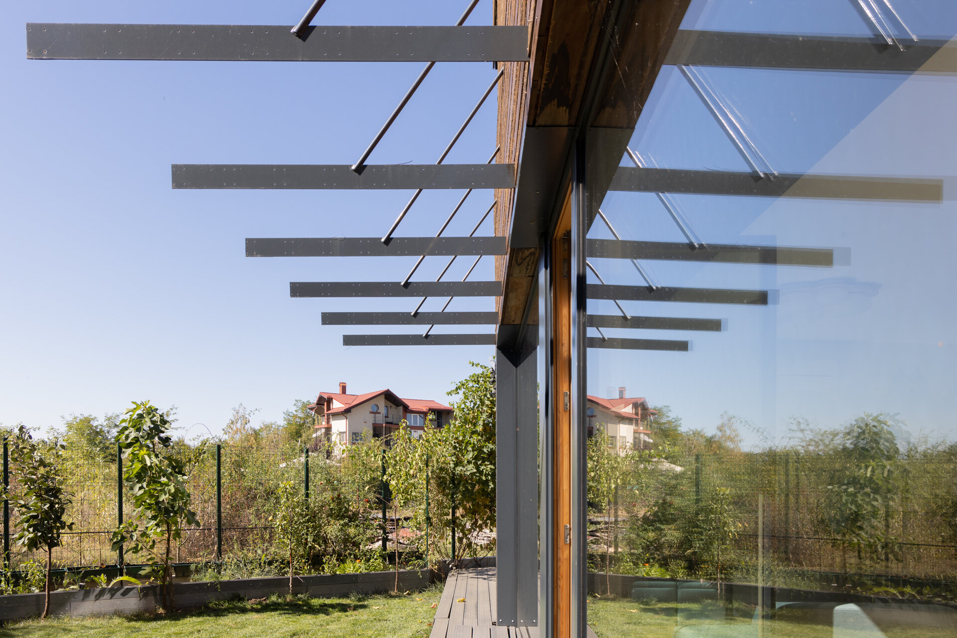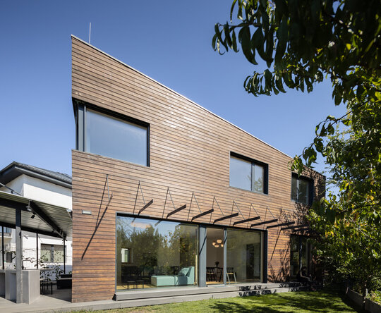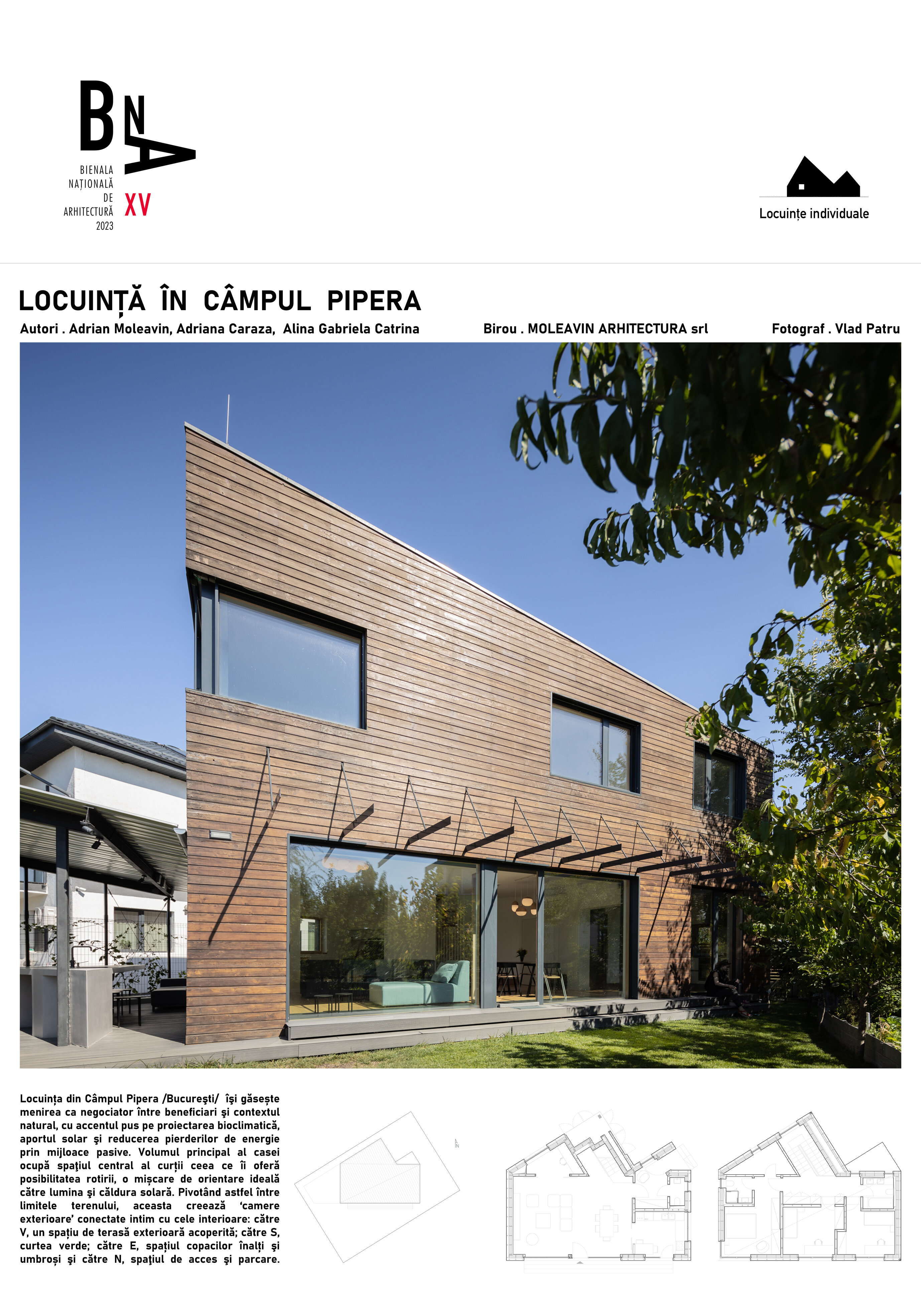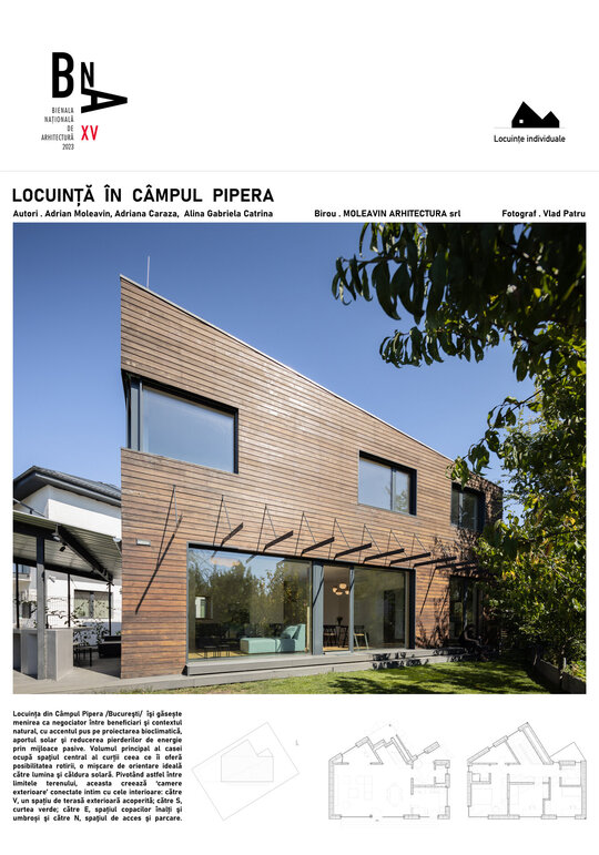 isi gaseste menirea ca negociator intre beneficiari si contextul natural, cu accentul pus pe proiectarea bioclimatica, aportul solar si reducerea pierderilor de energie prin mijloace pasive. Volumul principal al casei ocupa spatiul central al curtii ceea ce ii da posibilitatea rotirii, intr-o miscare de orientare ideala spre lumina si caldura solara. Pivotand astfel intre limitele terenului, acesta creeaza ‘camere exterioare’ conectate intim cu cele interioare: catre V, un spatiu de terasa exterioara acoperita; catre S, curtea verde; catre V, spatiul copacilor inalti si umbrosi si catre N, spatiul de acces si parcare.