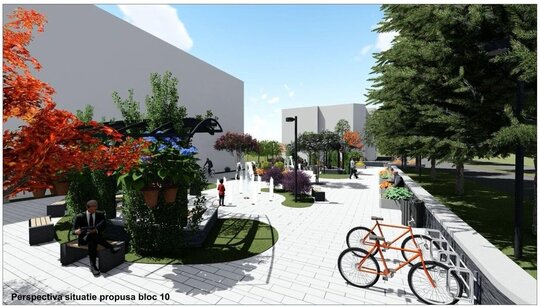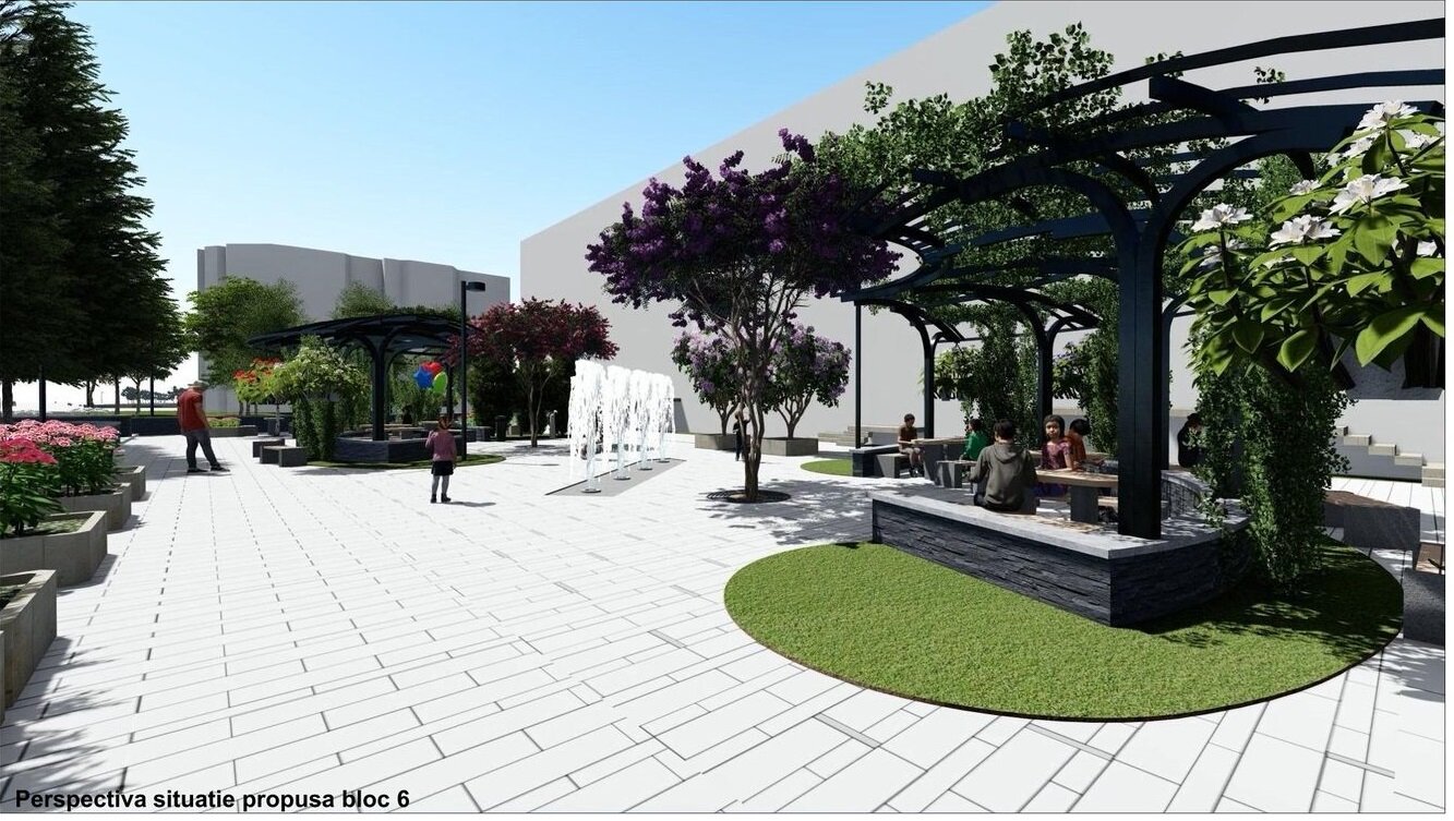 Conceptul propus pune accentul pe transformarea spațiului urban într-un loc de relaxare, odihnă, întâlnire și discuție pentru cetățeni, dar și conectarea la întreaga rețea urbană, prin integrarea pistei de biciclete si propunerea unor căi de acces mai ușoare și sigure pentru persoanele cu dizabilități și bicicliști. Pentru a păstra memoria locului vie am decis să integrăm o parte din jardinierele regăsite în sit în noua amenajare. Jardinierele și-au găsit locul împreună cu un mobilier urban nou, alcătuit din mese, bănci coșuri de gunoi dar și de o serie de pergole metalice care se vor acoperii de vegetație în timp. Pentru avea diferite centre de interes am propus o serie de fântâni la nivelul dalajului, în jurul cărora au fost așezate pergolele metalice.
