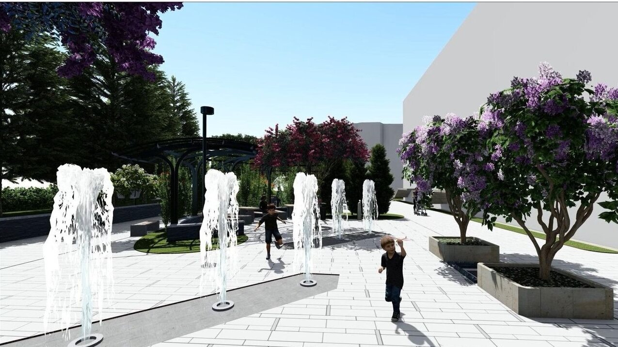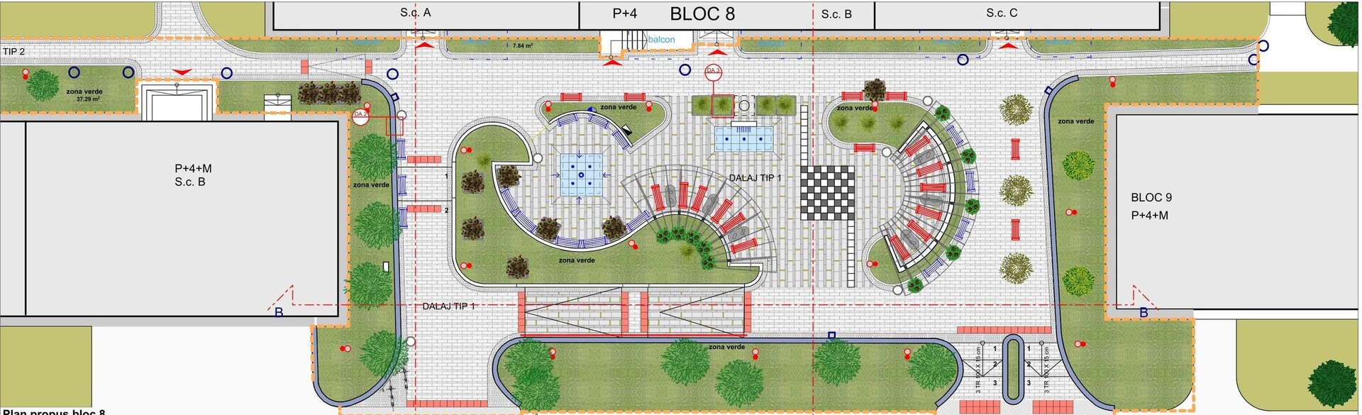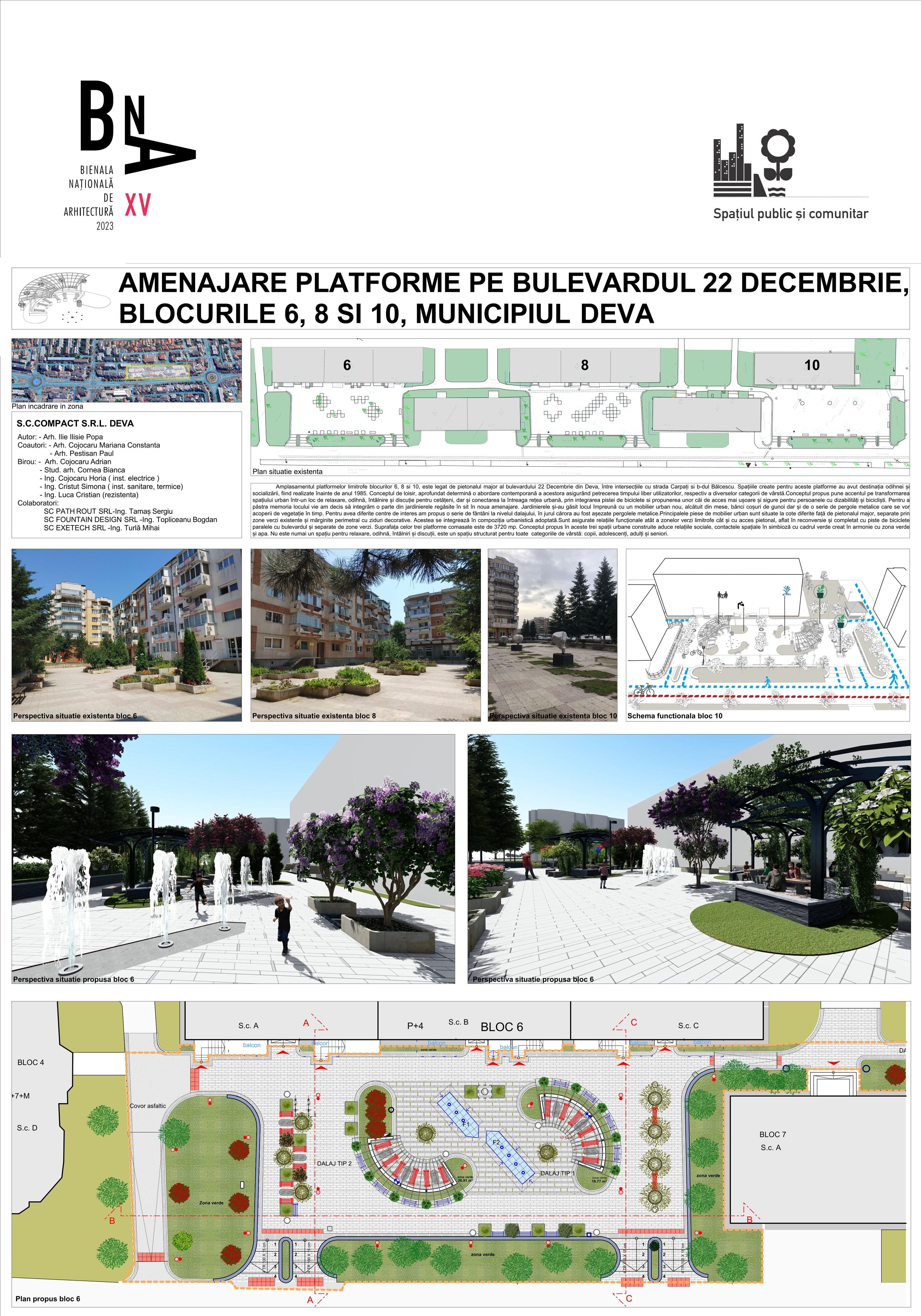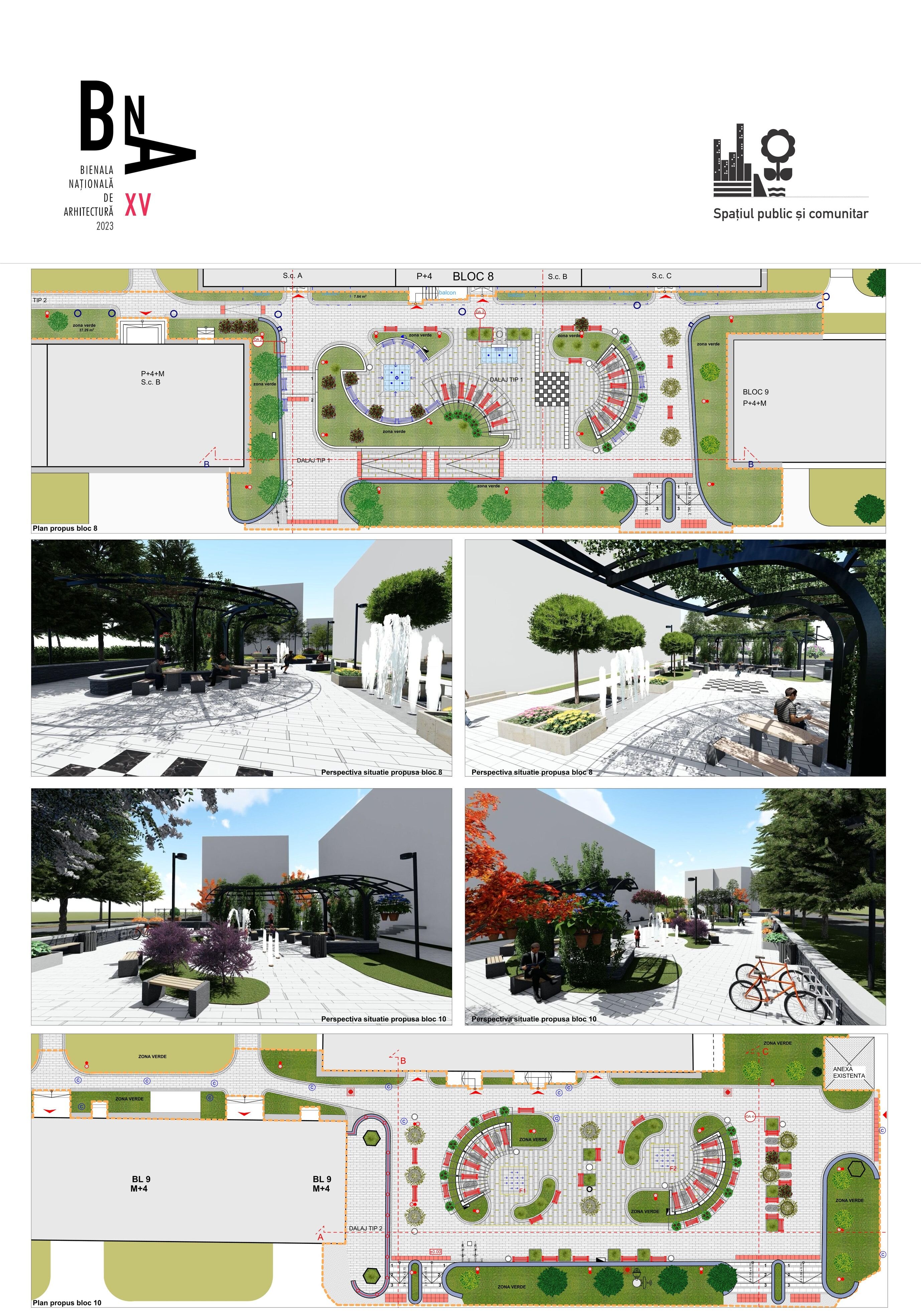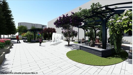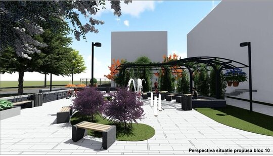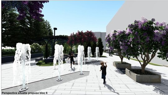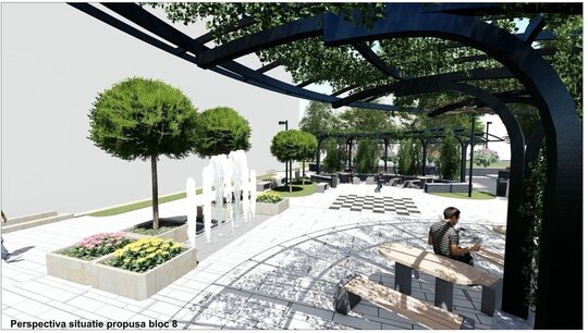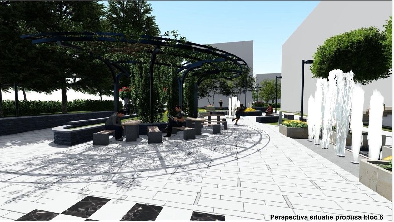 Relocând jardinierele existente în compoziția cu mobilierul urban, cu grupările de bănci și măsuțe, integrând suportul pentru maxi-șah, cu locuri libere pentru copii, asigurând un iluminat decorativ al spațiului și a jeturilor de apă, am încercat să determinăm un spațiu urban contemporan.