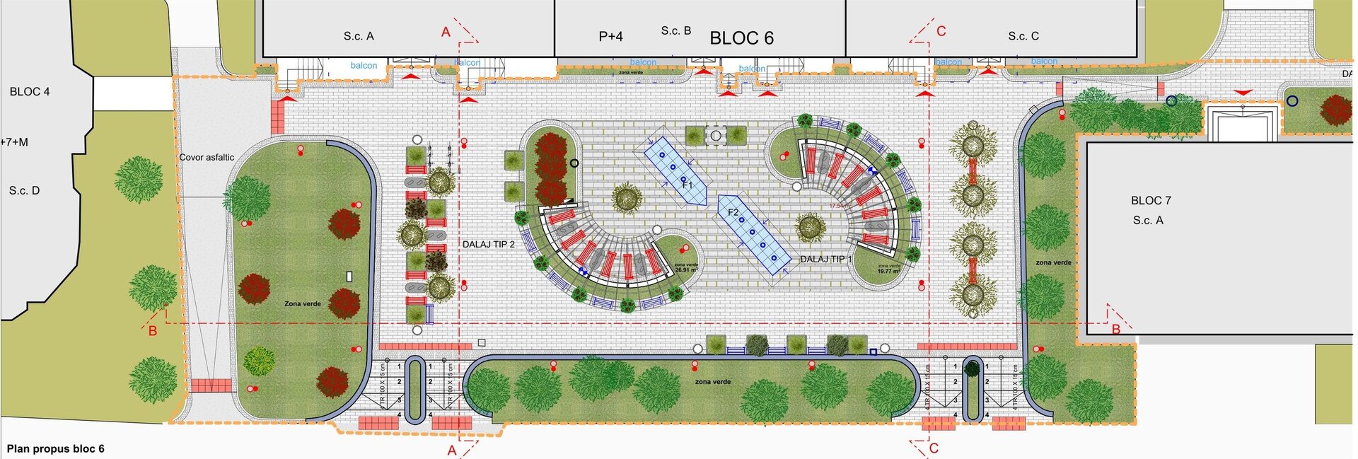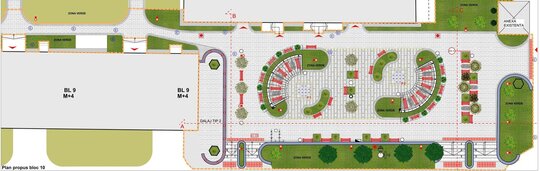 Cele trei platforme 6, 8 si 10 sunt susținute de blocurile de locuințe colective, de spațiile funcționale de la parterul acestor blocuri și sunt adiacente pietonalului major limitrof Bulevardului 22 Decembrie.