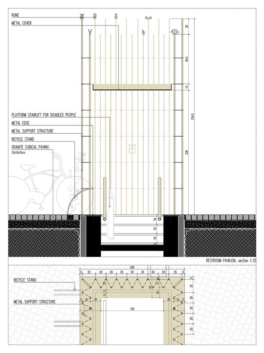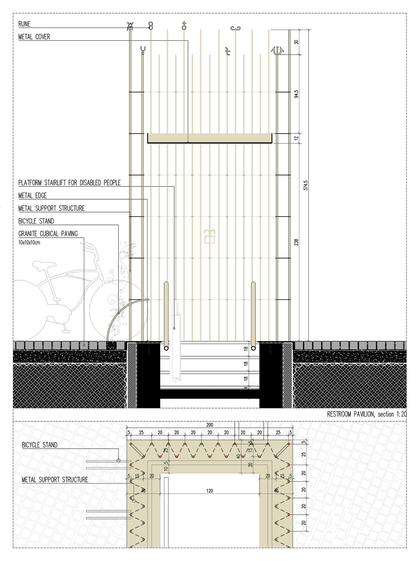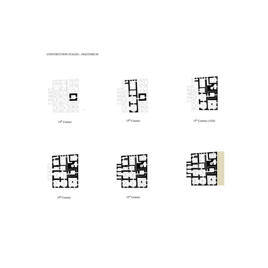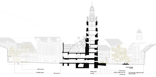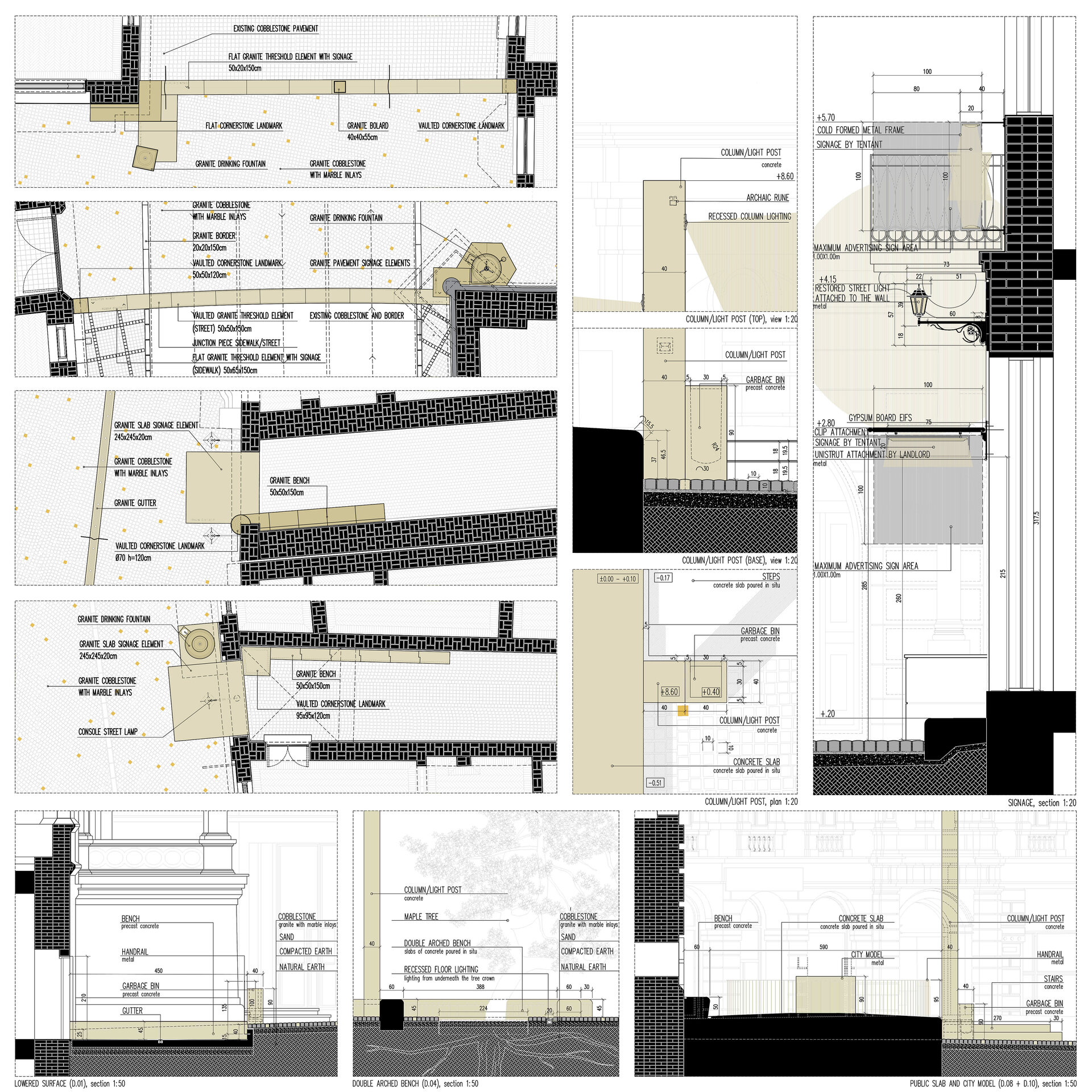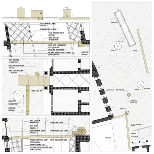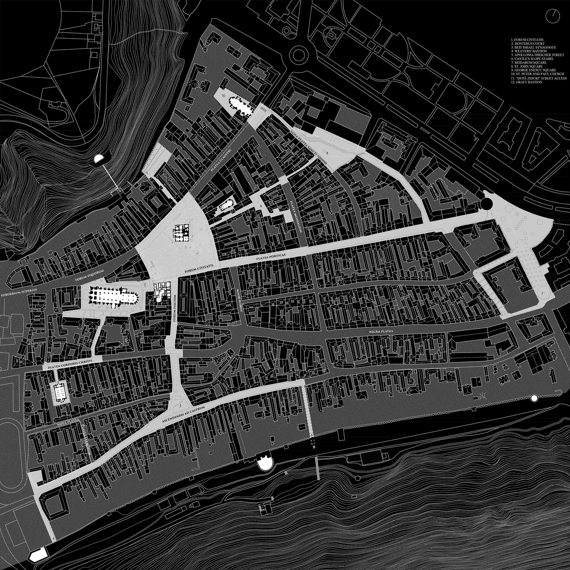 Piața principală face parte din oraș, dar tinde să aibă un ritm și un timp propriu, paralel cu cel obișnuit care măsoară metronomic viața de zi cu zi, un fel de înstrăinare care o desparte de fațadele și străzile sale. Prin urmare, a intra și a ieși din această încăpere minunat de curioasă presupune depășirea unor limite pregătitoare, trecerea unor praguri care se găsesc în raport cu oricare dintre străzile și pasajele de legătură. Aceste limite semnificative sunt marcate ca elemente grele în pavaj, care tind să se acumuleze în masă pe măsură ce se întâlnesc cu fațadele și elementele construite învecinate, la fel cum o fac și elementele noi din fosta primărie. Noile granițe devin locuri de tihnă și momente de zăbovire pivotate în pietre de colț, bănci și repere discrete care amintesc de toponimele istorice și evocă simboluri arhaice aflate la jumătatea distanței dintre hieroglife și emblemă, rune misterioase folosite în trecut pentru marcarea animalelor care acum sunt sculptate ca mesaje curioase din trecut în anumite zone ale acestor noi artefacte. Acest tip de intervale de odihnă ni se pare mai adecvat decât orice conexiuni și itinerarii liniare evident marcate către reperele din jur, străzile, piețele învecinate, muzeele și bisericile, zidurile orașului sau bastioanele. Apa este adesea un element extrem de important în acest amalgam de ancore de prag, atât din punct de vedere istoric, cât și datorită sentimentului evident de bunăstare pe care îl aduce ca parte a vieții de zi cu zi a cetățenilor; din acest motiv, am decis să evităm orice prezentare monumentală și să ne limităm la modestele fântâni cu ecouri murmurând continuu care însoțesc această prezentare. În mod similar, strategia pe care o propunem pentru întreaga citadelă istorică sugerează adăugarea acestui tip de semnale și memento-uri minuscule în apropierea intersecțiilor de străzi importante și a reperelor istorice, dar, cel mai important, atașarea fântânilor și a bazinelor de apă discrete la casele construite importante preexistente, fără a le altera caracterul sau a le perturba în vreun fel.