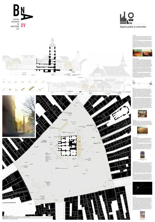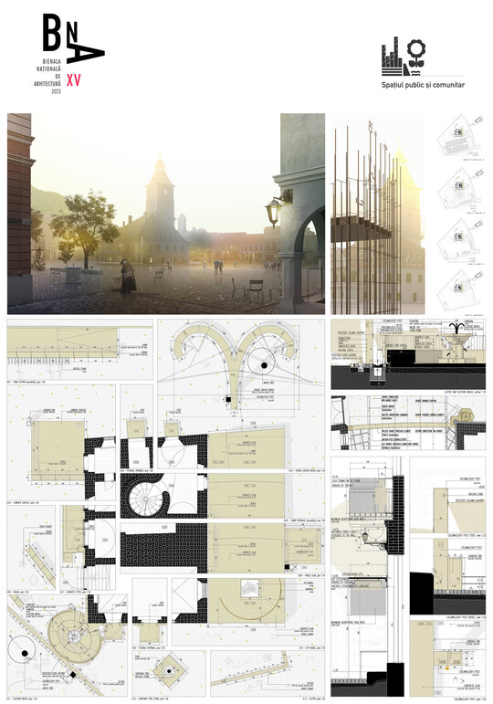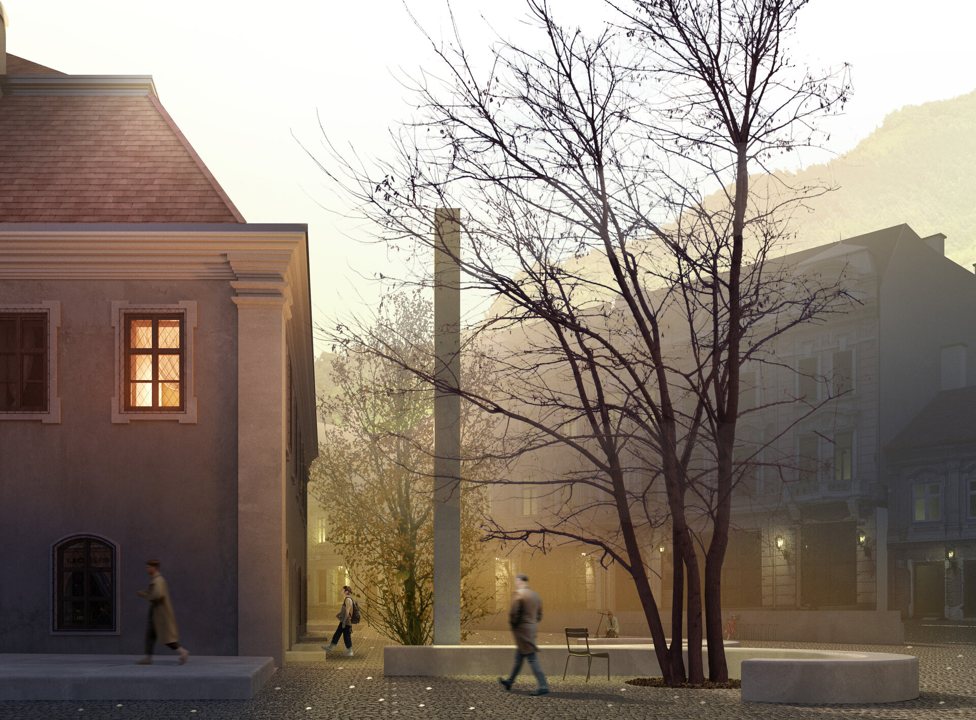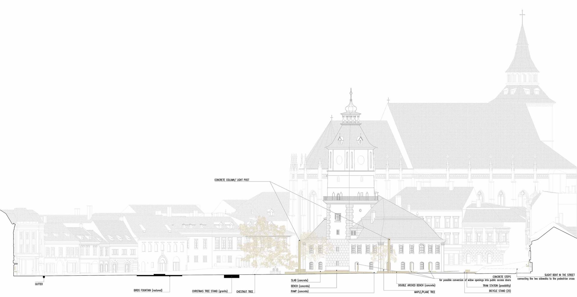 Piața Sfatului din Brașov este atât o prezență fizică, cât și un interval de timp care măsoară acest efort de a fi în aer liber; a fi scos la lumină are de-a face cu acest moment al pieței orașului, dar și cu un impuls fizic, cu impetuozitatea unui fel de arcuire care deformează piața expunându-i deschiderea și făcându-o tot mai prezentă. Orice alte adăugiri sunt predispuse să perturbe acest elan inaugural, prin urmare, proiectul nu ar trebui să fie mai mult decât o ajustare modestă și rezonabilă a greutăților care trag gravitațional în jos și contorsionează Piața Sfatului. Propunerea noastră urmărește să realizeze acest echilibru discret între elementele portante și arcul fin al deschiderii prin gruparea intuitivă a artefactelor. Această distorsiune despre care vorbim nu trebuie să fie ascunsă sub vălul banalului, ci trebuie celebrată discret, împreună cu stranietatea sa. Această celebrare a ieșirii în evidență se realizează, în mod paradoxal, printr-un act de abstractizare paralel și inversat, o constrângere impusă de sine în conformitate cu strategia de distribuire a încărcăturii menționată mai sus, care alterează semnificativ învelișul subțire al pătratului.