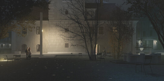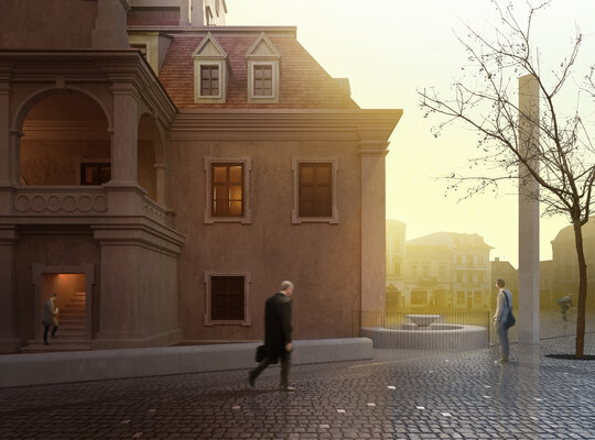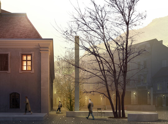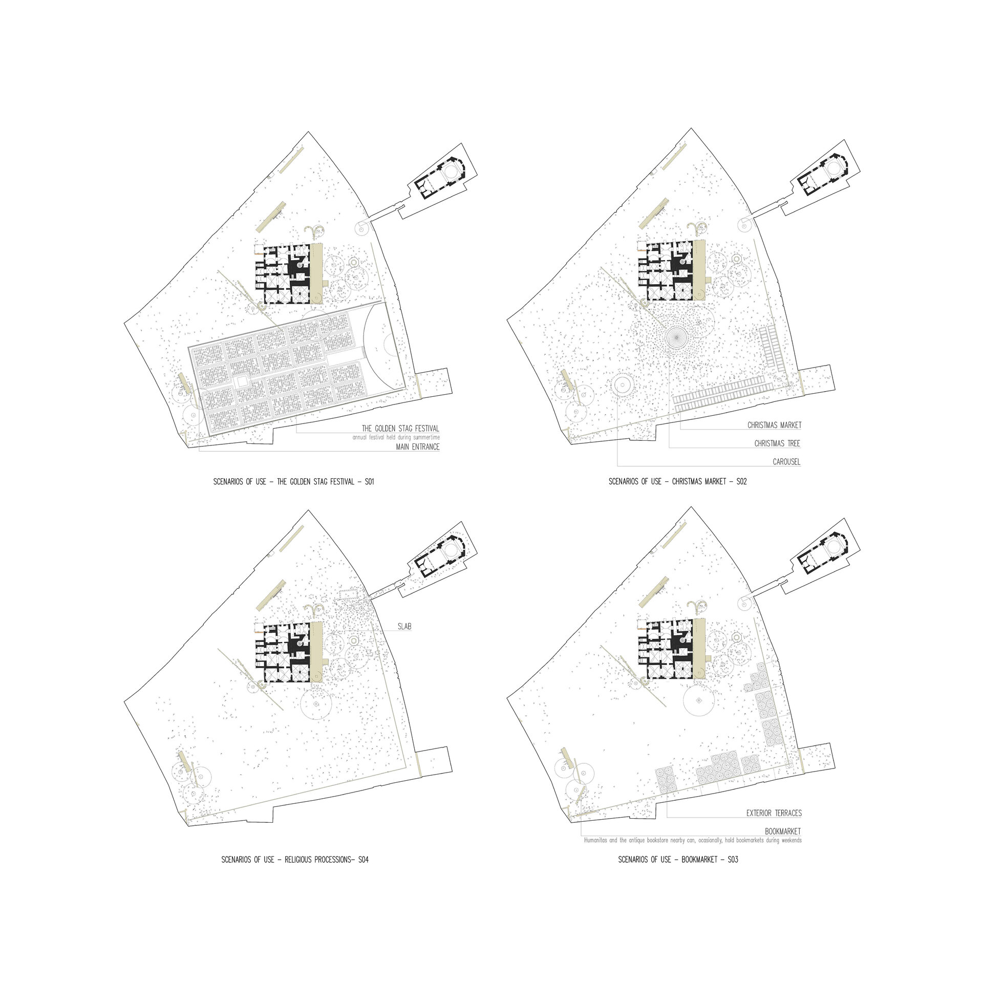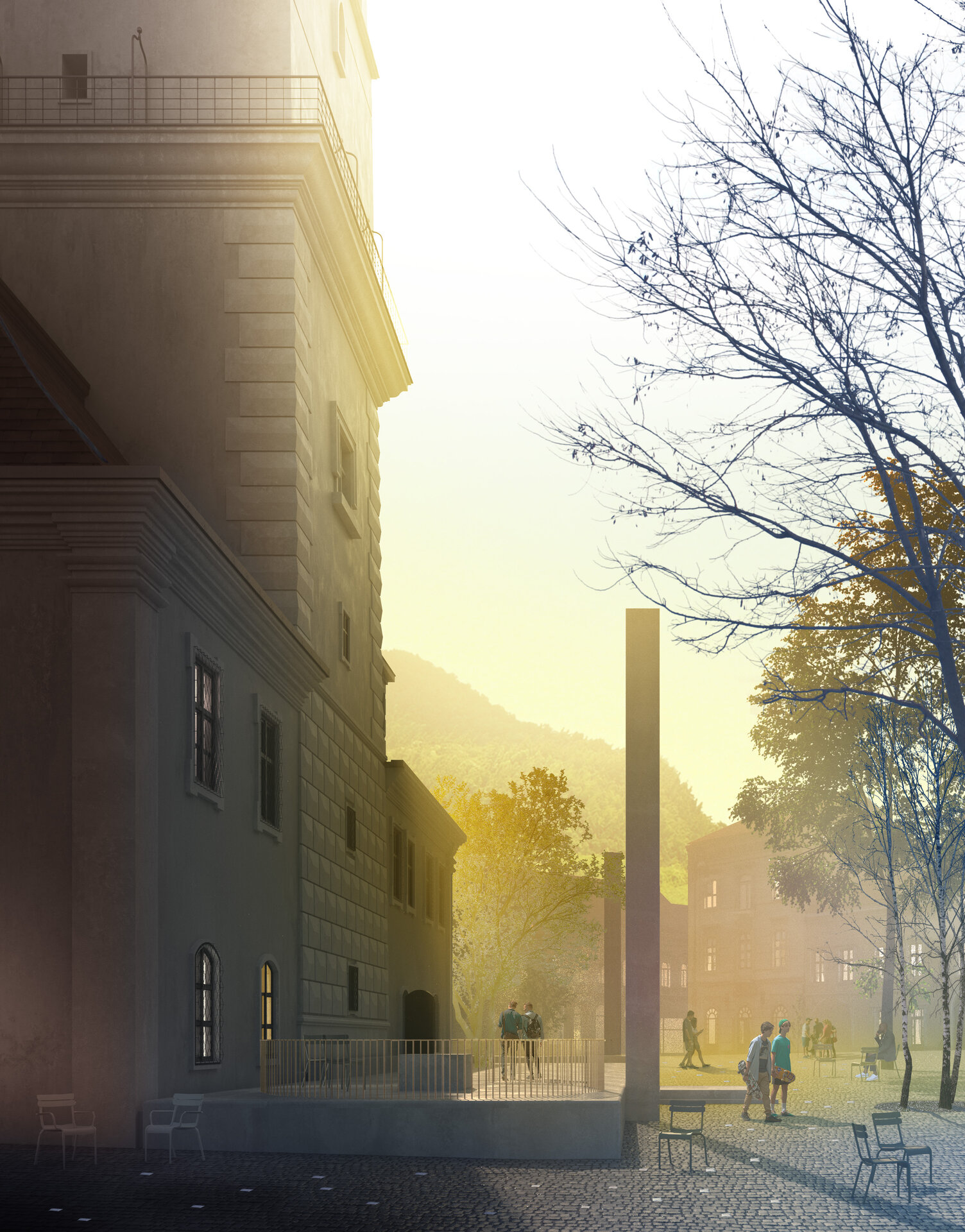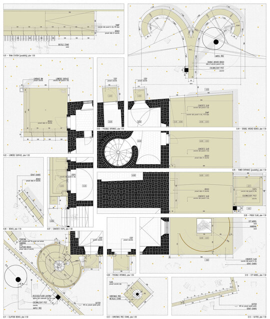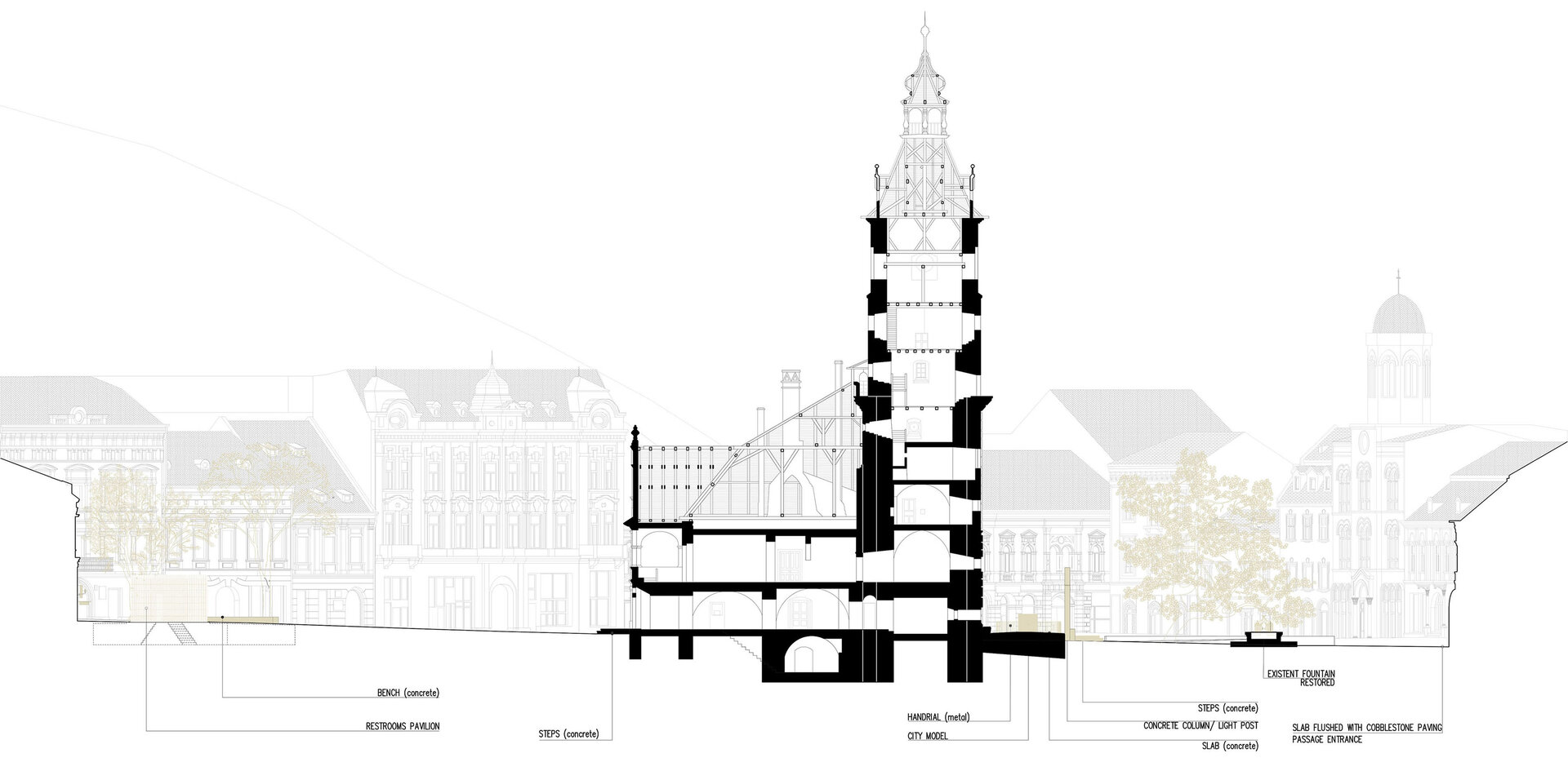 Propunerea noastră se aliniază la acest amalgam perpetuu de substanță și artefacte - elemente din piatră și piese turnate în beton își găsesc locul lângă casa mare și turn: banca și jgheabul în formă de dală de pe colțul sudic cu nodul elipsoidal și fântâna atașată, deschiderile marcate propuse, treptele care încearcă să marcheze posibilitatea de a recupera fostele uși pe care casa le avea anterior în jurul limitei sale, banca cu arc dublu de pe colțul nordic, curtea scufundată care restabilește o posibilă legătură cu pivnițele istorice, posibila bancă din stația de autobuz cu suportul de biciclete atașat, gruparea de castani care se găsește în vecinătatea fântânii octogonale existente, și, cel mai important, placa de beton de pe latura nord-estică a casei. Acest element de beton orizontal cu margini rotunjite, menționat anterior, adaugă o nouă fază de construcție, ca un fronton al unor camere fantomatice care încă nu au apărut, un podium ușor arcuit sub propria greutate și adânc înrădăcinat în pământ, ca și cum s-ar fi aflat acolo dintotdeauna. Placa de beton este, de asemenea, un fel de scenă deschisă pentru exprimare liberă și dezbateri civice, oratorie și anunțuri publice, în timp ce, deține macheta orașului însuși, un artefact evocator prețios de tip memento.
