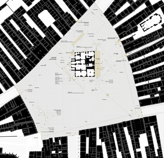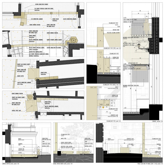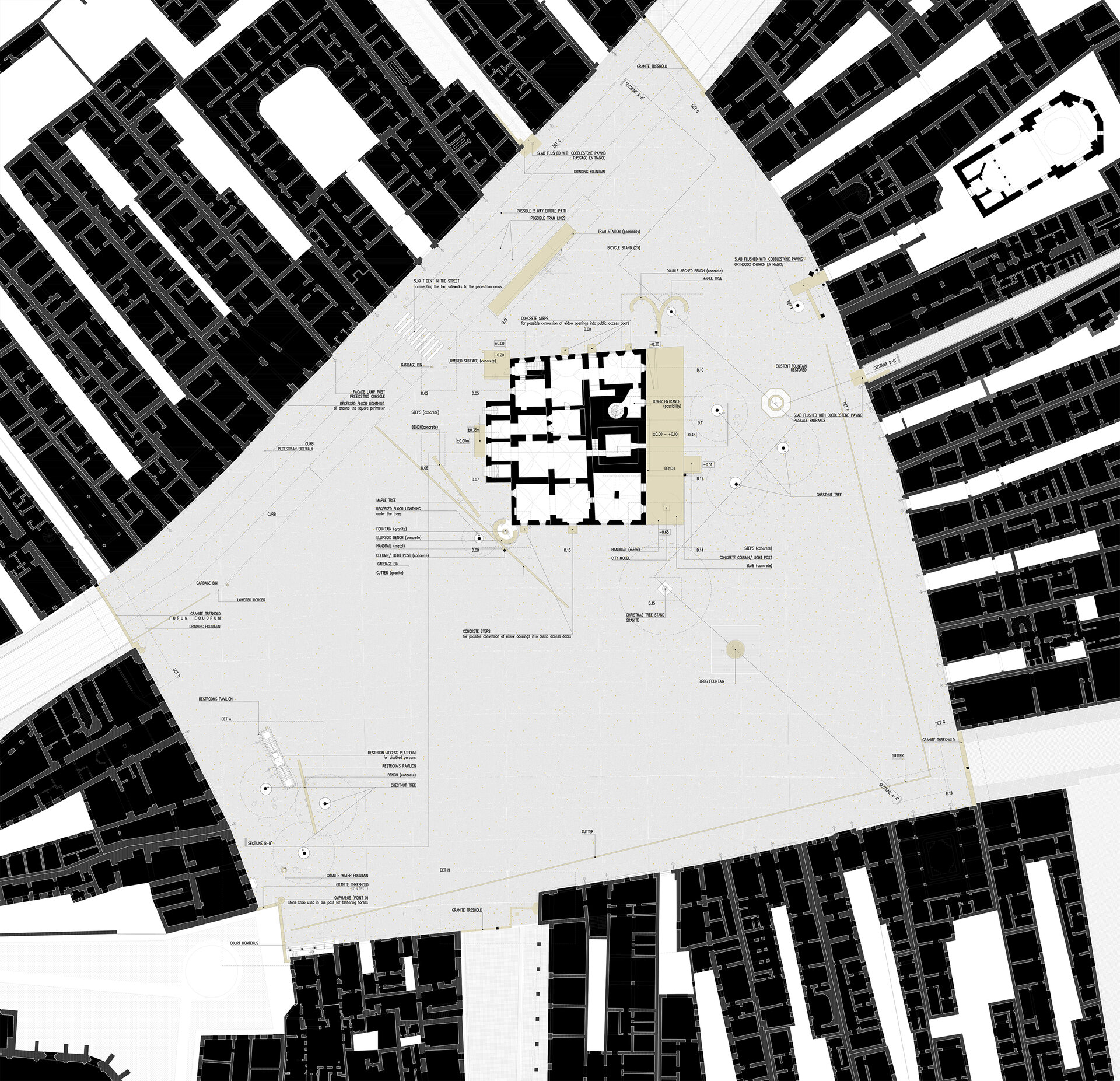 Această pânză nou recuperată a pieței publice va fi acoperită cu pavele, dintre care unele vor fi reutilizate din pavajul existent găsit pe șantier, care va fi demontat. Cu toate acestea, această nouă suprafață și recuperarea parțială a pavajului va fi dezbrăcată de orice linii directoare de încadrare subiacente și de grilele riguroase de imobilizare. Nuanța puternic sumbră a pietrei de granit de culoare gri închis, cu inserții de marmură albă dispersate difuz, este suficientă pentru a susține acest câmp omogen pe partea dorsală a pieței, o câmpie vastă și sumbră care strălucește cu inserții de fildeș pâlpâind, așezate la întâmplare ca niște constelații, o imagine în oglindă care reflectă cumva solemn cerul nopții, care este cel puțin la fel de patrimonial ca și piața orașului.