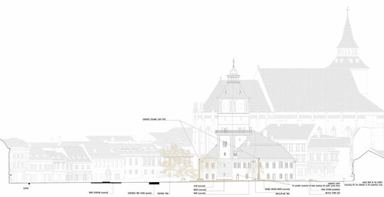 Cel mai greu artefact care apasă pe piață este casa mare care a fost cândva sediul magistratului, Praetorium, și mai târziu al primăriei, Casa Sfatului, un simbol magnific al voinței colective a cetățenilor de a se aduna în bresle în numele construirii orașului. Într-un fel de curios magnetism gravitațional, turnul de supraveghere inițial a reușit să aducă tot mai multă masă constructivă, cărămizi și mortar, prăvălii de artizani și săli de adunare, artefacte și obiecte obișnuite, mese și scaune, o sobă, un dulap pentru documente etc. Toate aceste lucruri au fost atrase în mod inexplicabil într-un singur loc și au fost atașate succesiv pentru a crește împreună unele de altele, într-un efort neîncetat de a-și spori prezența prin concentrarea întregii materii într-un singur loc. Această constrângere de a aduna greutate induce o tensiune discretă în această deschidere delicat arcuită, provocată de impulsul de îndoire care ajunge să se simtă între greutatea Bisericii Negre și a fostei primării.