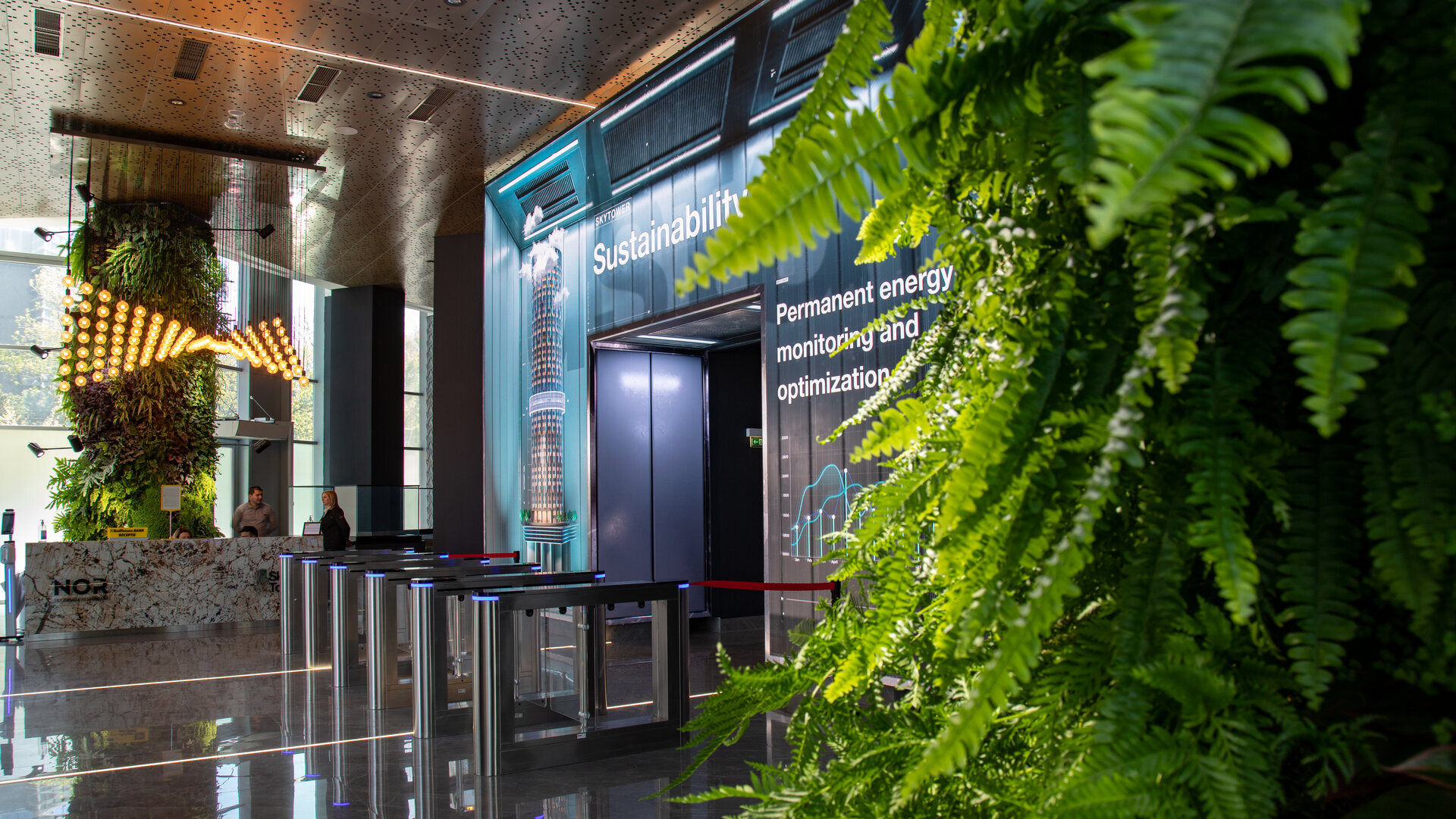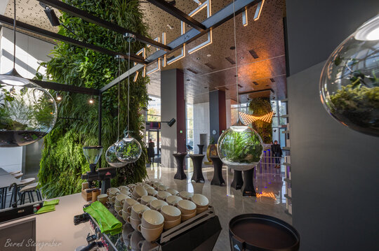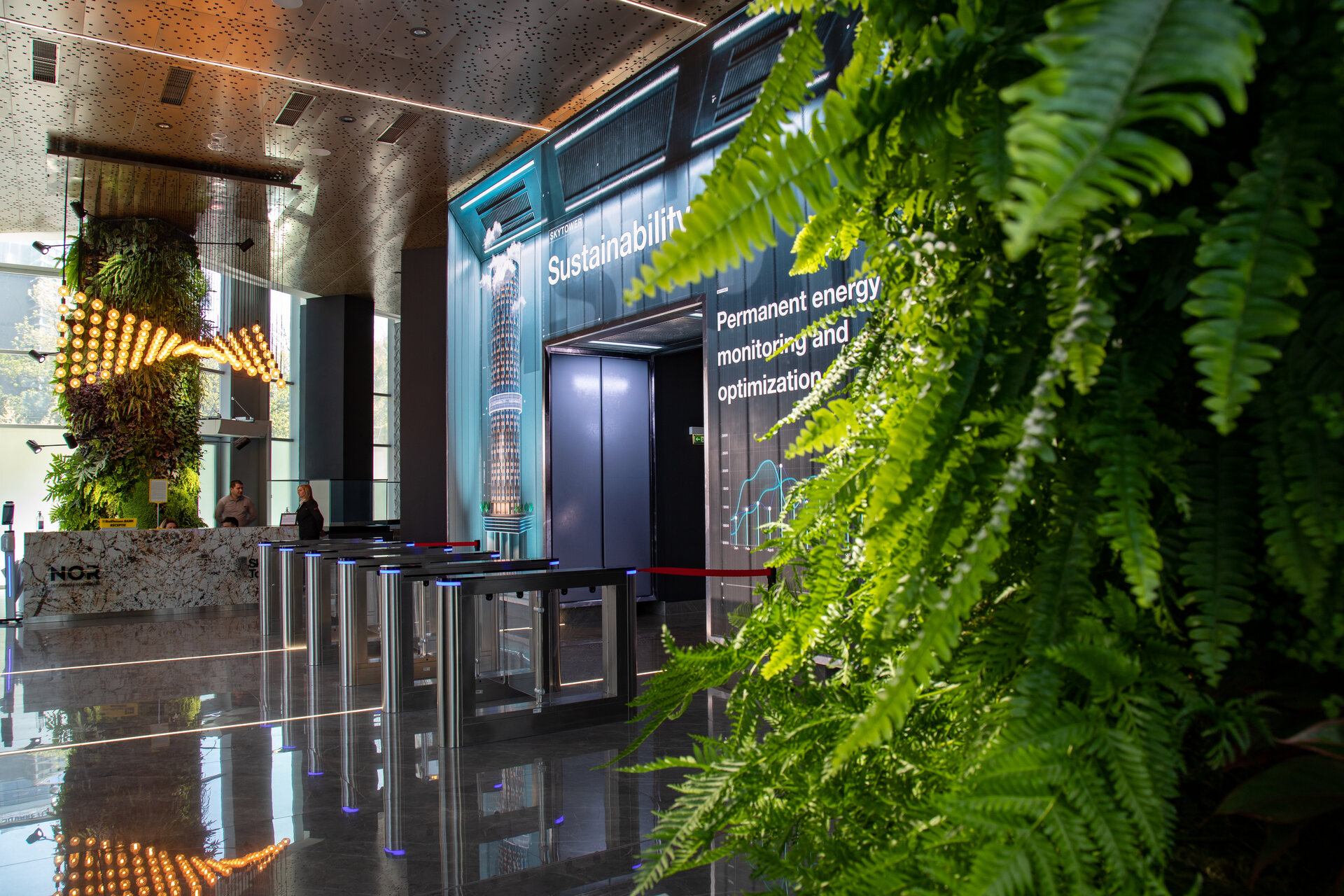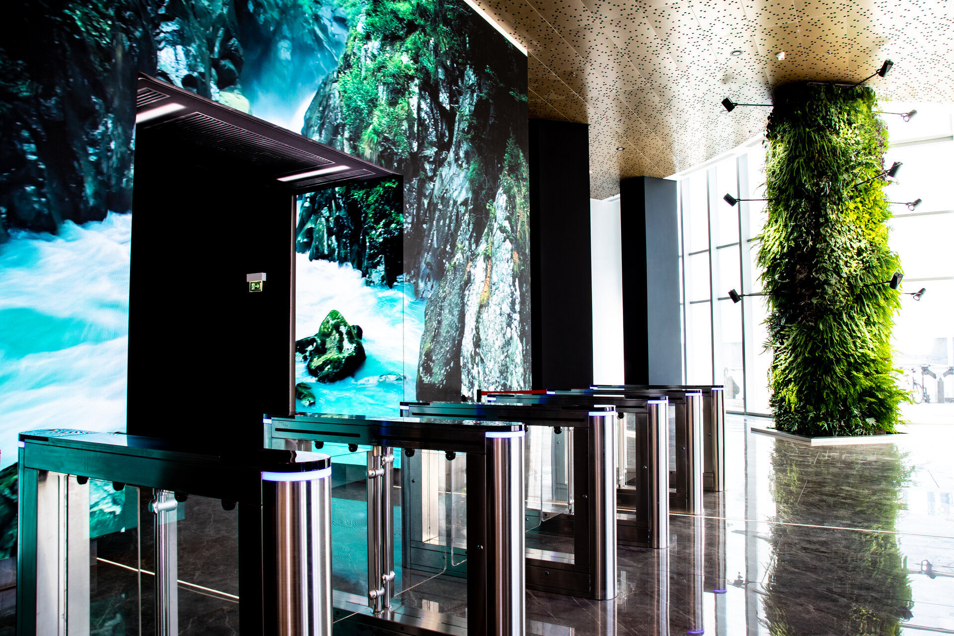 Încă de la început lobby-ul a beneficiat de existența a doi stâlpi verzi - practic două pile cu o înălțime de 6m care au găzduit o "pădure de verdeață". Din păcate, amplasarea deficitară a acestora în zona curenților de aer și a lipsei de lumină suficientă au dus în timp la uscarea lor parțială. Astfel, în urma experienței dobândite, cei doi stâlpi verzi au fost relocați în zone mai favorabile păstrând conceptul inițial.