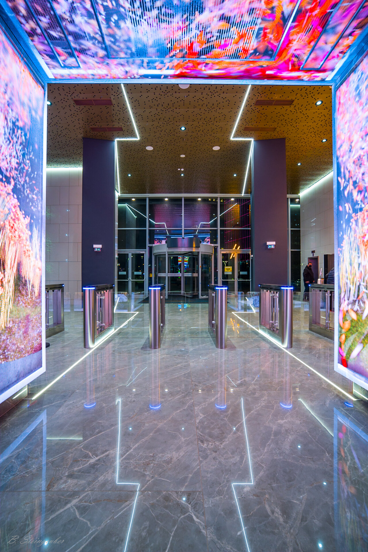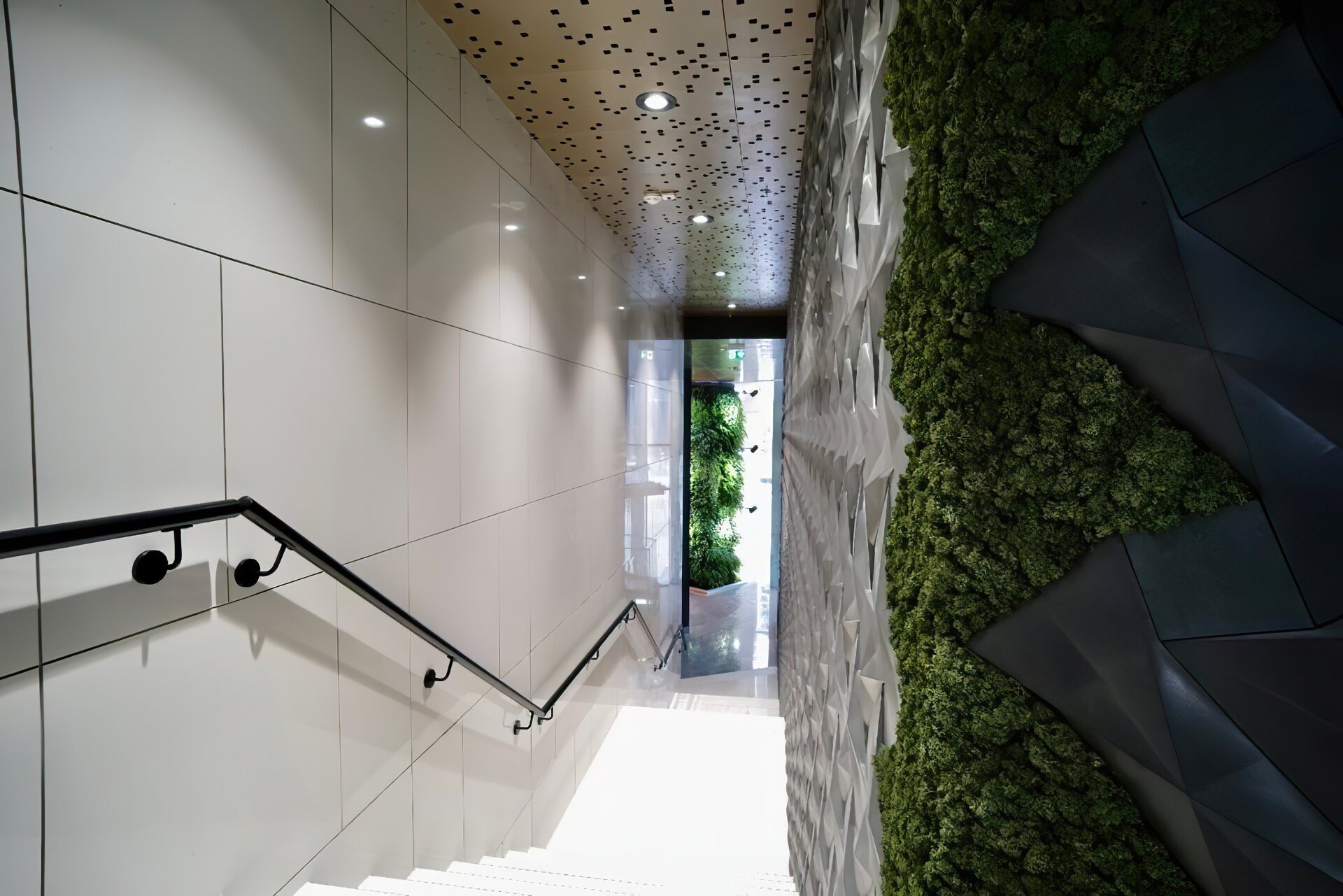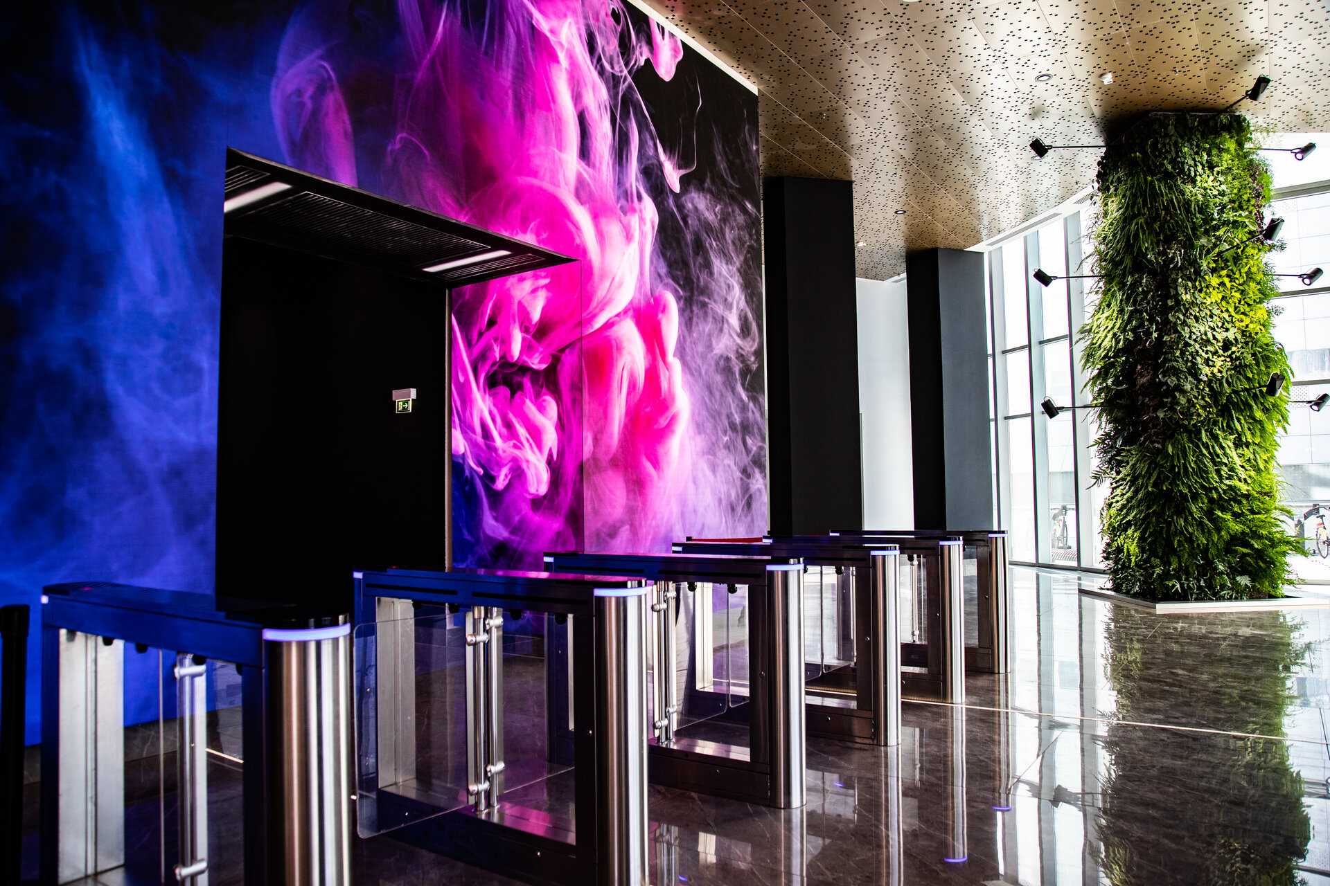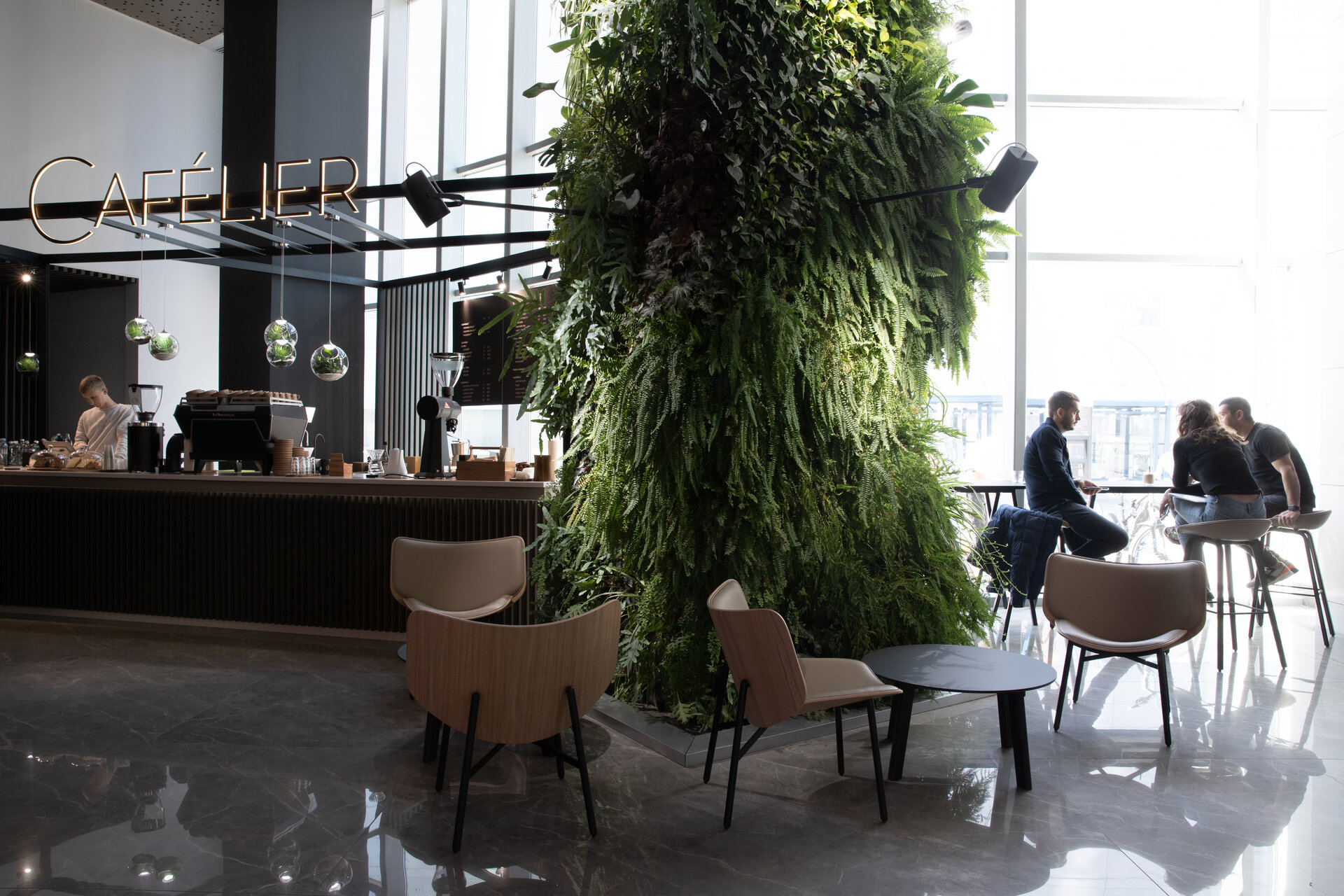 Încă de la început lobby-ul a beneficiat de existența a doi stâlpi verzi - practic două pile cu o înălțime de 6m care au găzduit o "pădure de verdeață". Din păcate, amplasarea deficitară a acestora în zona curenților de aer și a lipsei de lumină suficientă au dus în timp la uscarea lor parțială. Astfel, în urma experienței dobândite, cei doi stâlpi verzi au fost relocați în zone mai favorabile păstrând conceptul inițial.